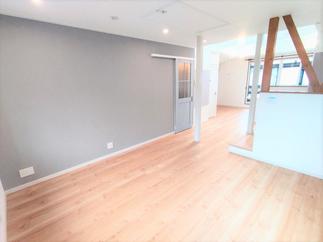 ヌックを挟んだ広いリビング。グレーのアクセントクロスで部屋全体の雰囲気を、スタイリッシュでありながら明るい印象に。全体的にホワイトで統一されているため、木目が映える落ち着いた空間に仕上がりました。床が広くてお子様ものびのびと過ごせます。フローリング:LIXILラシッサDフロア メープルアウトセット引戸:LIXILラシッサDパレットLGHデザイン ブルーペイント
