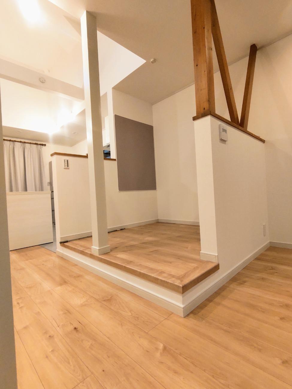 キッチン横にヌックスペースを設け、お子様の遊び部屋に。マグネットボードを取付けてあるのでお子様が描いた絵やお気に入りの写真を貼ったりできます。一つの段差で空間の可能性は広がります。空間にゆとりがうまれ、目線や動線も大きく変わります。家族との一体感、独立性など楽しくてうれしいメリットがいっぱいです。お子様の成長後は家事スペースやワーキングスペースとしても使えます。マグネットボード:LIXILアクセントボード ソフトモーブ色