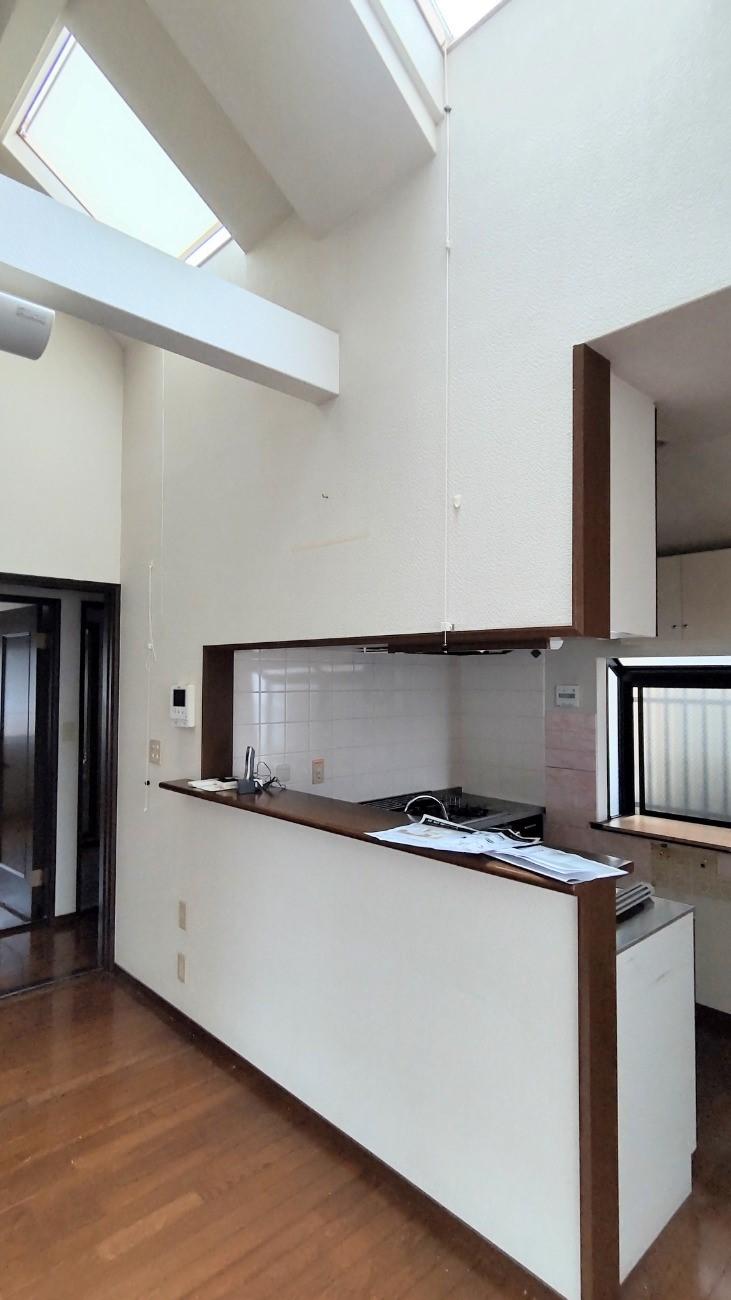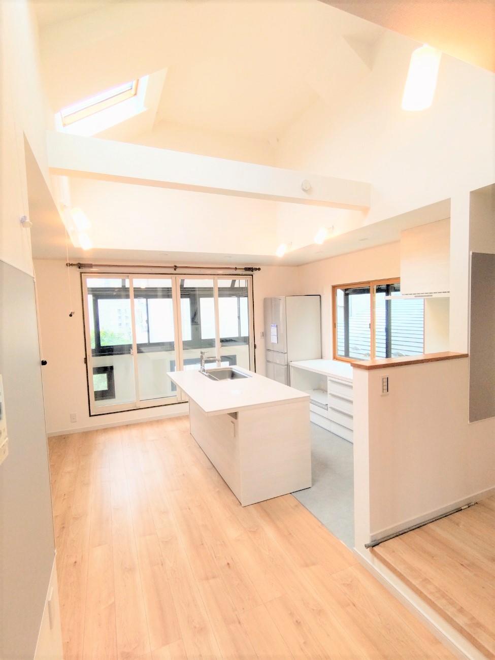 元々のキッチンスペースの垂れ壁を撤去しダイニングに、キッチンのレイアウトを変更して対面式の開放的で明るいLDK空間になりました。天窓から差し込む光がとても気持ちがいいです。お子様とのクッキングタイムがより一層楽しくなります。暮らしの真ん中にあるキッチンは、作ることも含めて家族みんなが楽しめる空間に。料理をしながら家族との会話を楽しめます。