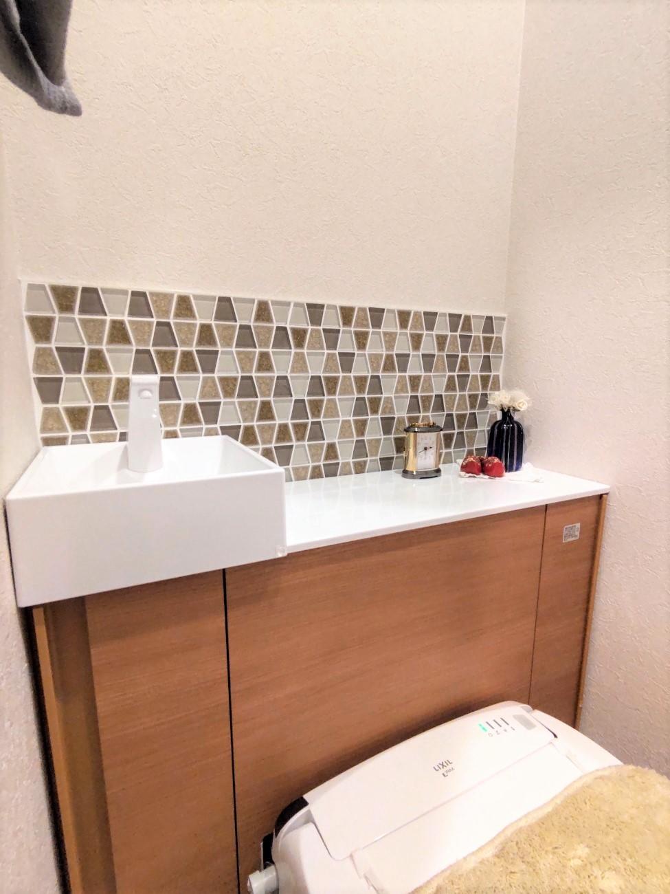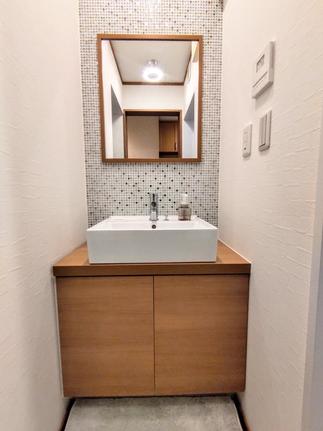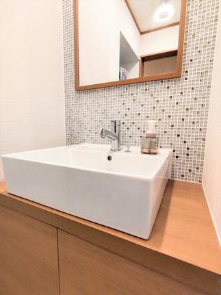 洗面はベッセルタイプの洗面台とガラスの透明な輝きとゴールド・シルバーの硬質な輝きをミックスしたガラスモザイクタイルを貼り、キラキラと華やかな空間に仕上がりました。