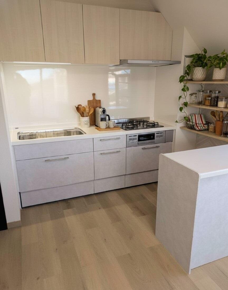 扉カラーはキッチン本体にWL2:ホワイトスタッコ、吊り戸棚にIM2:ブリーチドウッドをセレクト。