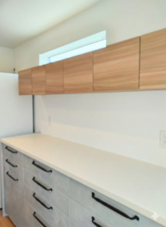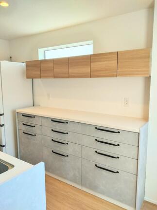キャビネットカラー:ナチュラルウッド(上部)上部キャビネットには温かみのある木目調をセレクト。グレーの洗練された印象に、木のやさしさを重ねることで、北欧らしい柔らかさをプラスしました。「隠す収納」で生活感を整えながらも、素材感で魅せる。機能性とデザイン性をバランスよく取り入れています。