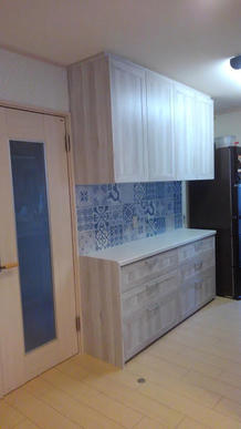 タイルが主役のキッチン収納リフォーム。収納力も大幅アップ!LIXILリシェルSIカップボード、LIXILインテリアタイル エテルネ フォーム