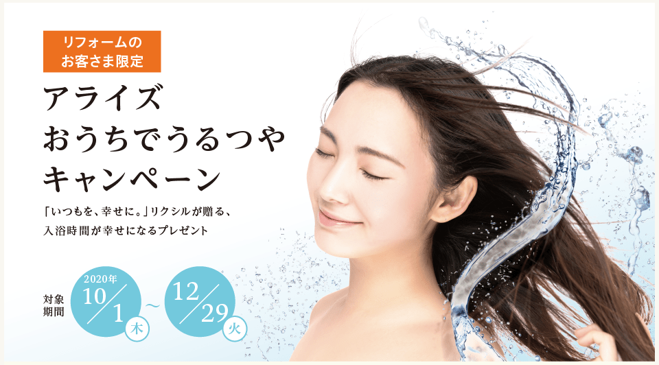 LIXIL システムバス:アライズ Zタイプをリフォームでご成約いただいた方全員に「うるつや浄水」プレゼント!「うるつや浄水」は、子供から大人まで、家族みんながうれしい、脱塩素のやさしいシャワーです!人がお風呂に求める"心地いい"という瞬間のために進化したバスルーム、アライズ。ぜひこの機会に特別な時間へと変わるアライズ浴室リフォームをご検討ください。お問い合わせはお気軽にSHOEI西荻店までお待ちしております!