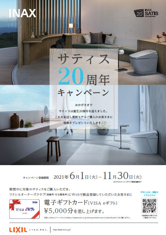 LIXILのトイレ「サティス」が20周年を迎えました。これを記念してお得なキャンペーンのご案内です!