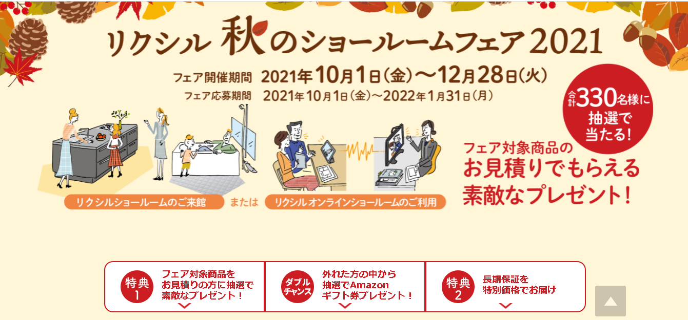 一覧へ戻るフェアは、2021年12月28日(火)まで開催中でございます!フェア対象商品をリクシルショールームまたはリクシルオンラインショールームにてお見積りいただいたお客様に、抽選で素敵なプレゼントを差し上げます。ぜひこの機会にリフォームをご検討ください!