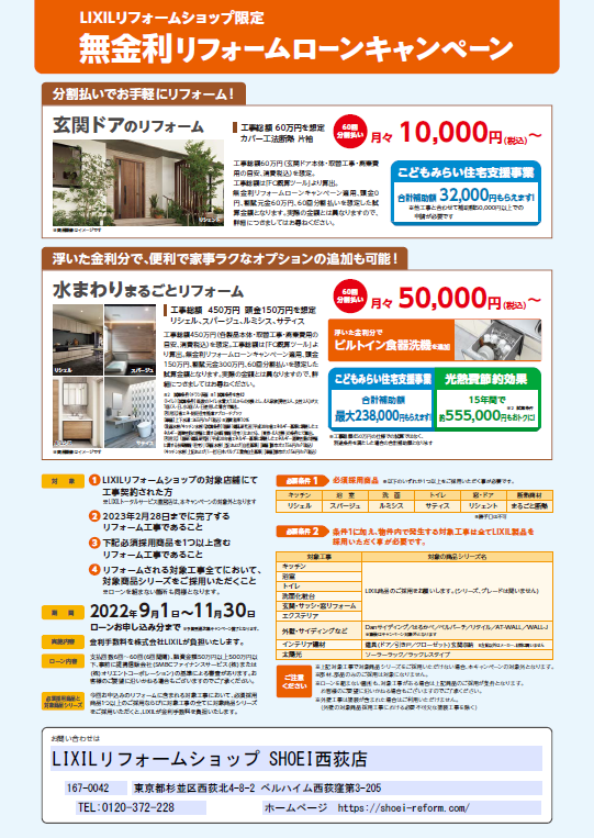 一覧へ戻る9月より実施しております「LIXIL 無金利リフォームローンキャンペーン2022」がご好評につき、キャンペーン申込期間が12月31日まで期間延長になりました!