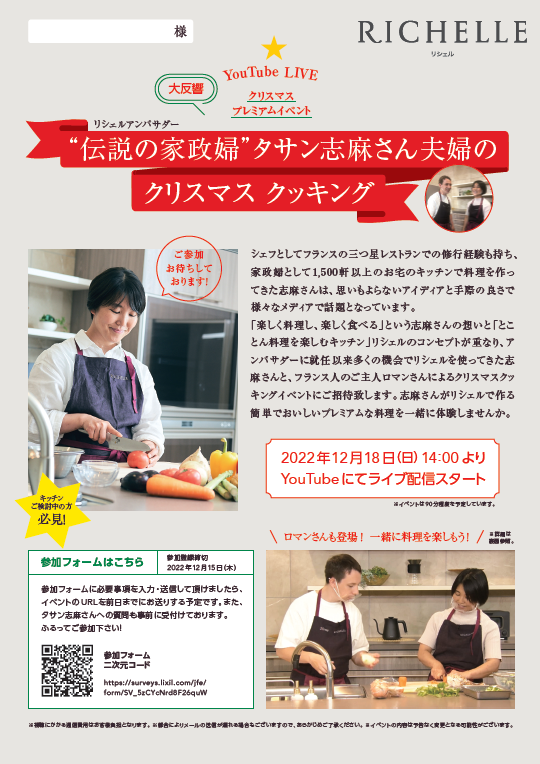 「楽しく料理し、楽しく食べる」という志麻さんの想いと「とことん料理を楽しむキッチン」リシェルのコンセプトと重なり、アンバサダーに就任以来多くの機会でリシェルを使ってきた志麻さんと、フランス人のご主人ロマンさんによるクリスマスクッキングイベントにご招待いたします!