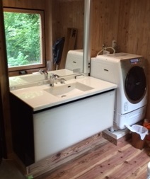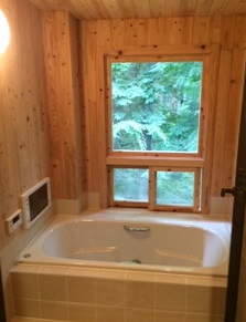 特殊加工を施したヒノキ材をふんだんに使用し、スタイリッシュなLIXIL浴槽・洗面台を選択されたことで別荘のような浴室空間に。
