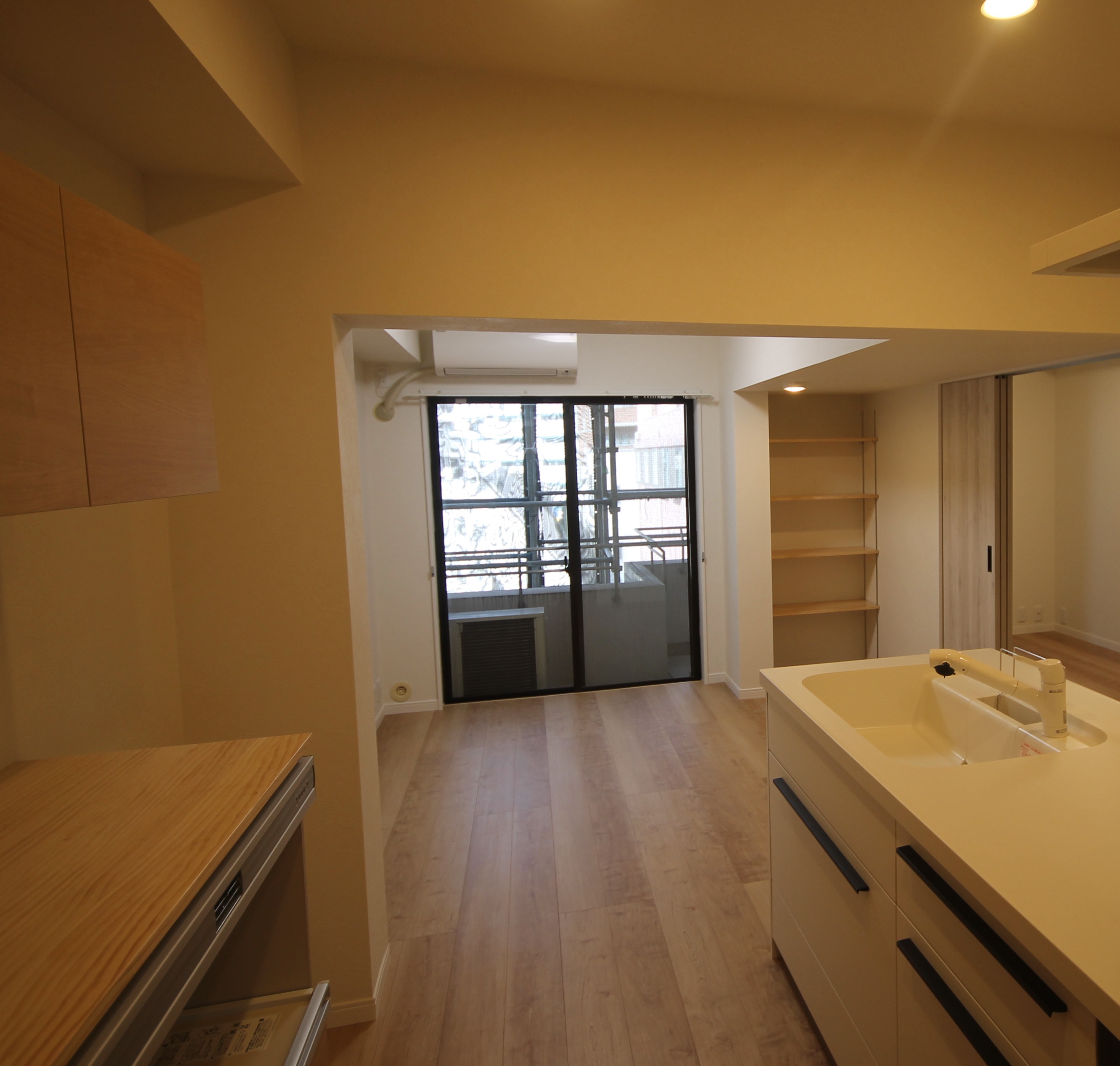 マンション全面リノベーションです。間取変更、キッチン移設、住設取替えのすべてを盛り込んだ新築二世です。
