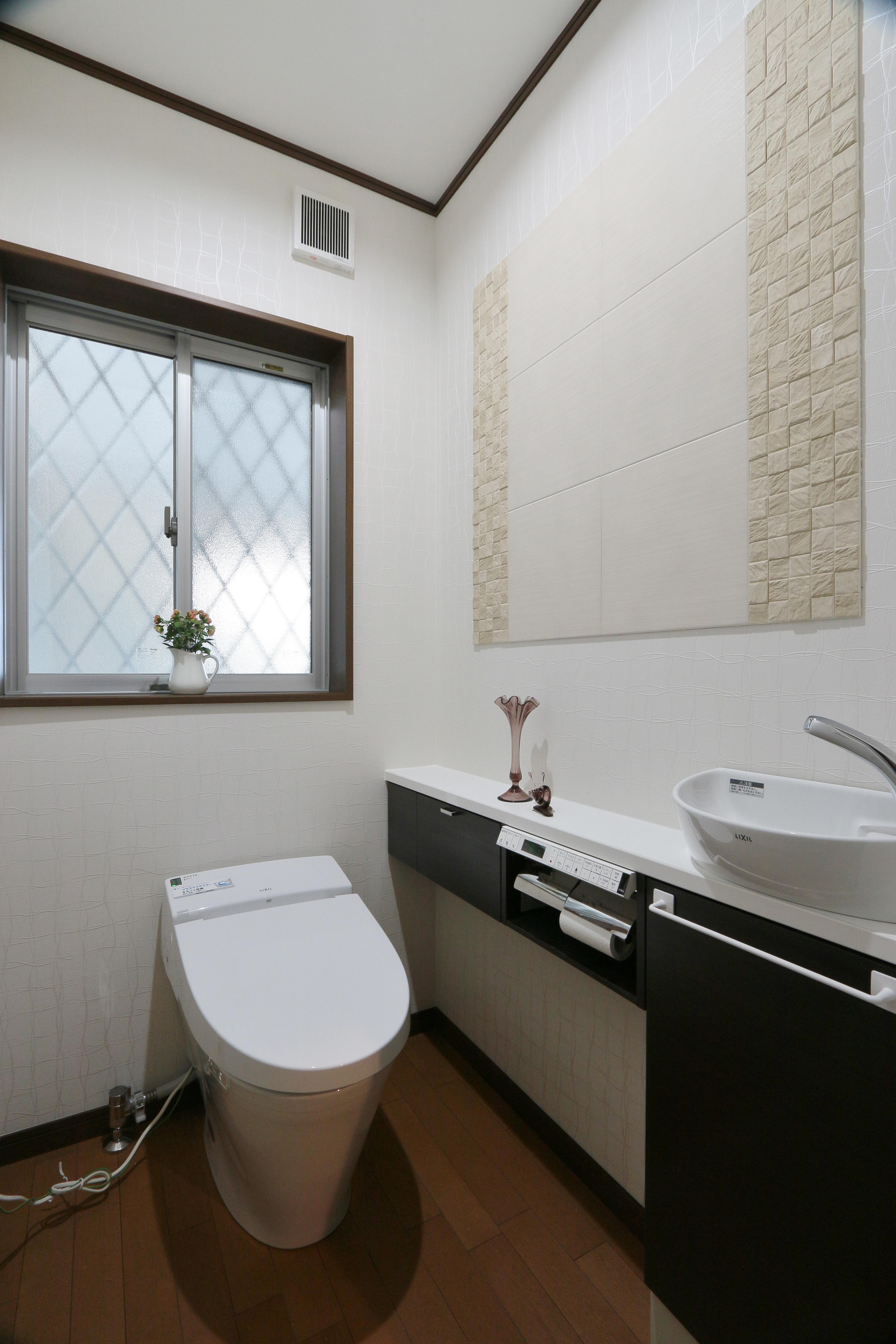 窓が大きくなり以前より明るい空間になりました。また手洗いキャビネット『コフレル』クリエダーク色がキリッと空間をしめています。壁には『エコカラット』を設置しました。消臭効果・調湿効果のある『エコカラット』でおしゃれ、かつ快適な空間になりました。
