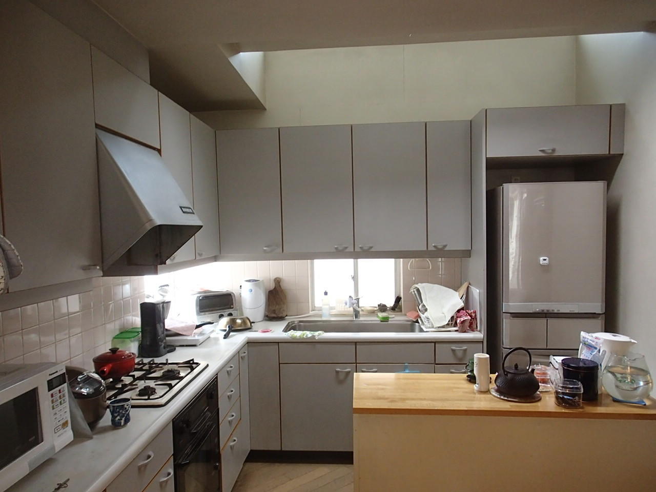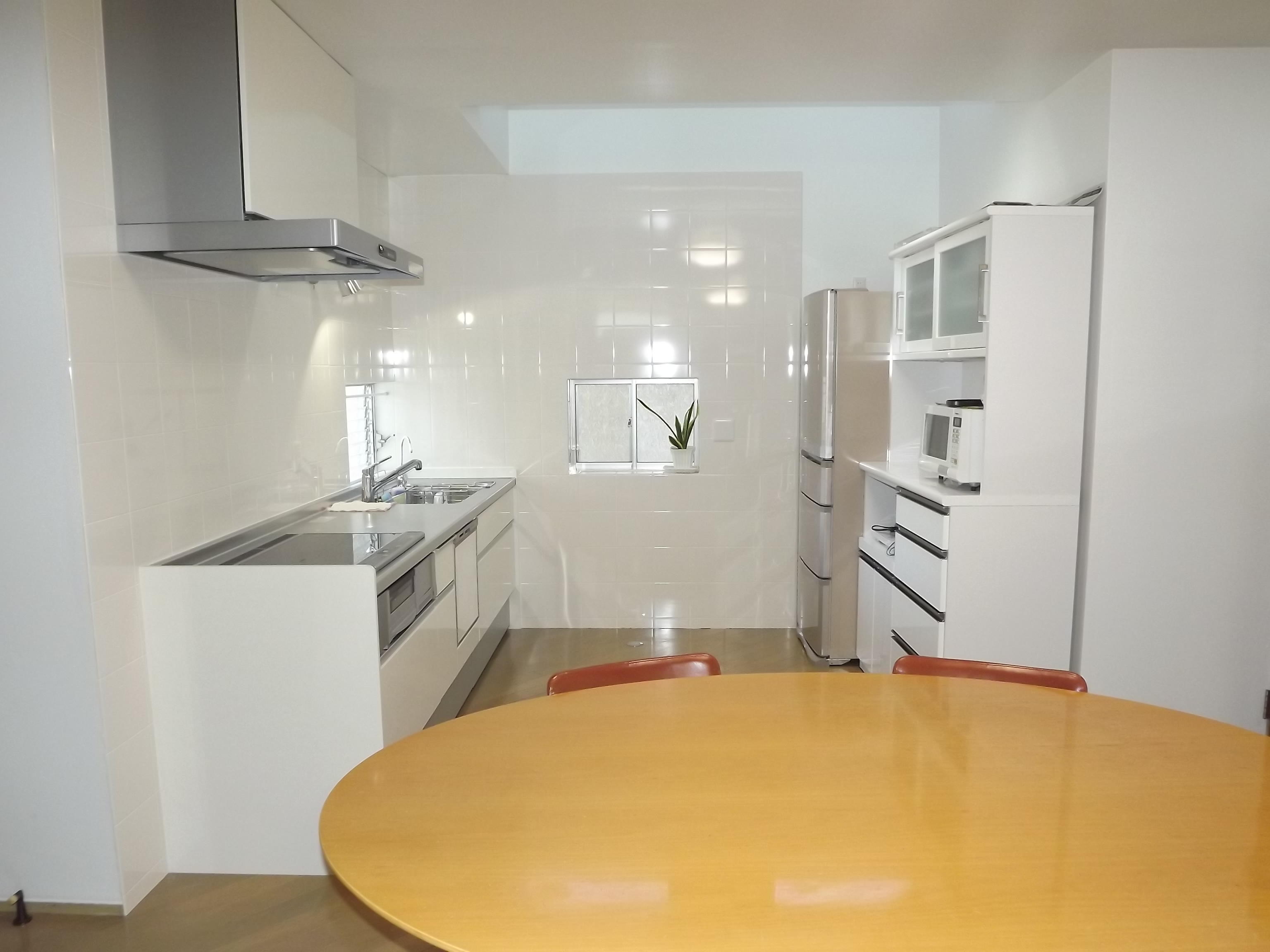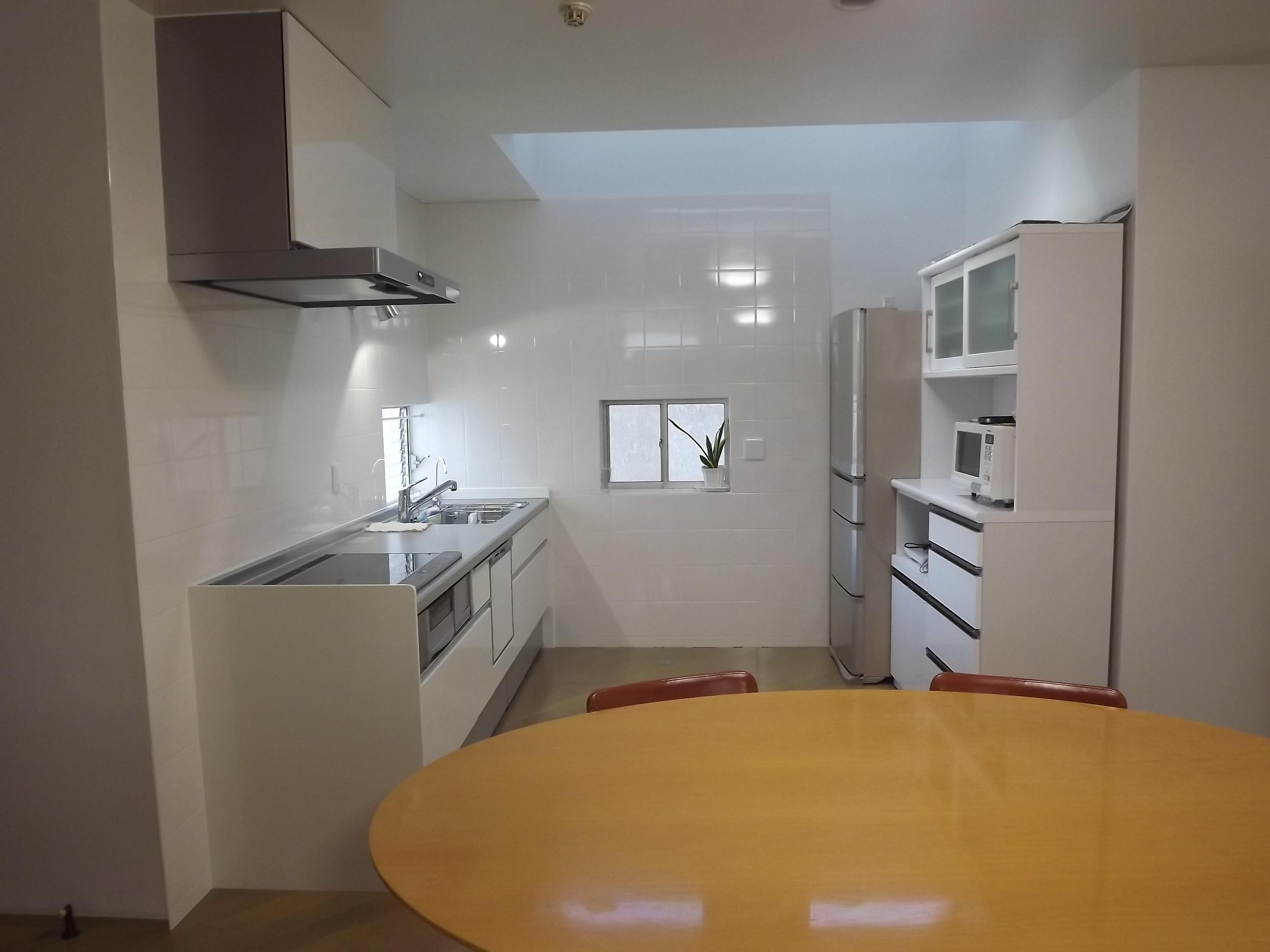 圧迫感のあった収納棚を撤去し、奥様こだわりの真っ白なタイルを貼りました! 統一感のあるシンプルなキッチンに、手元を照らすライトがシャープで個性的で素敵です♪ また仕切りを撤去したので、空間がとても広くなりました。壁は塗装仕上げ!真っ白でとても清潔感のある空間が広がりました。