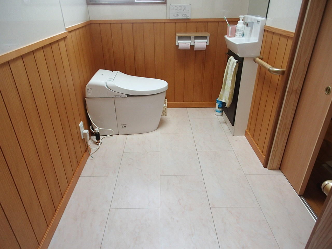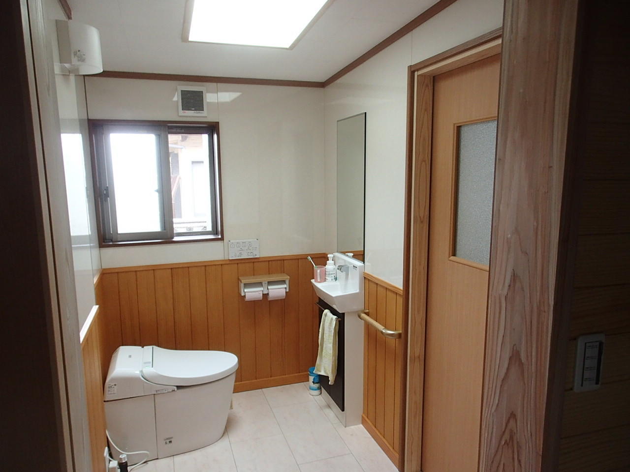 大切なご両親のために介護用トイレスペースを中庭部分だったところに増築しました。 少しでも明るい空間にしたいということでトップライトを設置しました。 またクロスが苦手と言われていたので腰板とキッチンパネルで壁を施工しました。車いすの動線を考えながら少しでも空間を広げるためにひと工夫施しました。ご両親も笑顔で過ごせる空間が完成しました。