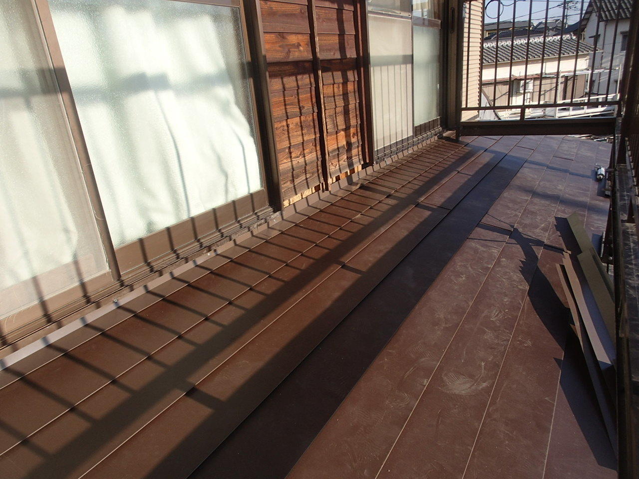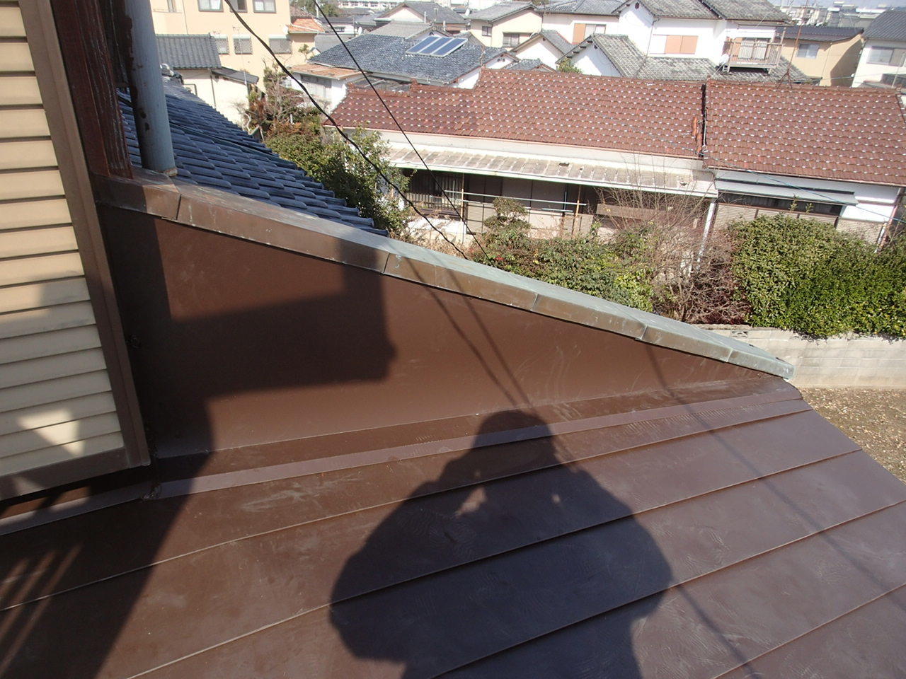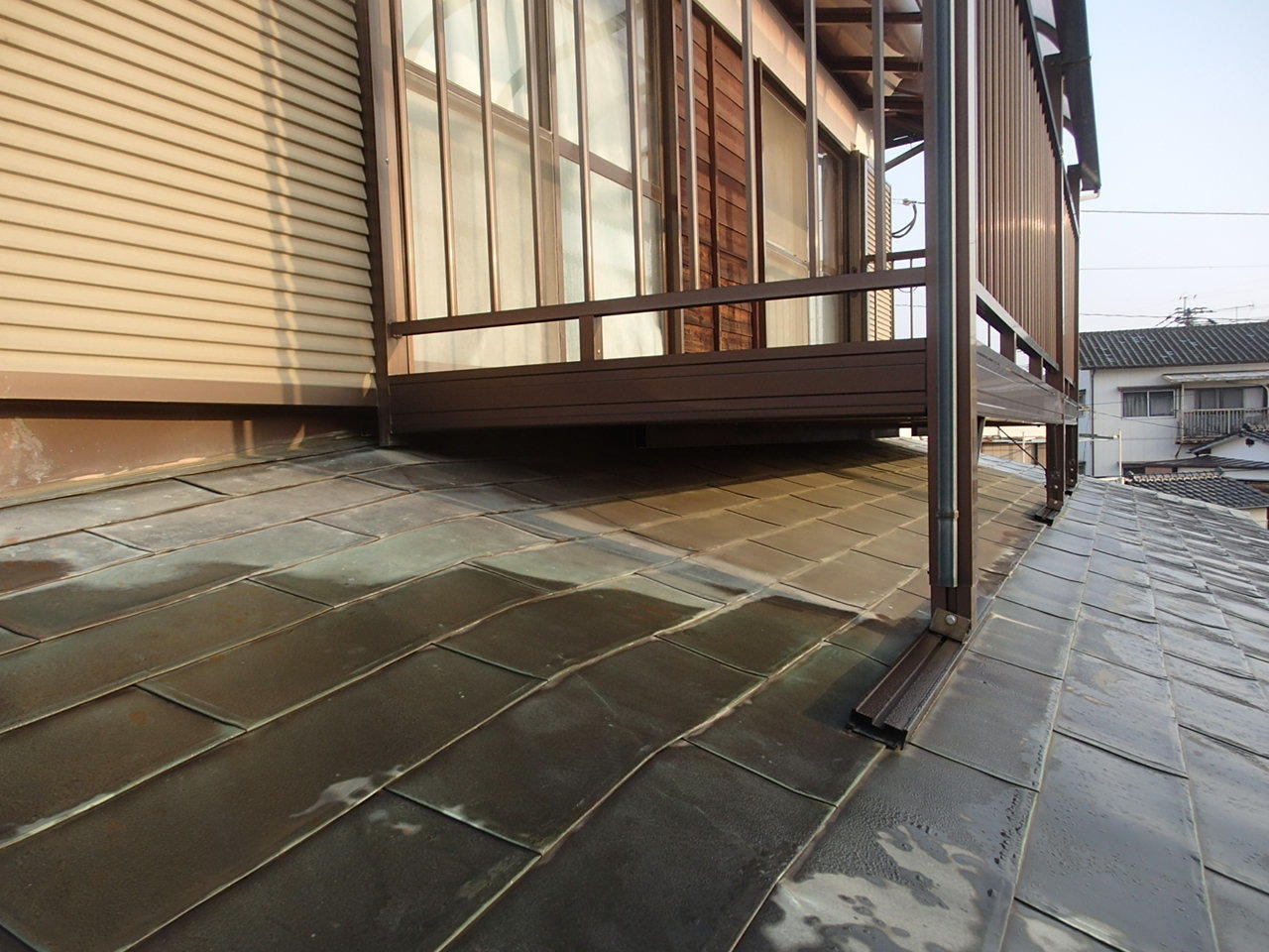 板金屋根の劣化による雨漏り解消のために葺き替え工事を行いました。 雨漏りにより腐食した野地板を取替えてルーフィング(防水シート)を敷き、新しい板金屋根を葺き替えました。 板金屋根の劣化による雨漏りはジワジワと染み出てくる雨漏りが多いです。 耐用年数は15年~20年とされています。 時期が過ぎておられる方は一度調査依頼をお勧めします。