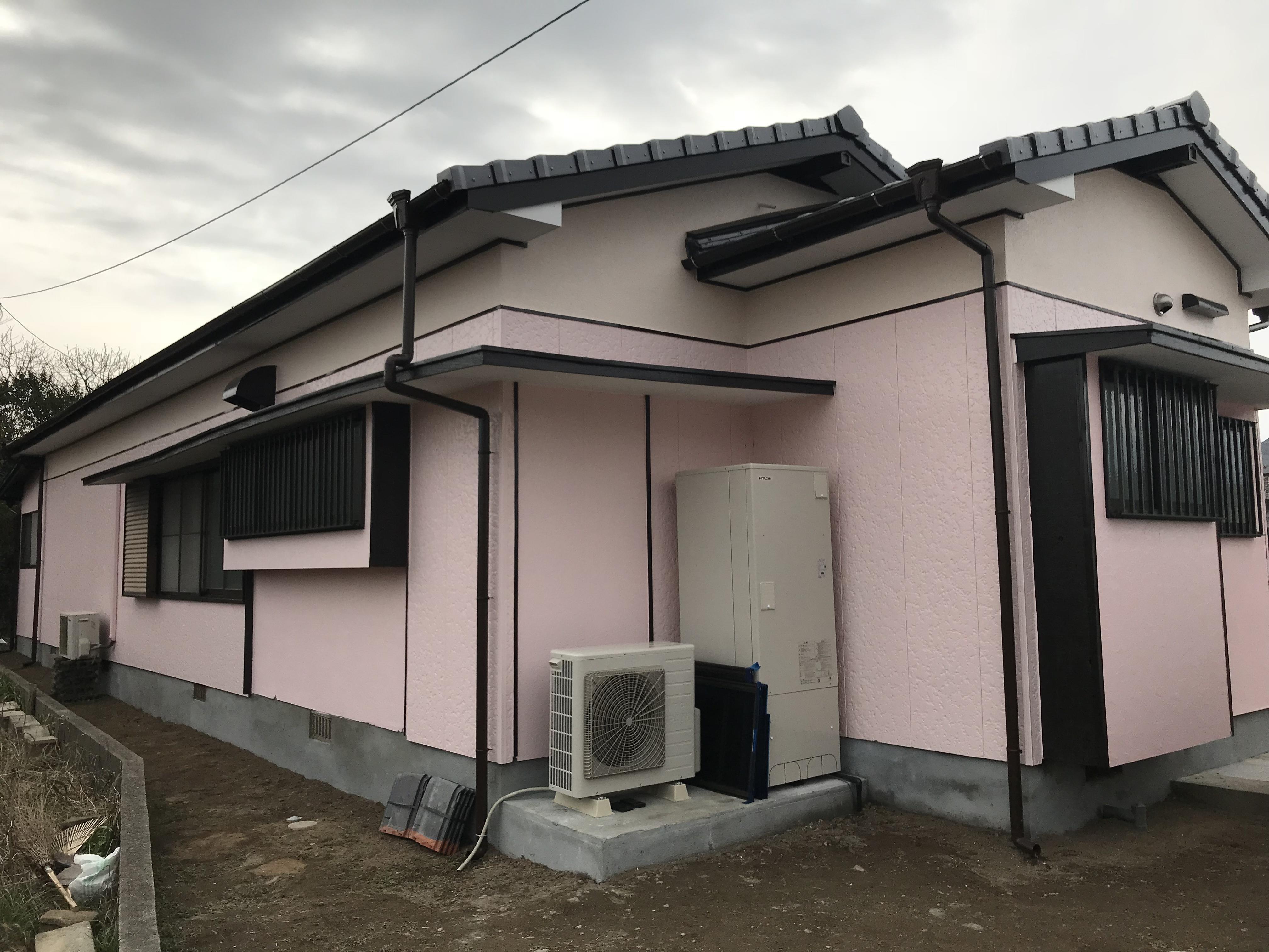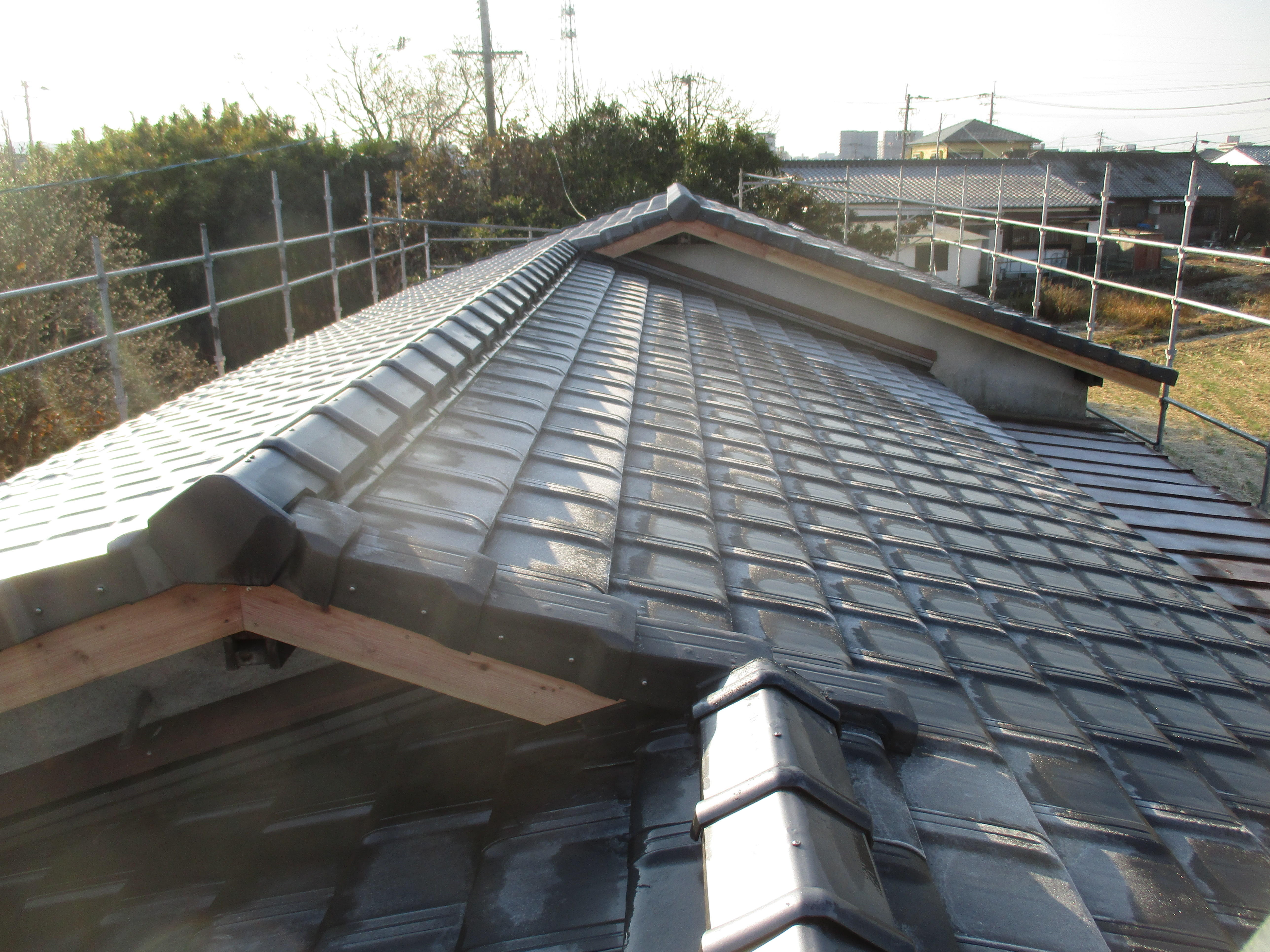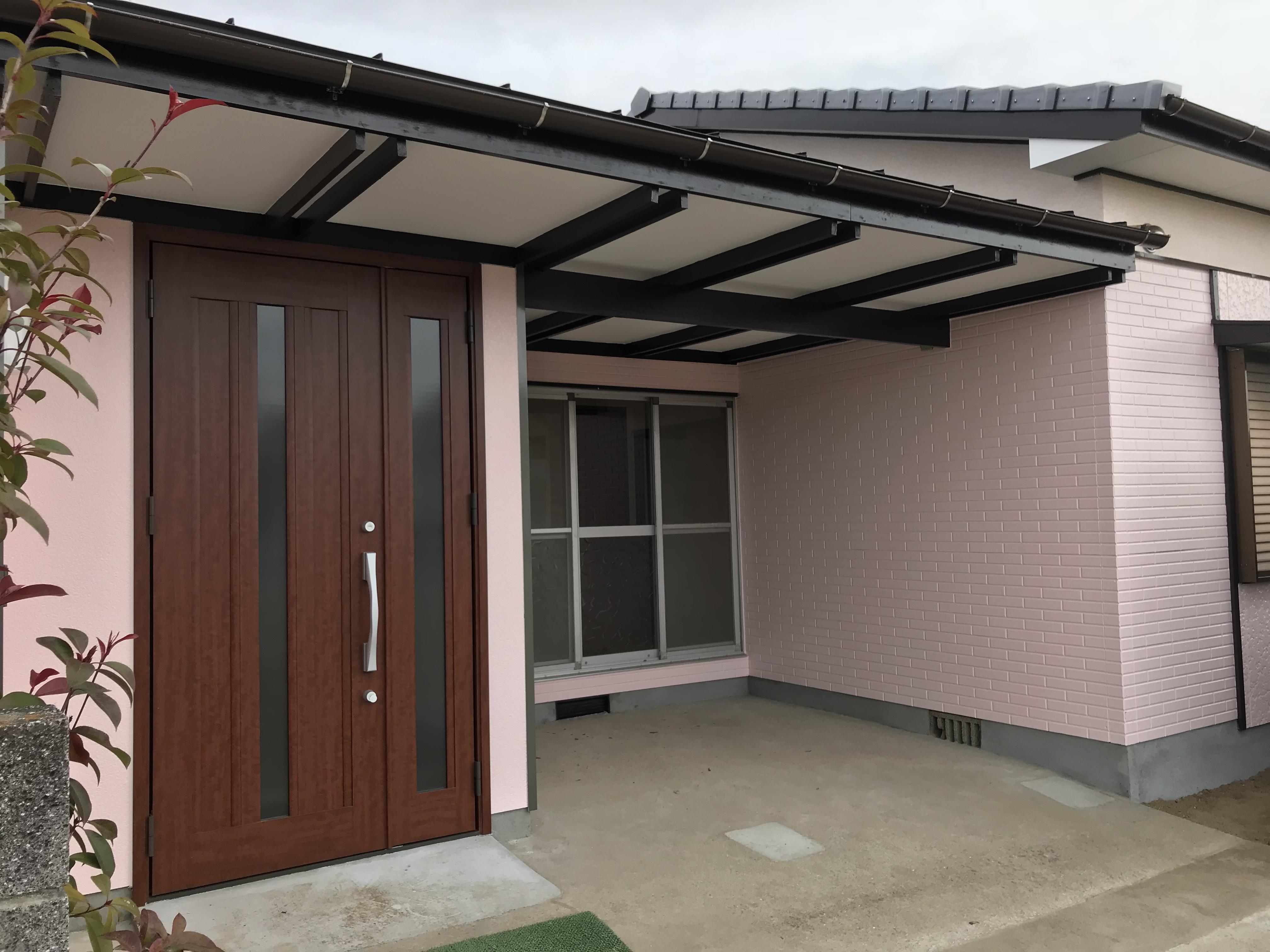 屋根瓦を陶器瓦へ葺き替えました。 銀鱗色でとても気品ある格調高い雰囲気になりました。 外壁塗装は淡いピンクへと塗替えました。 破風板や樋をこげ茶で仕上げたことで甘すぎず上品にまとまりました。 玄関も新しくされて、雰囲気が一新されましたね!