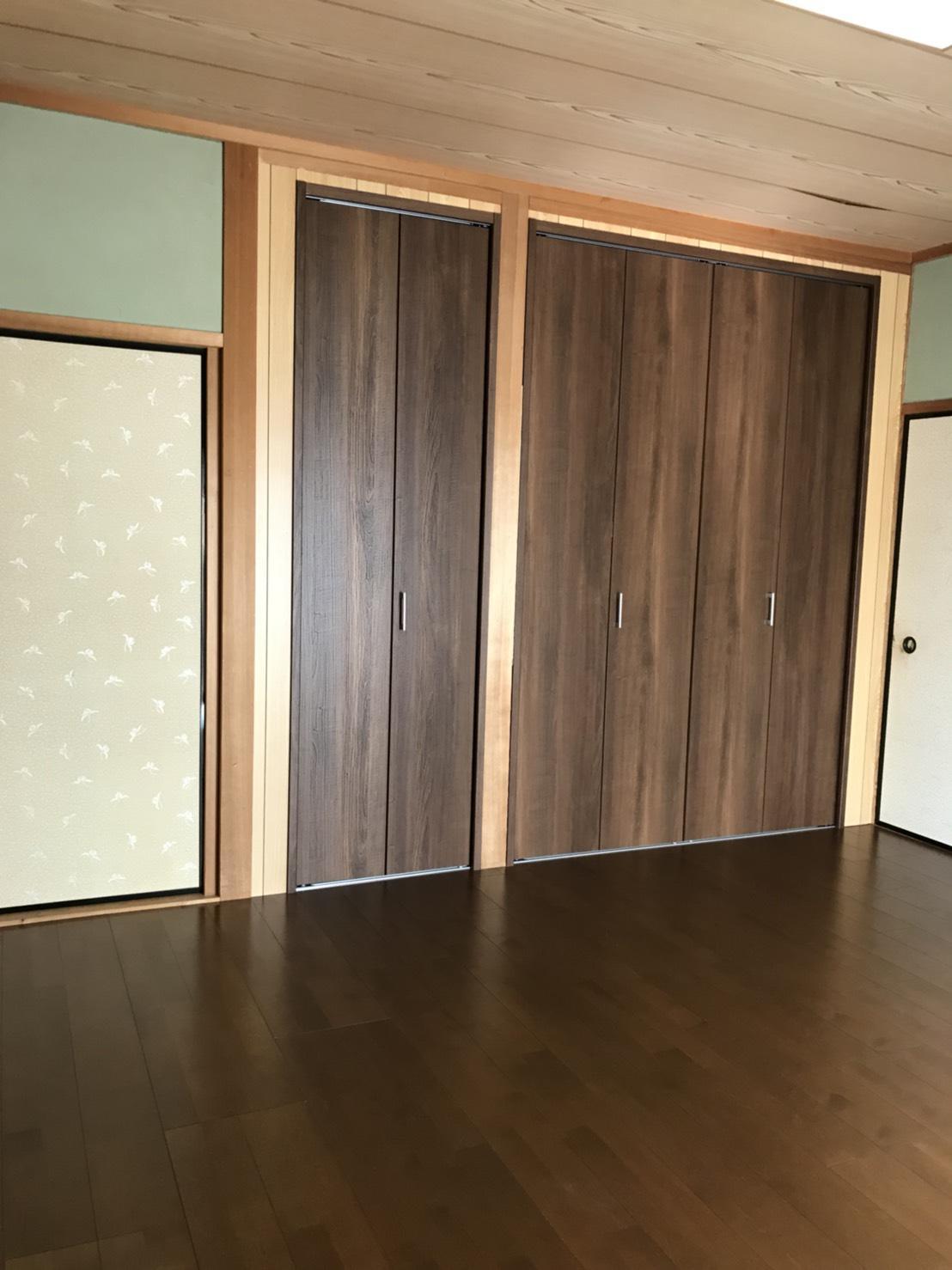 和室を洋室へ改修しました。 せっかく洋室へ改修するなら 押入れもクローゼットにということで改修しました。 濃いめのフローリングと建具が和の空間をキュッと引き締めてくれています。