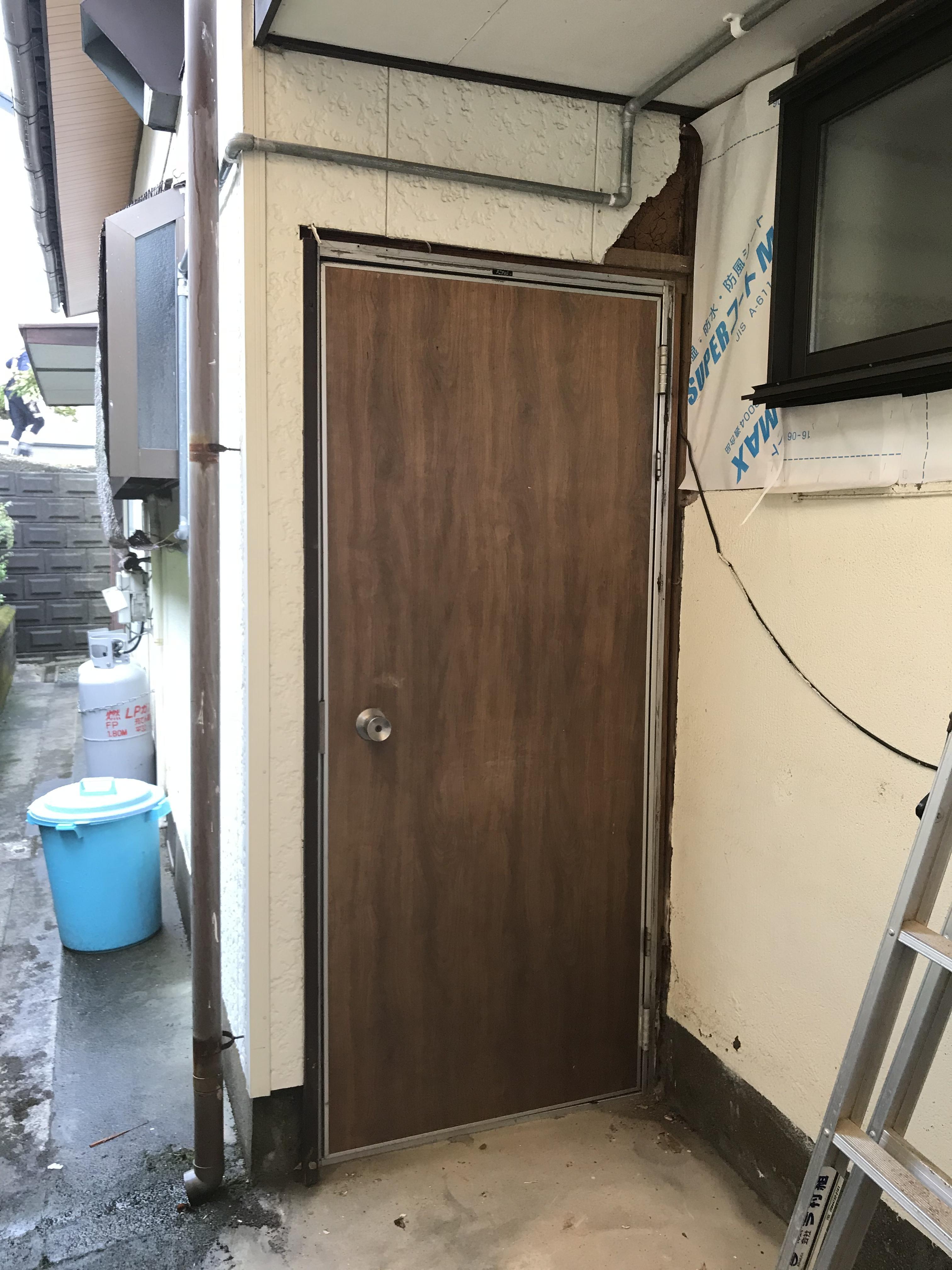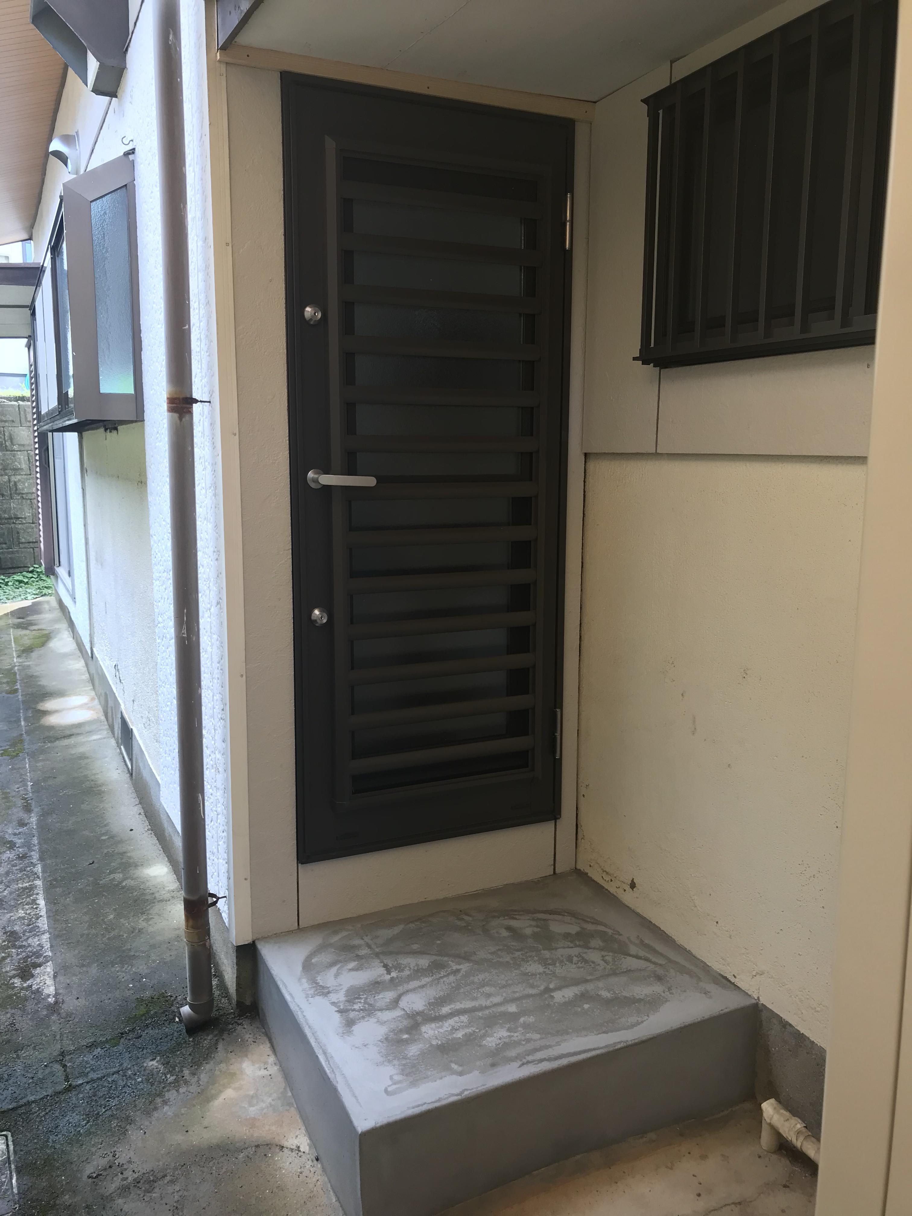 勝手口ドアを交換しました。 以前は内側に土間があったのですが、部屋が狭くなるのでドアの高さを変更し 外に踏み段を作りました。 採風ドアの為 鍵を閉めたまま網戸にでき防犯対策になり 安心してお家の風通しができますね。