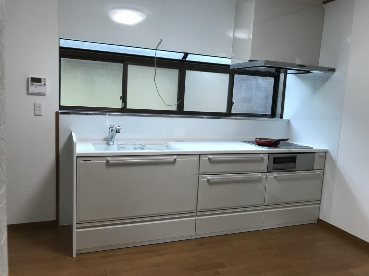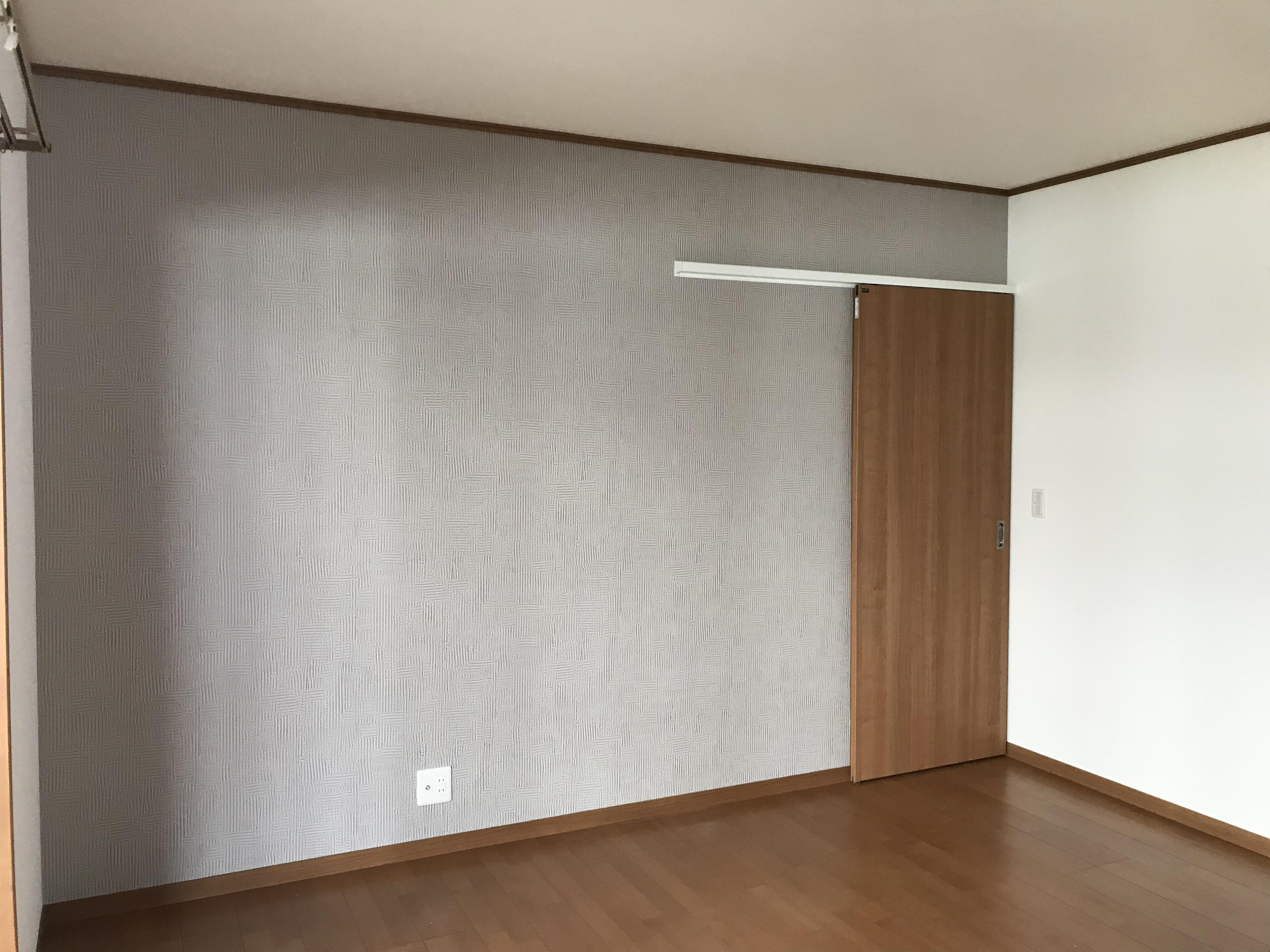 元々は二部屋の間に廊下だった部分を 一つの広い空間にしました。 入り口の壁にアクセントクロスを貼りお洒落な空間に仕上がりました。 キッチンも真っ白で清潔感があり 周りの空間にマッチングしました。