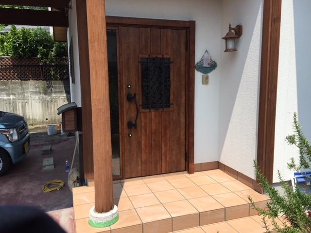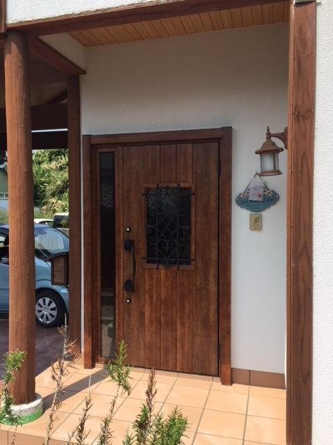 玄関ドアのリシェント工事をさせていただきました。 玄関ドアのガラス部分が広くなり より光を取り込めて明るくなりました。 別のお宅にお邪魔しているかのようです。