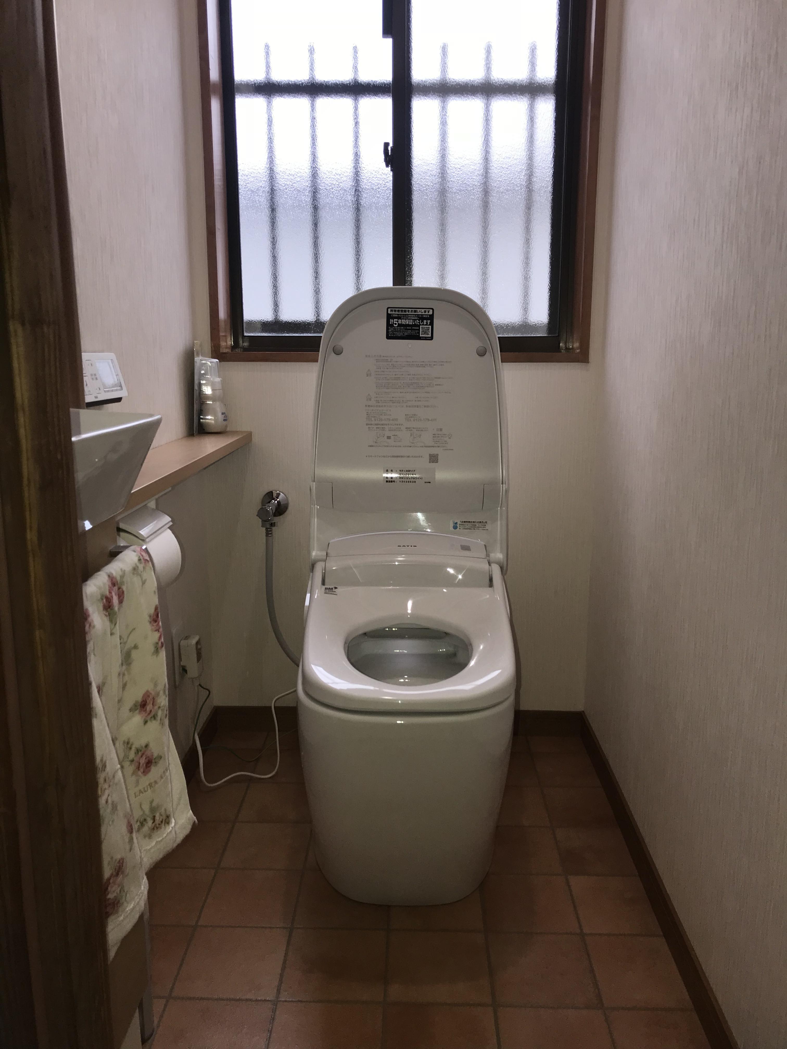 在来のタイルのトイレ お洒落だけど 冬は寒くて冷たい感じがしますね。 最新トイレへ入替をし CBシートとクロスで床・壁・天井を仕上げました。 真っ白な壁・天井が 空間を広く見せてくれますね。