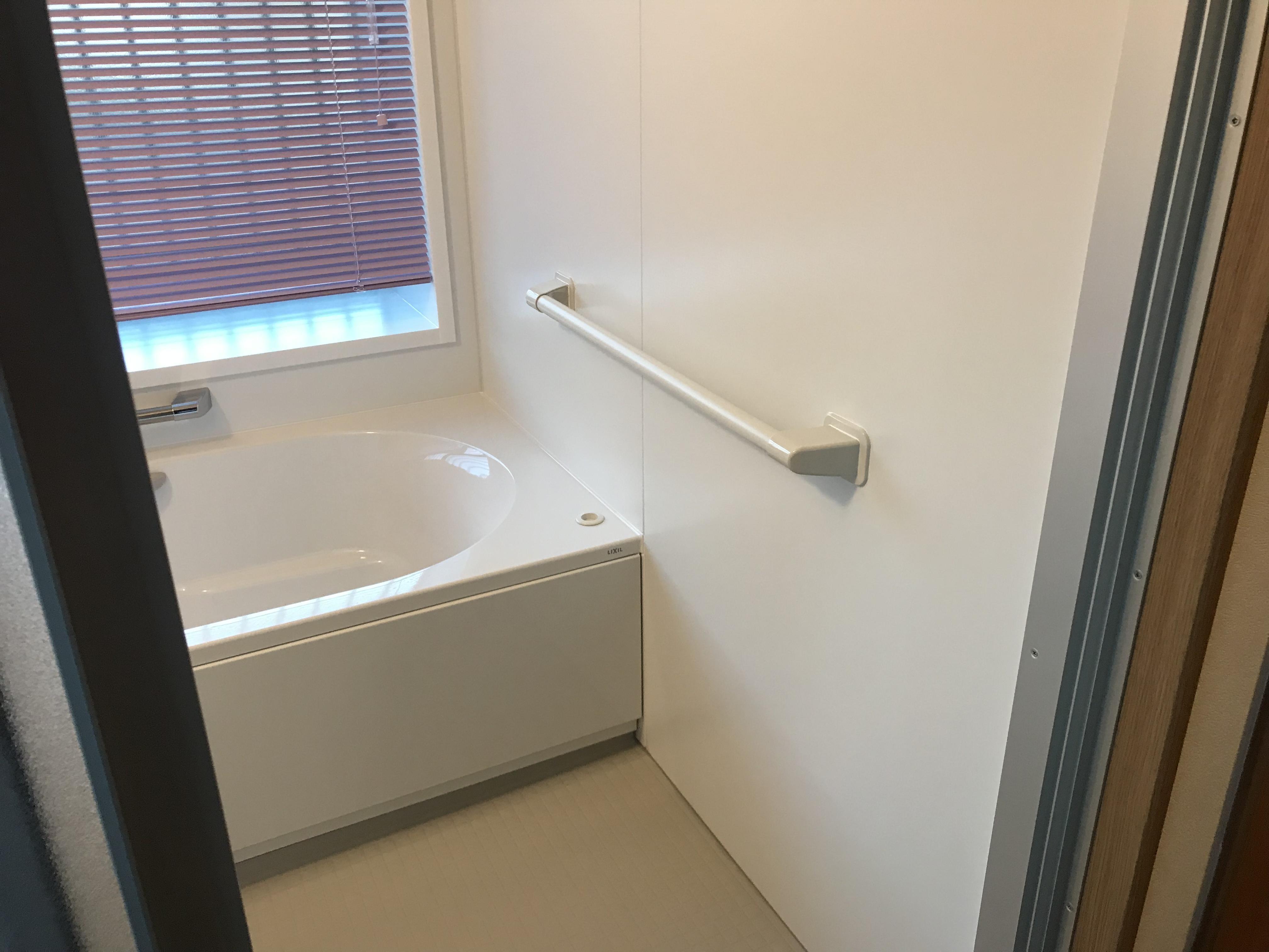 在来浴室からユニットバスへ工事をさせていただきました。 工事が完了し使ってみると ここに手すりが欲しいな・・・と感じられたそうです。そこでユニットバスに後付け手すりを施工しました。吸盤や両面テープでは外れる可能性が高く安心して利用できません。きちんとユニットバスメーカーの後付け手すりの施工をおススメします。