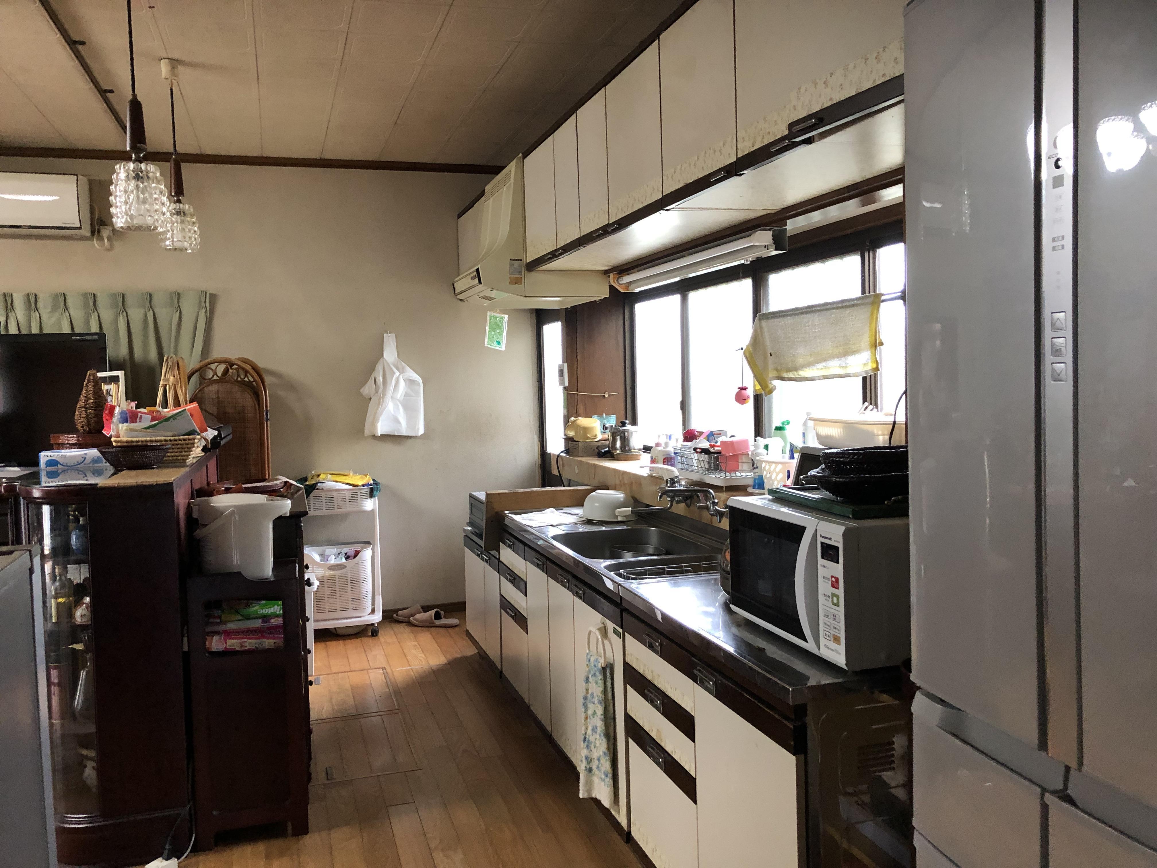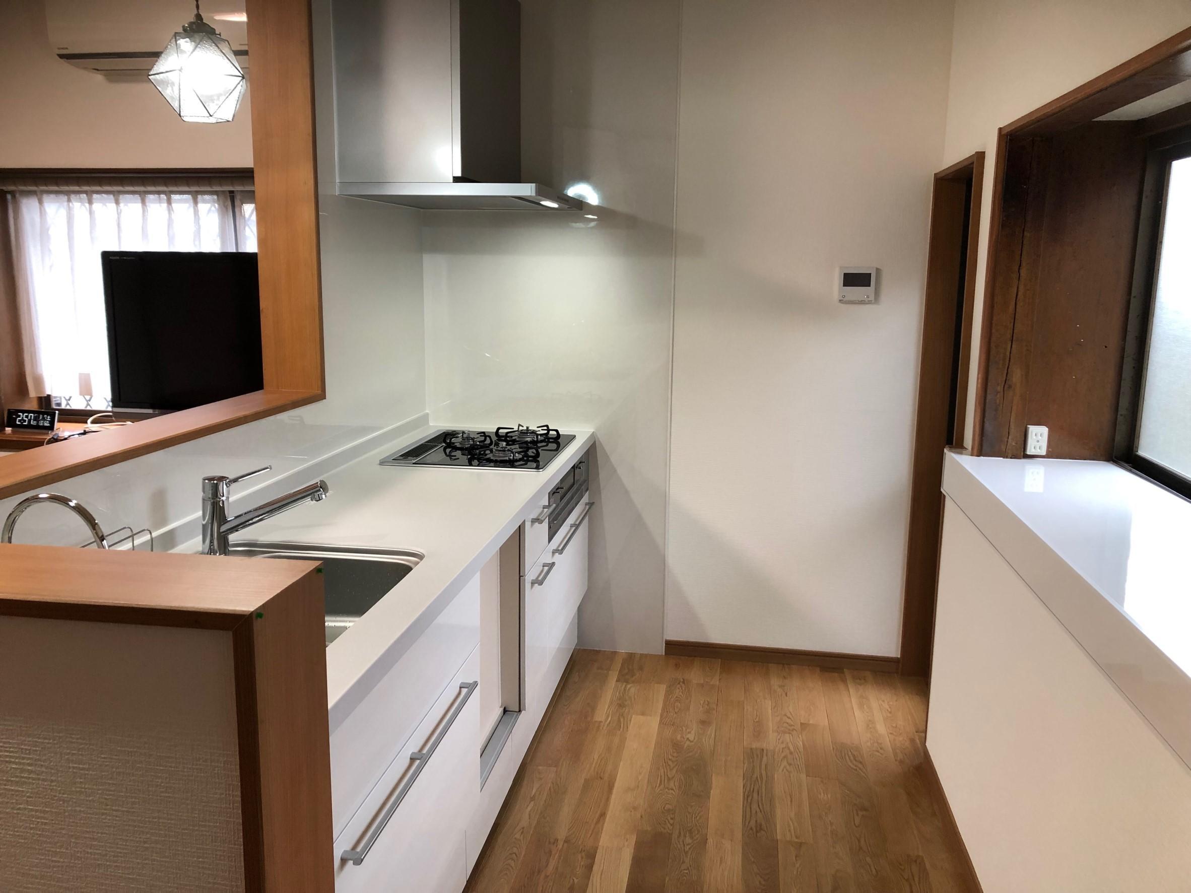 壁付けのキッチンを 対面式のキッチンへ 最新式のキッチンは 機能性・収納力が高く お手入れも簡単! 家族とのおしゃべりを楽しみながら 食事の支度が出来ます。 キッチンに立つのが楽しみになりますね。