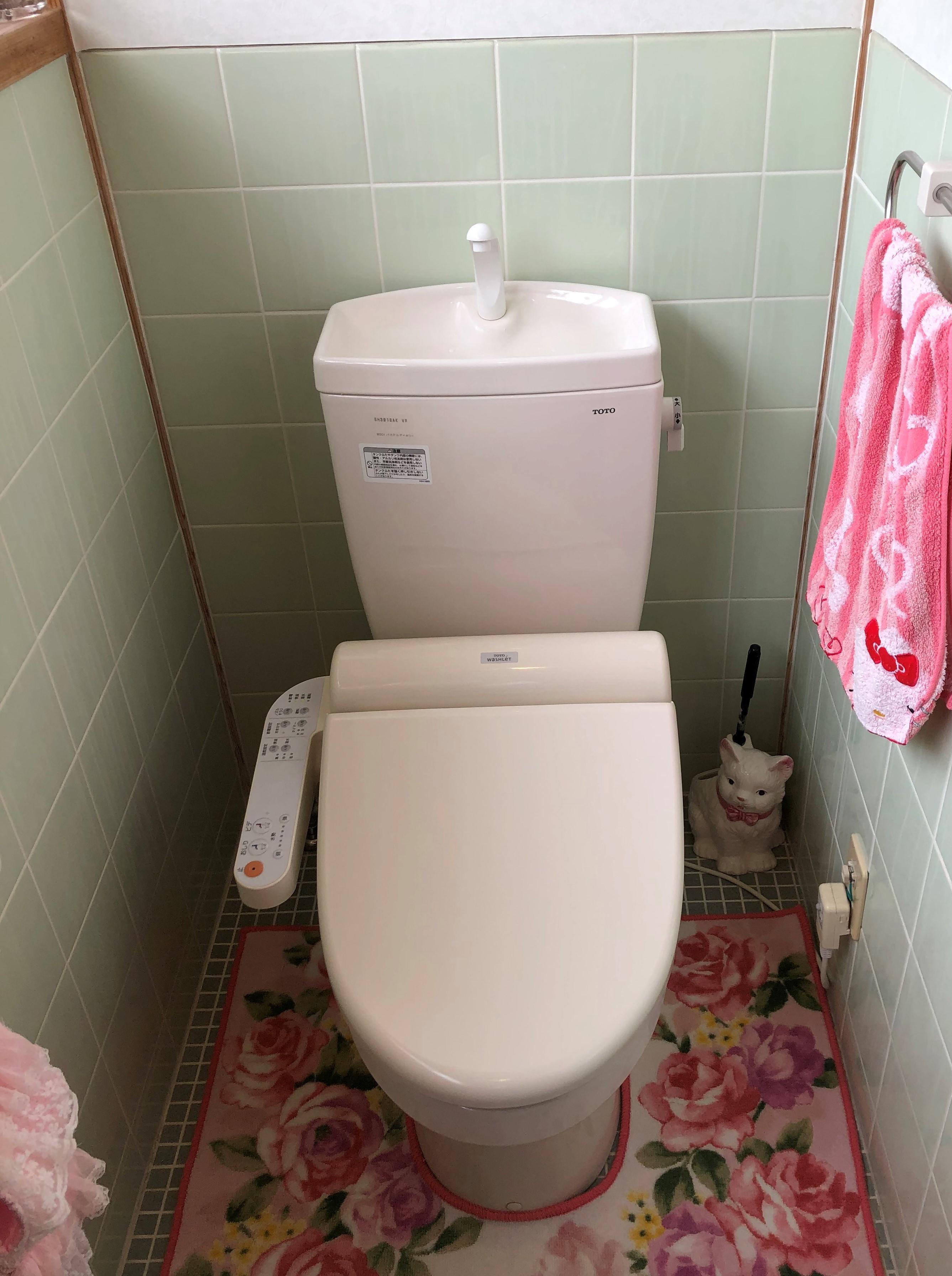便器の取替えを行い タイル部分にキッチンパネルを施工しました。 お手入れが簡単になり とても可愛らしい空間に仕上がりました。