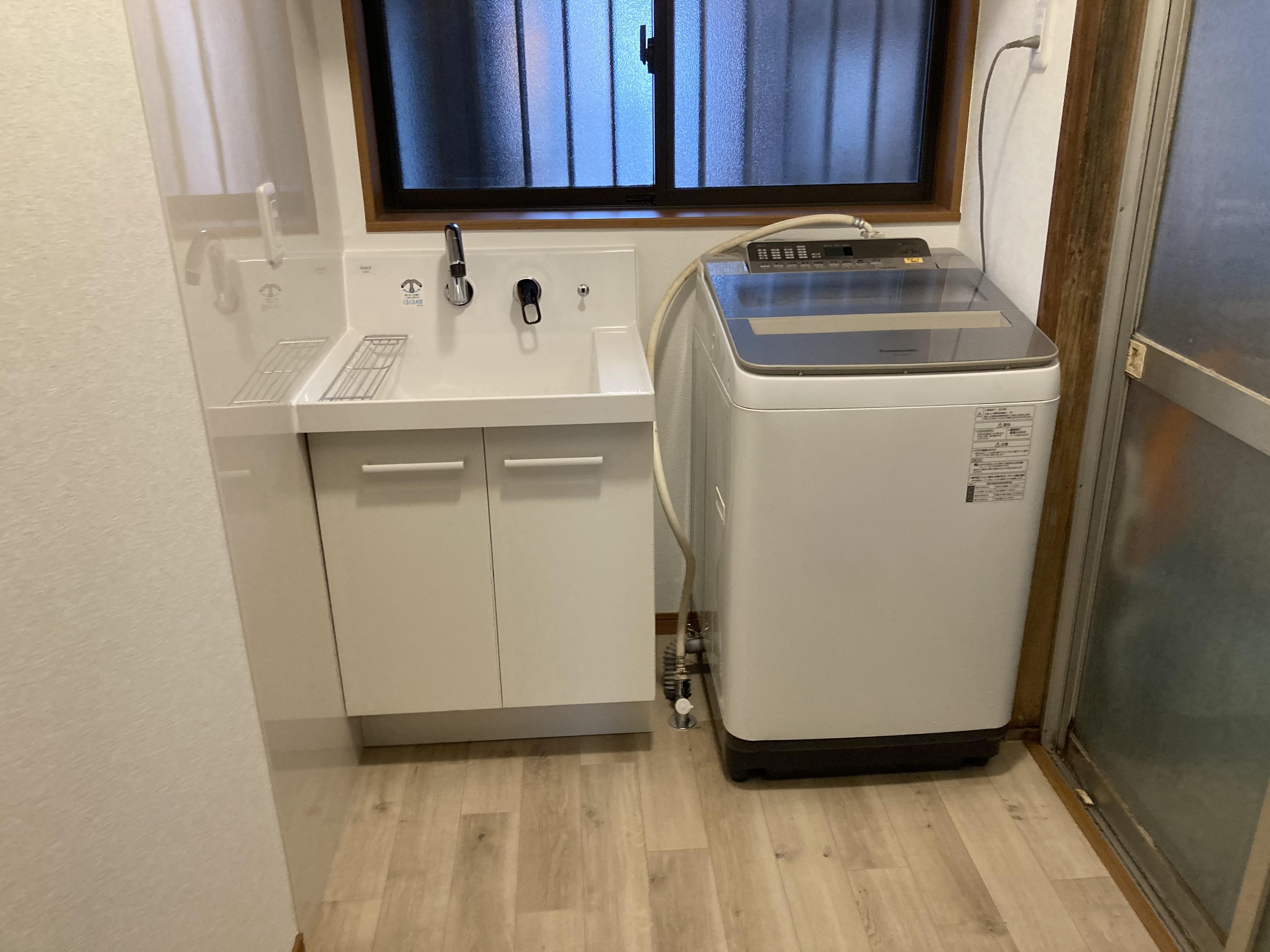 お家を建てられたときに造作してもらった タイルの洗面台。 解体・撤去し 洗面室を広く有意義に使える空間にしました。 とても明るくて広々とした空間に仕上がりました!!
