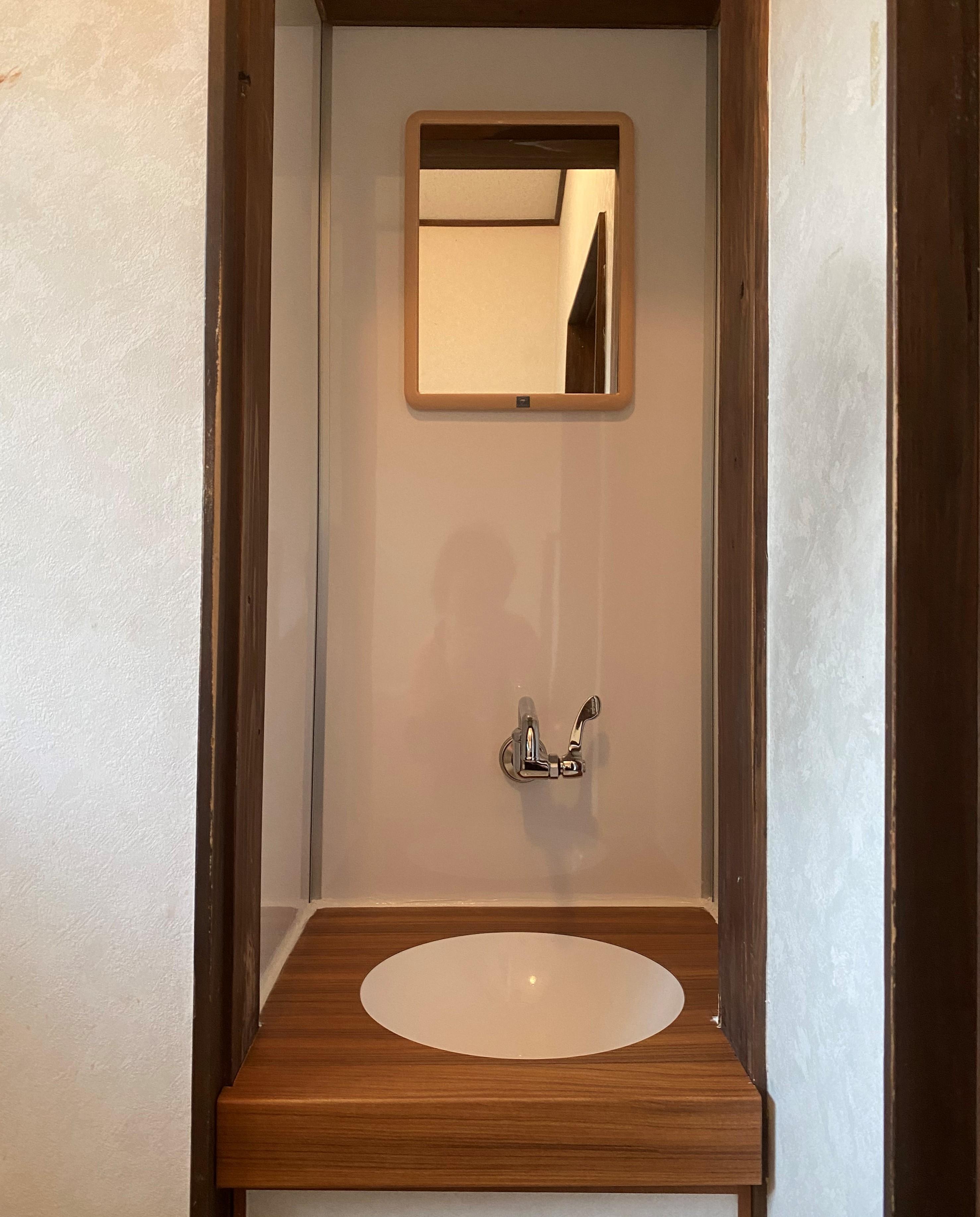 トイレは下水道切替工事をした時に改装したけど 手洗い器は以前のままで…是非綺麗にしたいとのご相談でした。 タイルの壁には キッチンパネルを貼りました。お手入れが簡単です! 手洗い器と水栓もきちんと収まりました。 綺麗になると気持ちが良いですね。