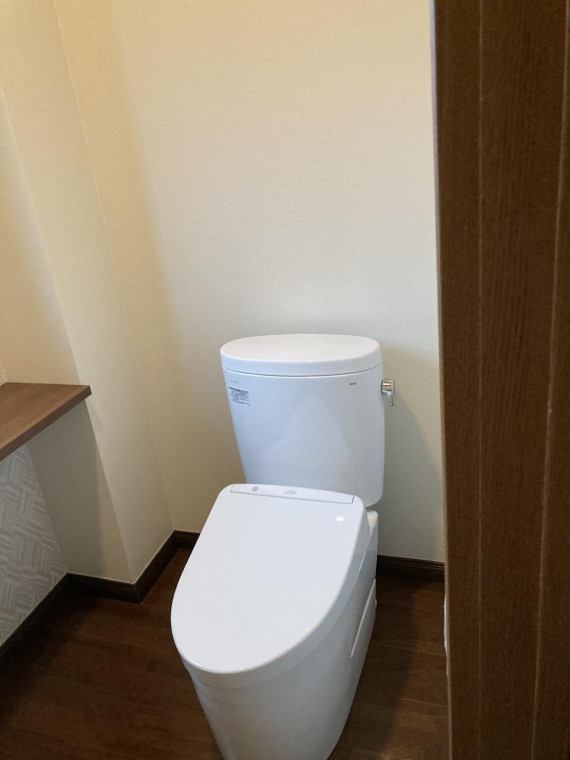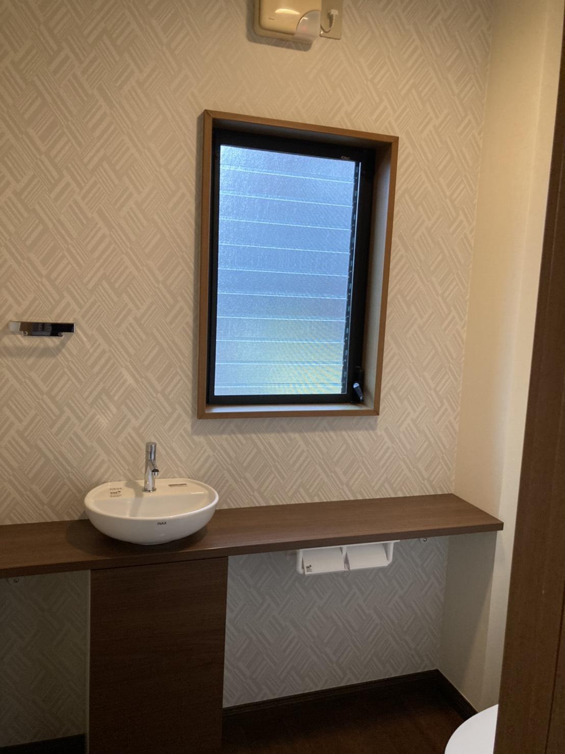とってもお洒落なトイレに大変身!! カウンターの上にボウルタイプの手洗い器。 ご施主様のセンスが光る空間が出来上がりました。