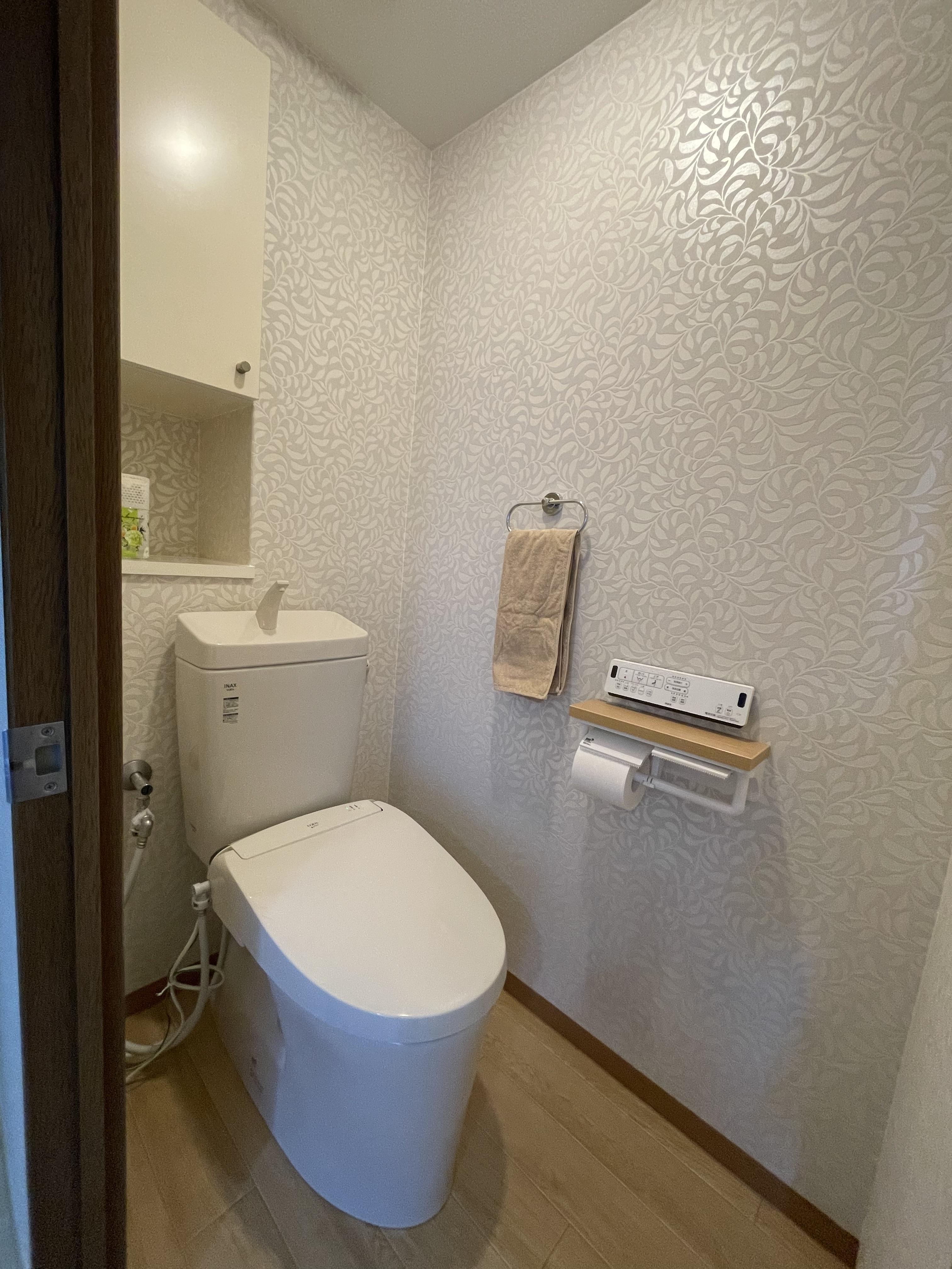 生活をしながらのリフォーム工事 トイレが使えないのが1番の問題となります。 お客様が出勤後 朝から便器を取外し 次にクロス・クッションフロアの貼替 最後に新しい便器の取付を1日で完了しました。 お客様がお仕事から戻られた頃には トイレがキレイになって使える状態に!!