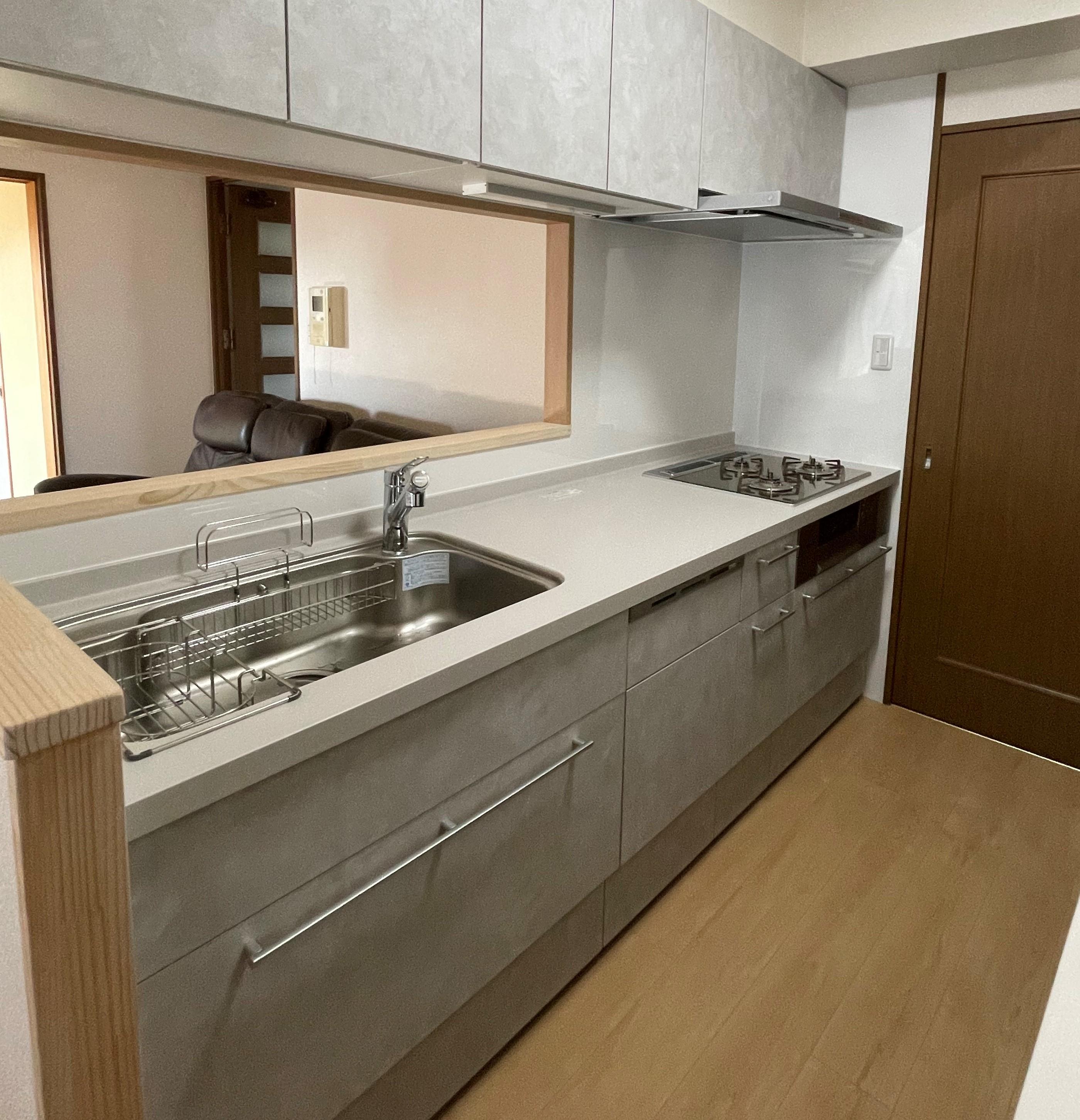 新しいキッチン 使い易くて お手入れも簡単!! 床の色も明るいものを選ばれ キッチンの扉の色もシャープな色をチョイス! とても明るい空間に仕上がりました。