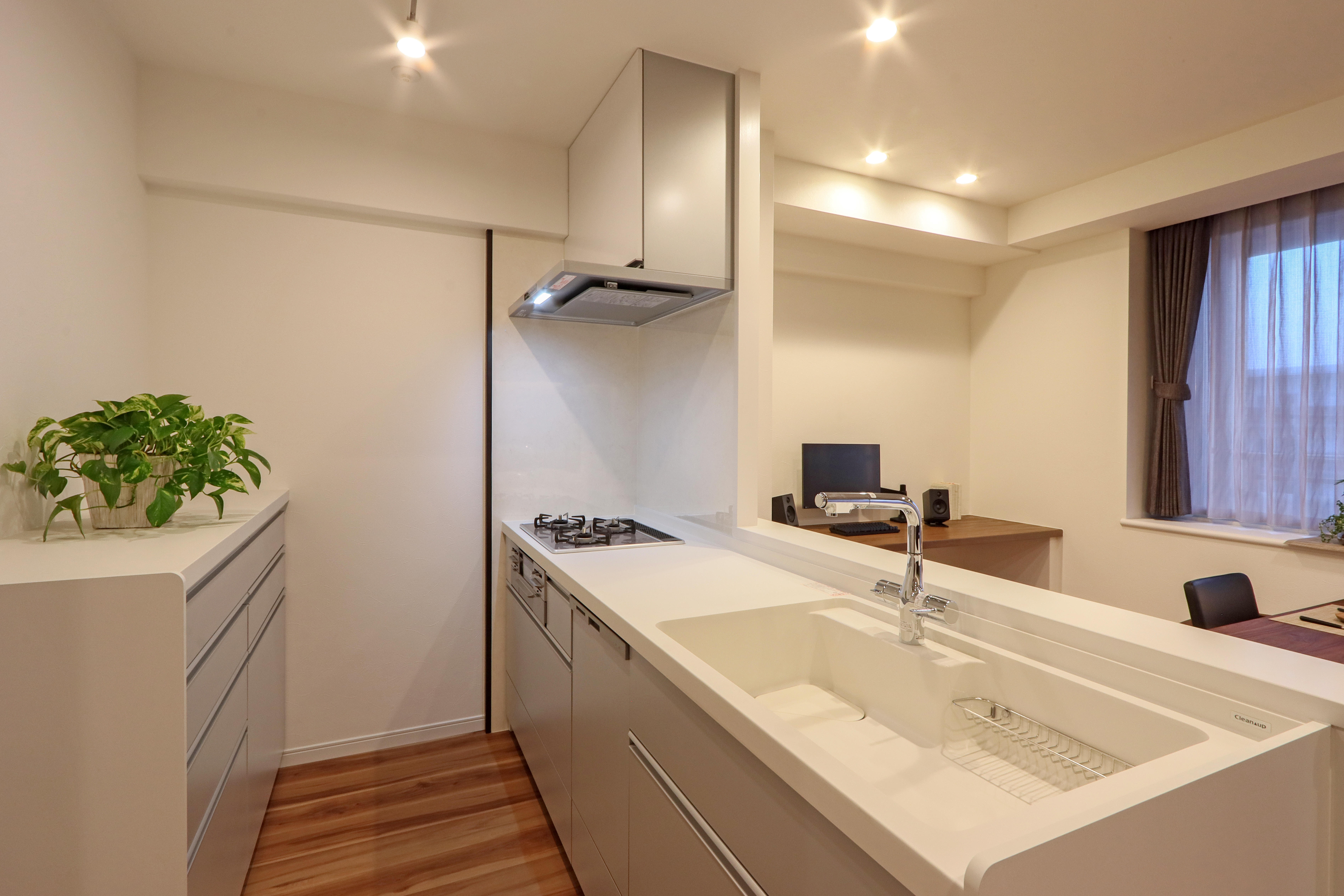 キッチンはクリナップ ステディア 「ステンレス」を使ったエコキャビネットだからキレイが長持ち! 省エネで使い易く お手入れも簡単です。