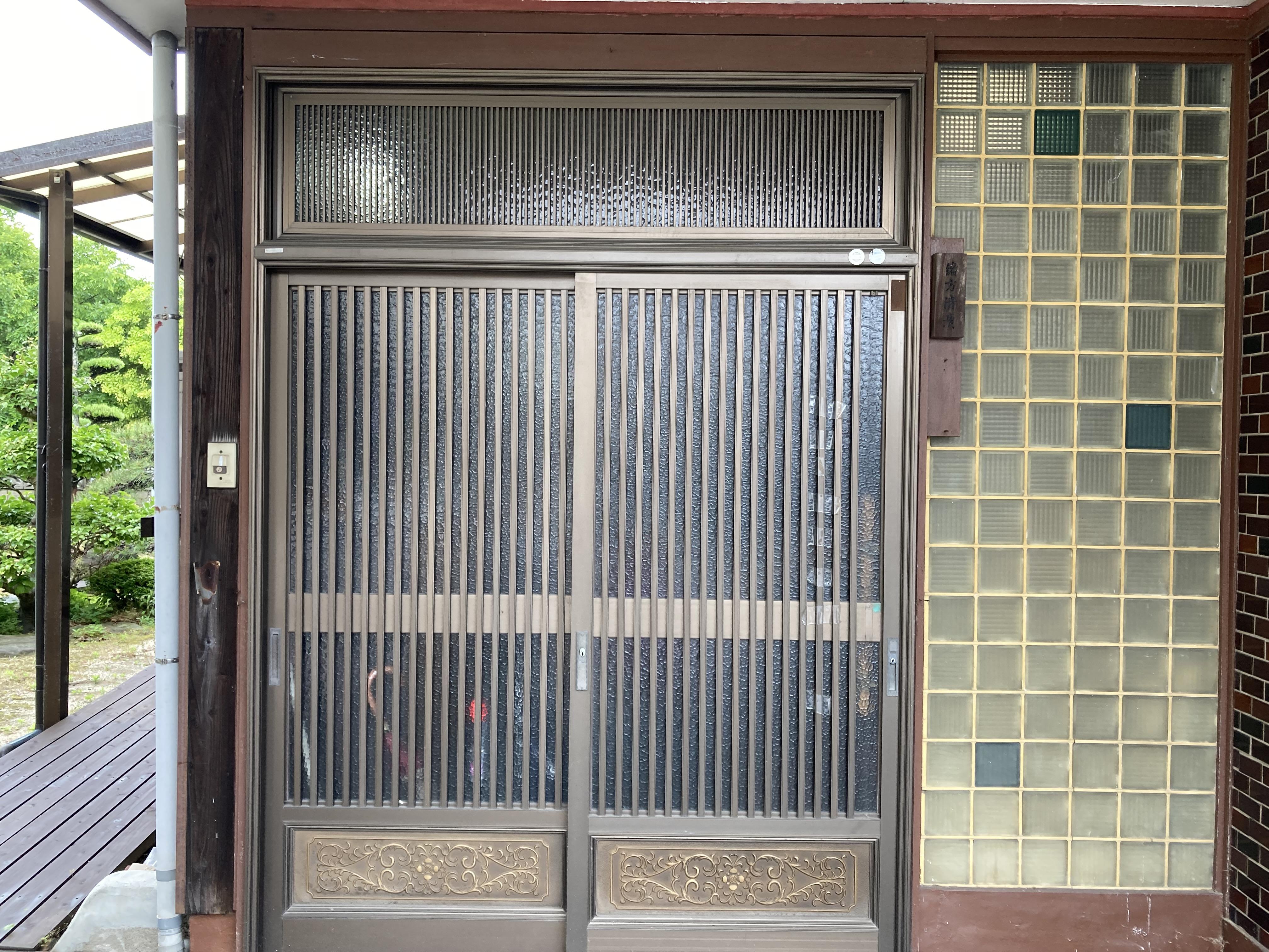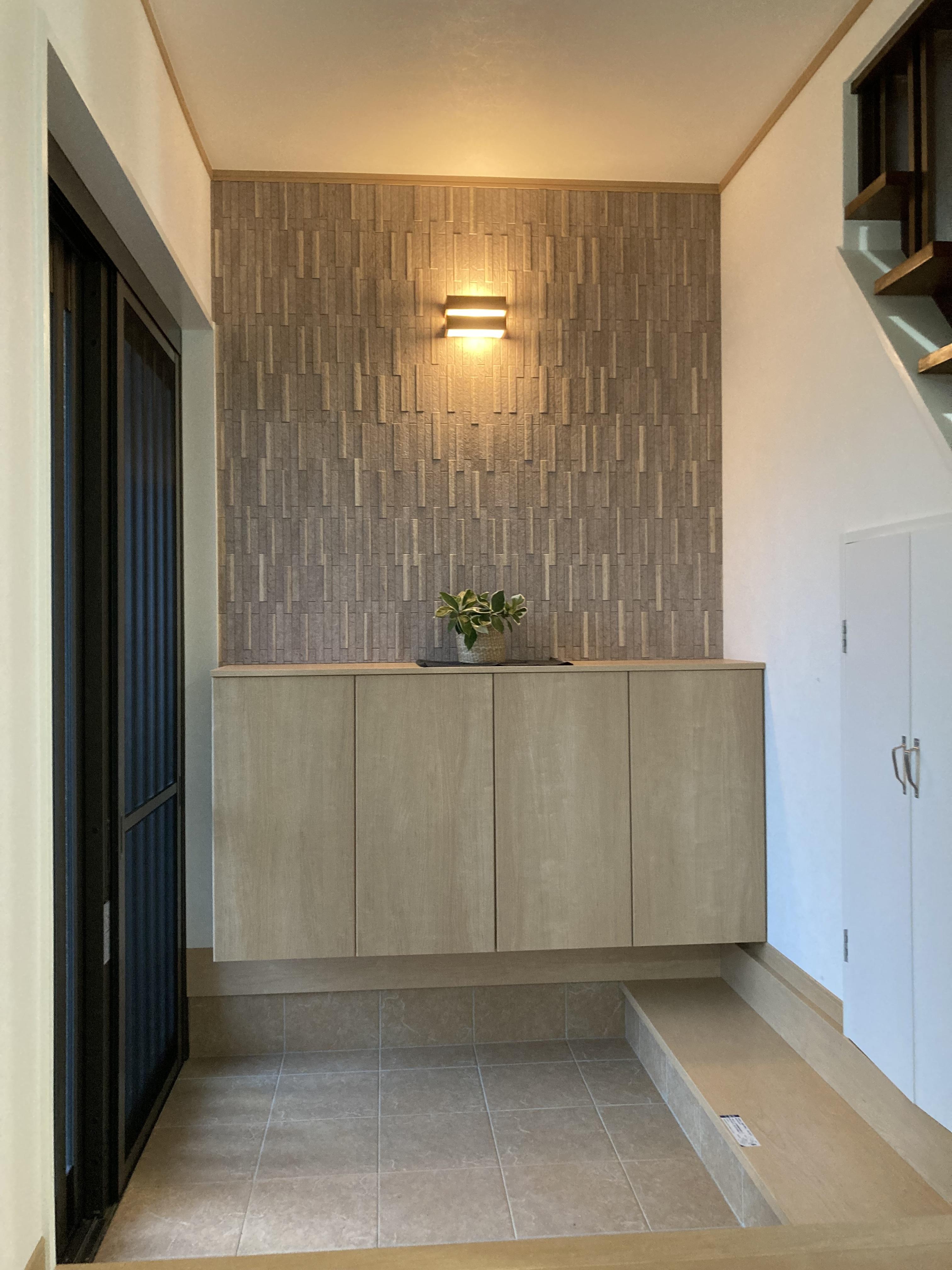 玄関引戸をカバー工法のリシェント工事で一新! ガラスブロックの部分も 明るさを確保する為に 縦長のスリット窓を取付ました。 玄関収納とエコカラット(和細工 胡桃染)がお洒落な空間を創り出しています。