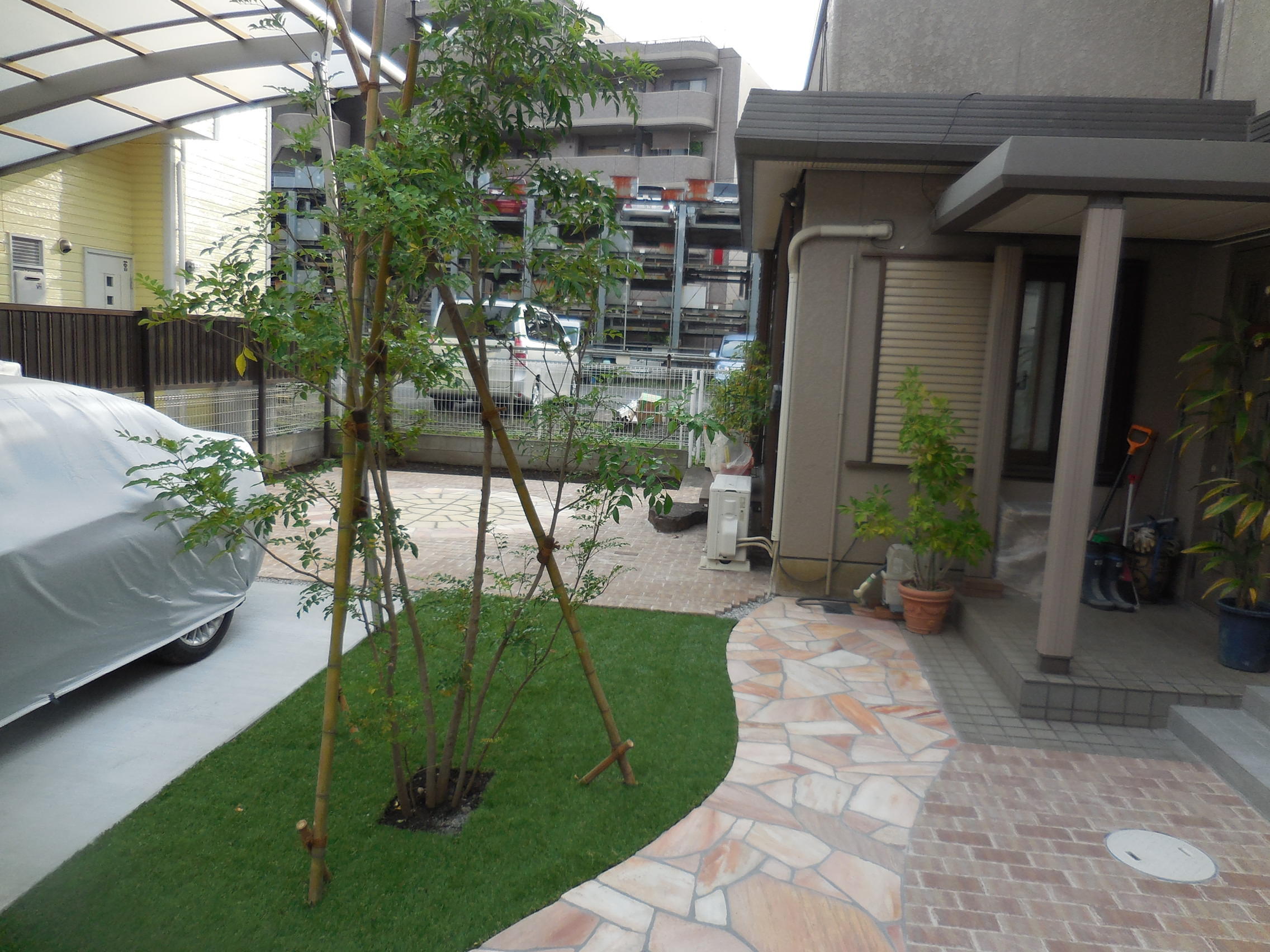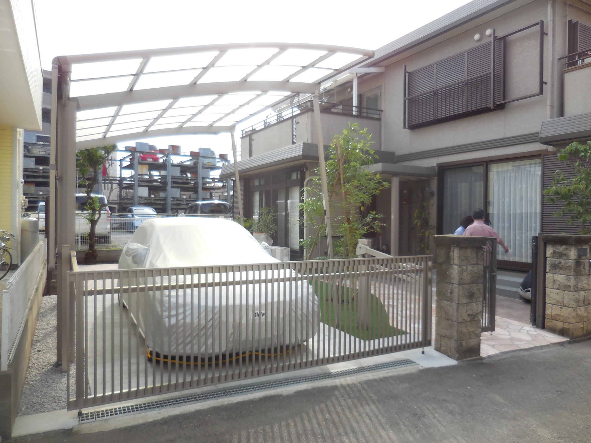 老朽化してしまった車庫を、広々とした駐車スペースにリフォーム。空間は同じですが、かなり広くなった印象になりました!同時に玄関までのアプローチ、お庭スペースもリフォーム、お客さまにも素敵に仕上がったと大変喜んでいただきました!