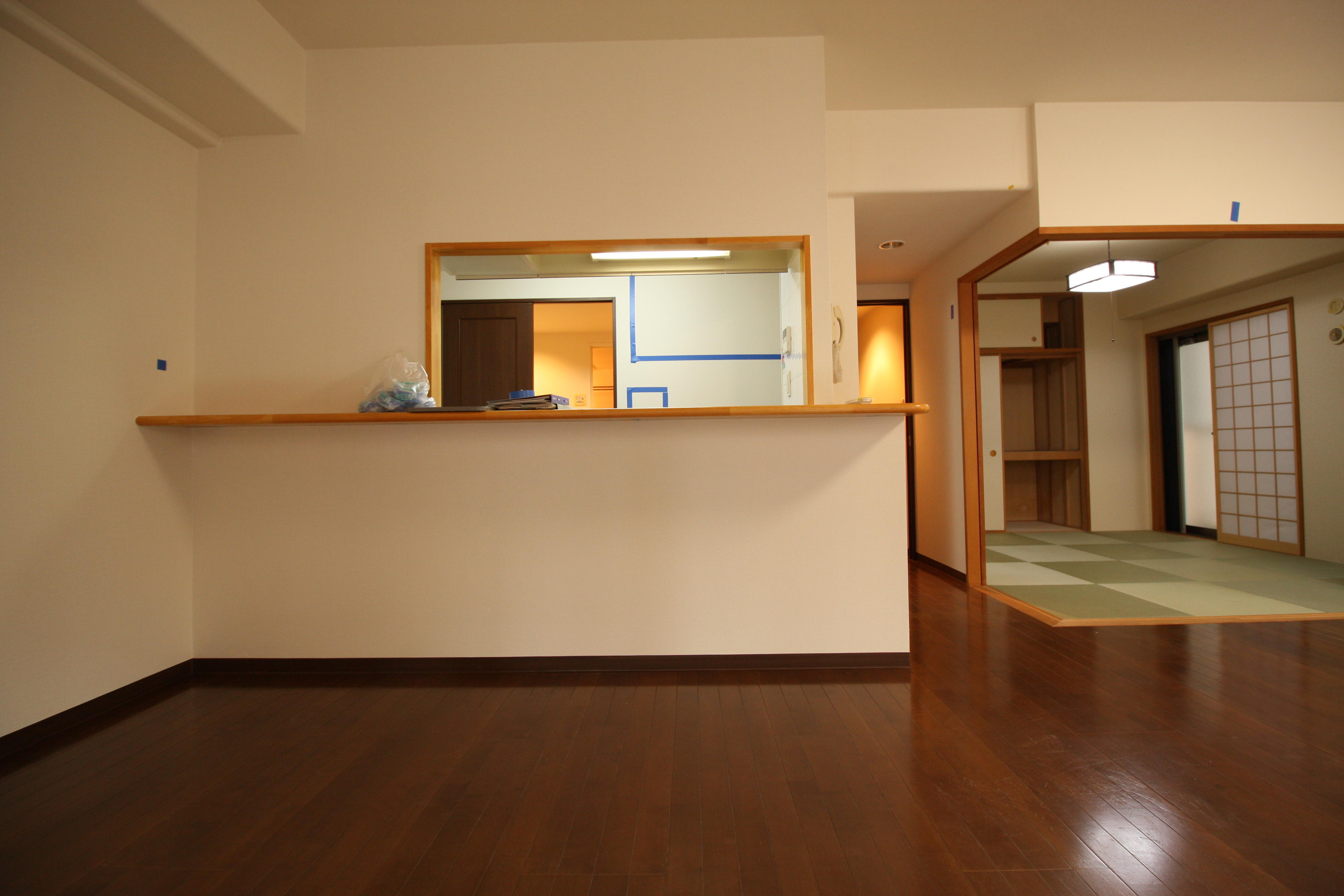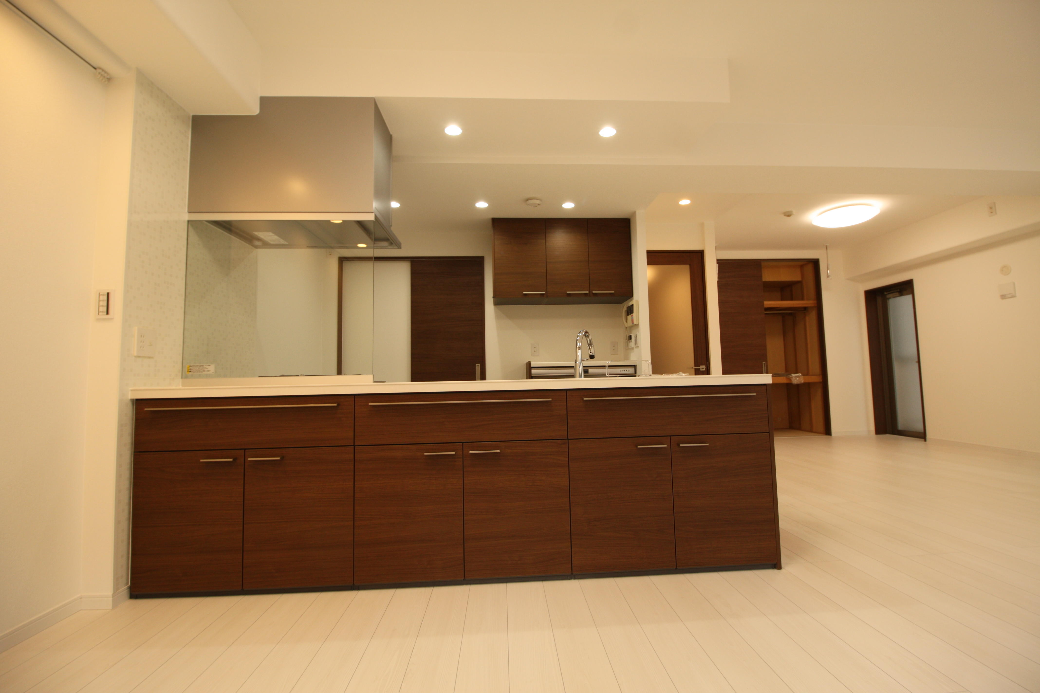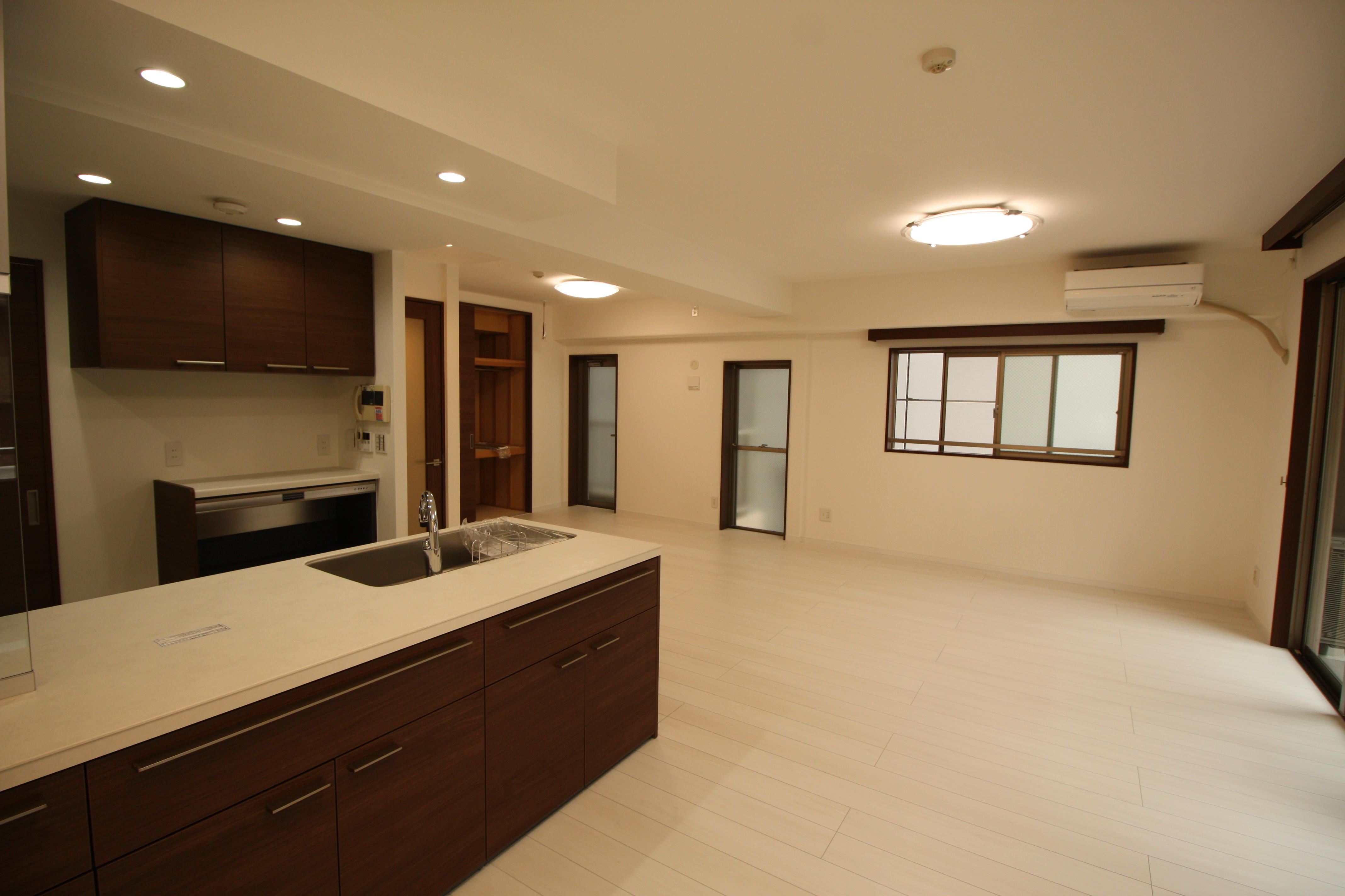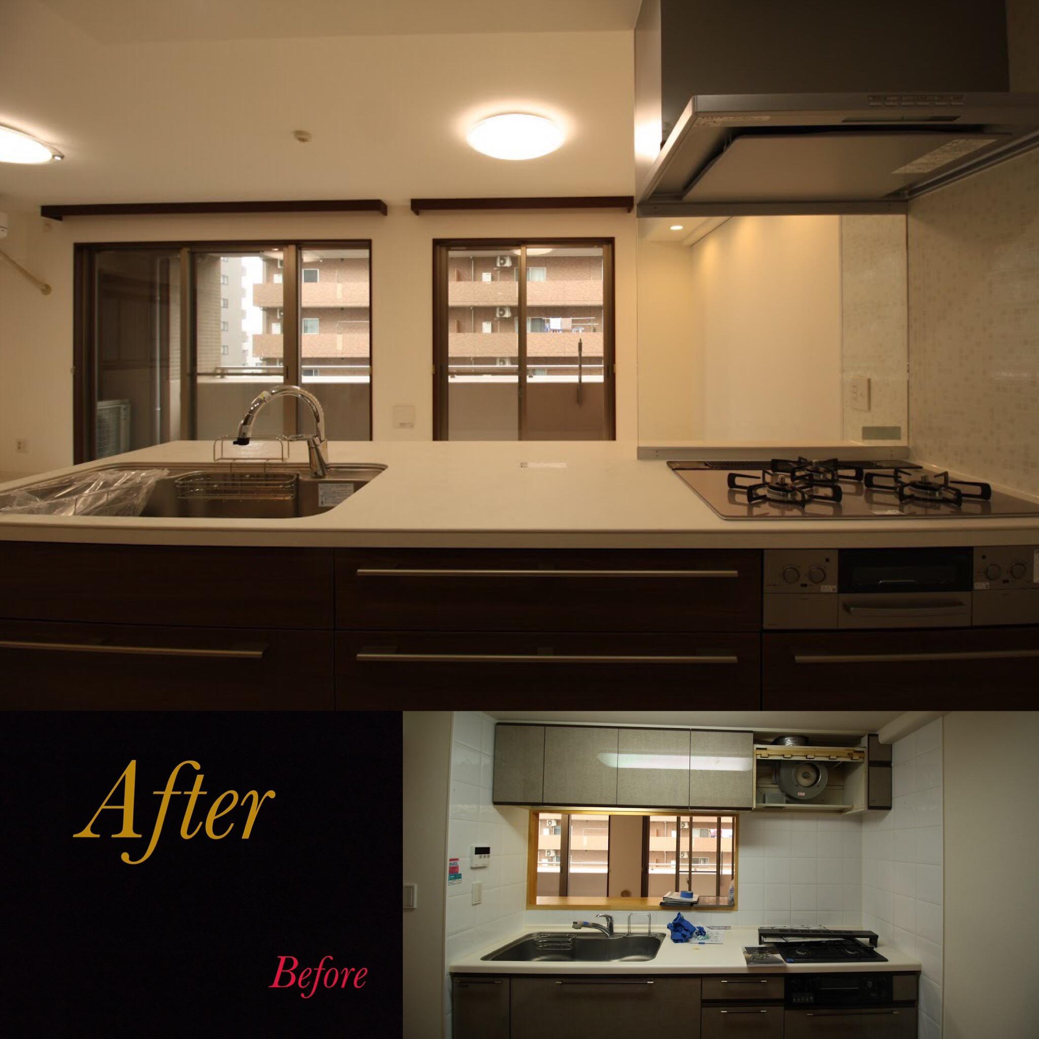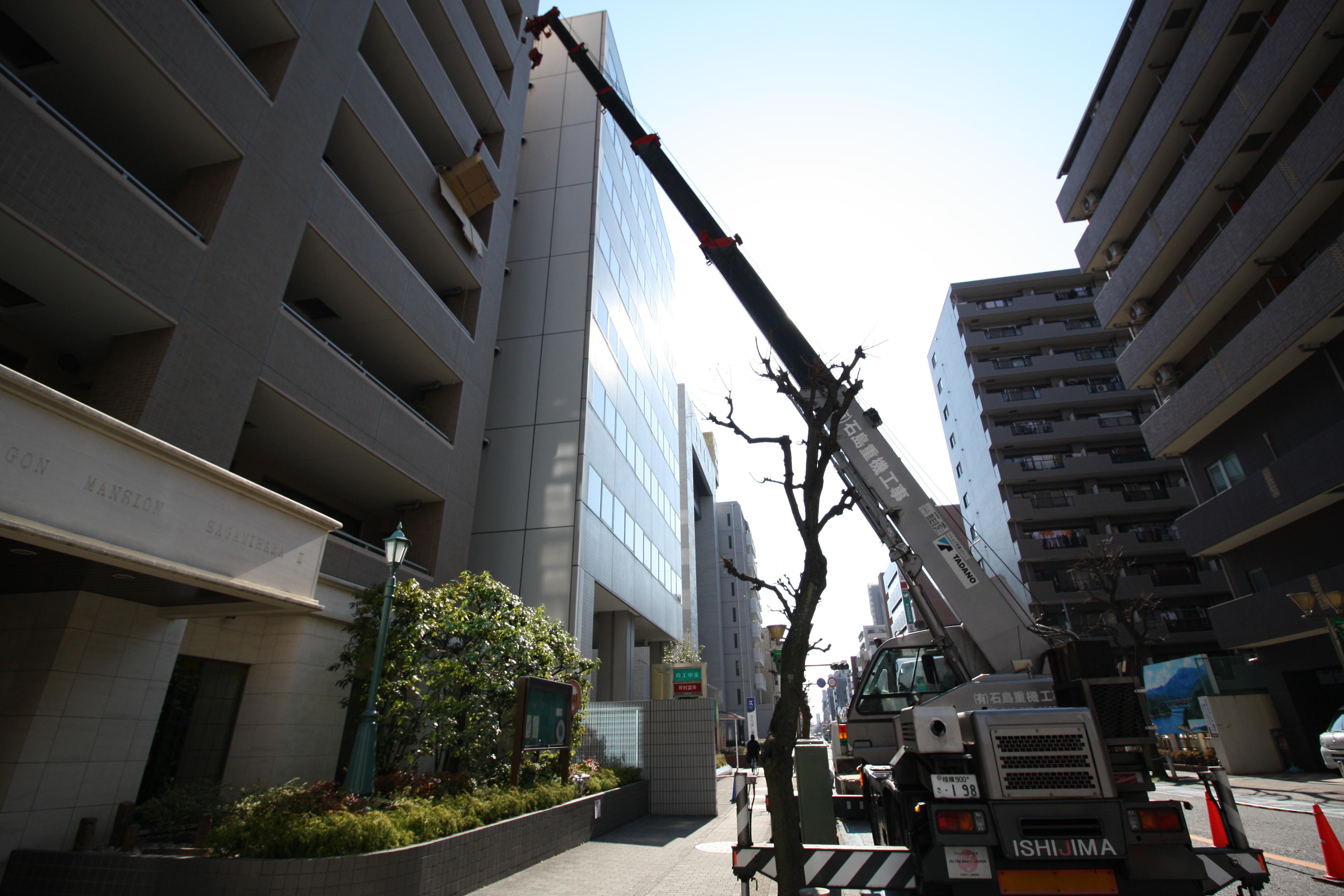 マンション5FへRICHELLE(リシェル)設置。人造大理石の天板は重さ108kg、長さ2.7m、幅90cmです。長さの都合でエレベータはもちろん、階段も登れません。今回はクレーン車により引き上げました。