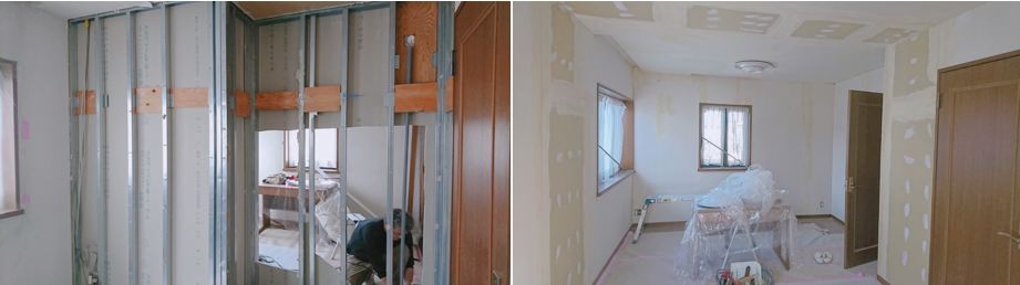 2つのお部屋を仕切っていたクローゼットを外しました。元々明るいお部屋に加えて広々としました。天井、壁は補修済でクロス仕上げを待つばかりです。