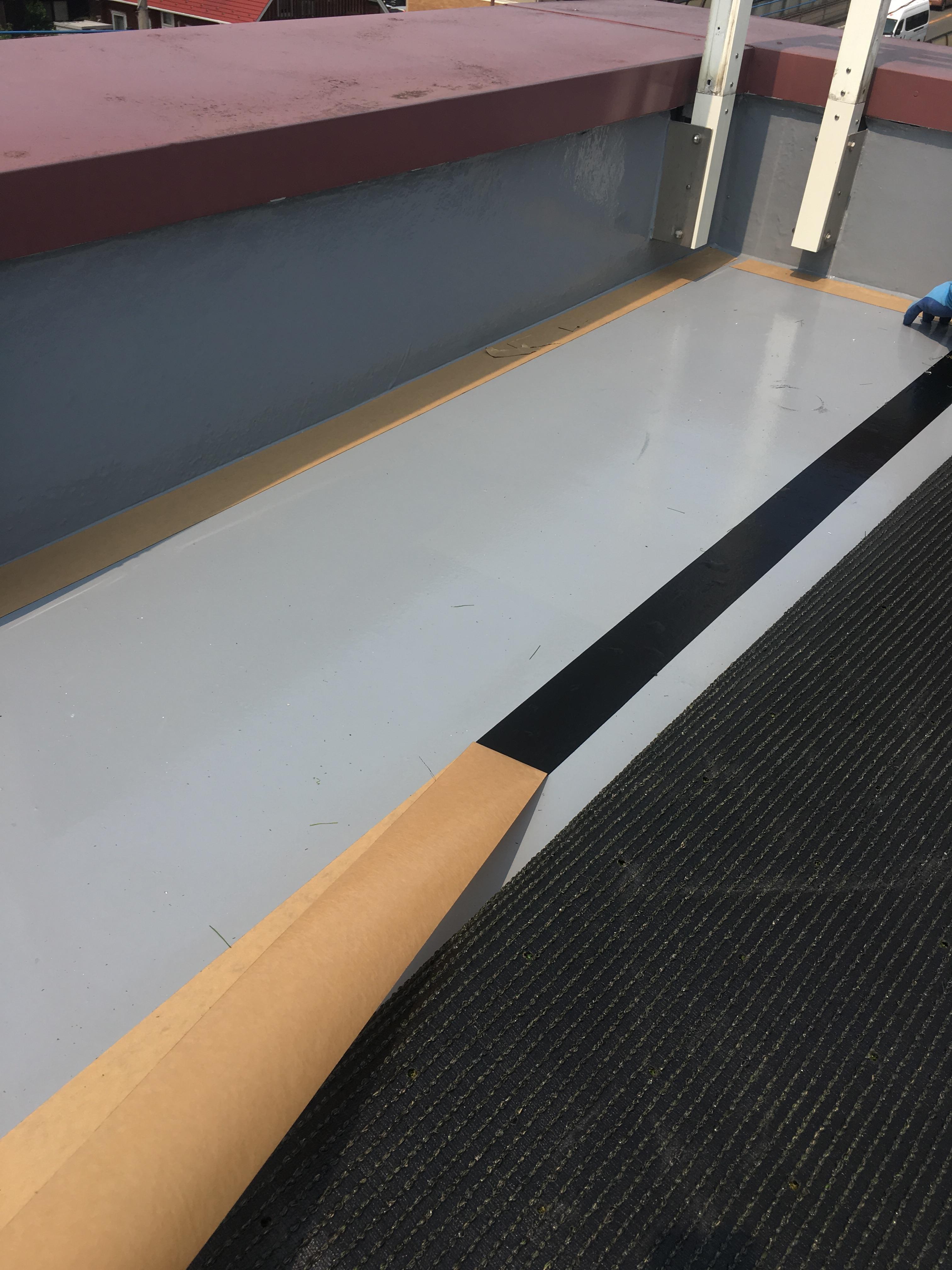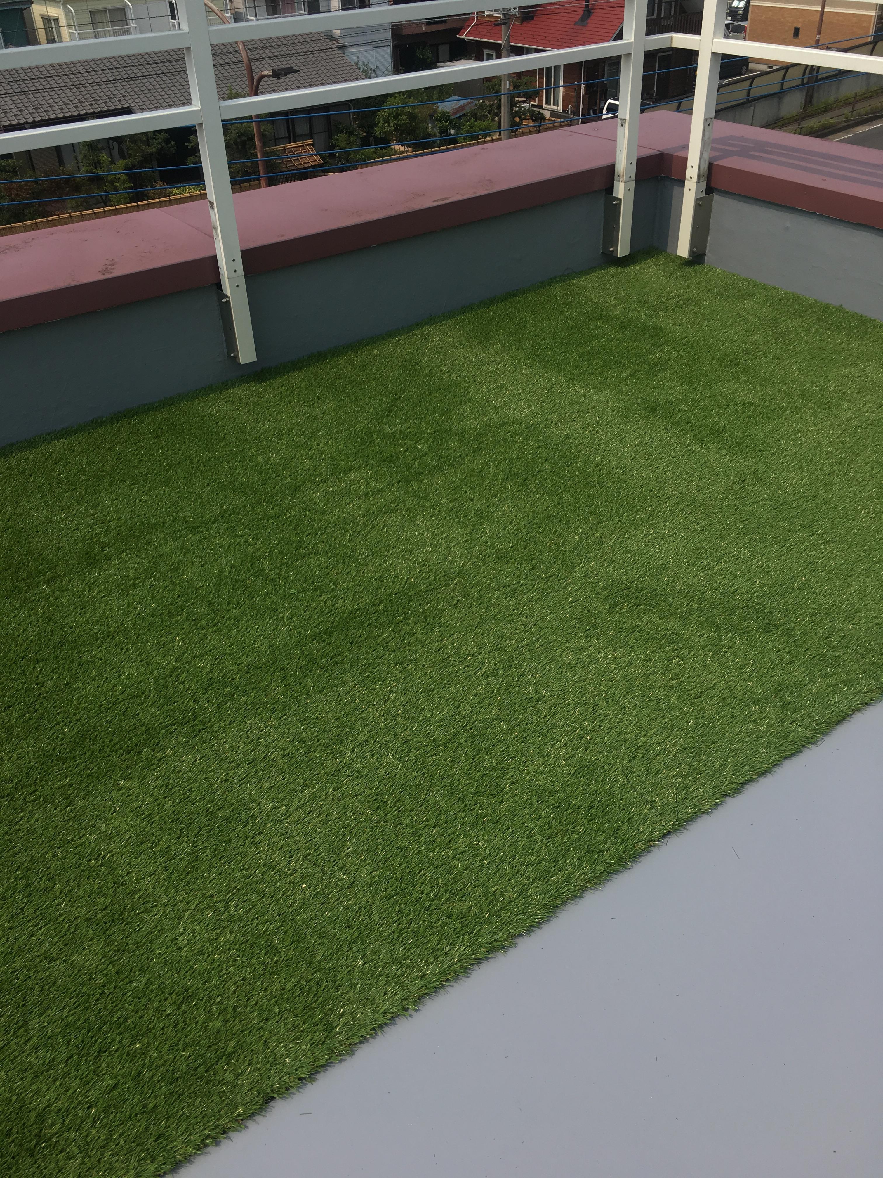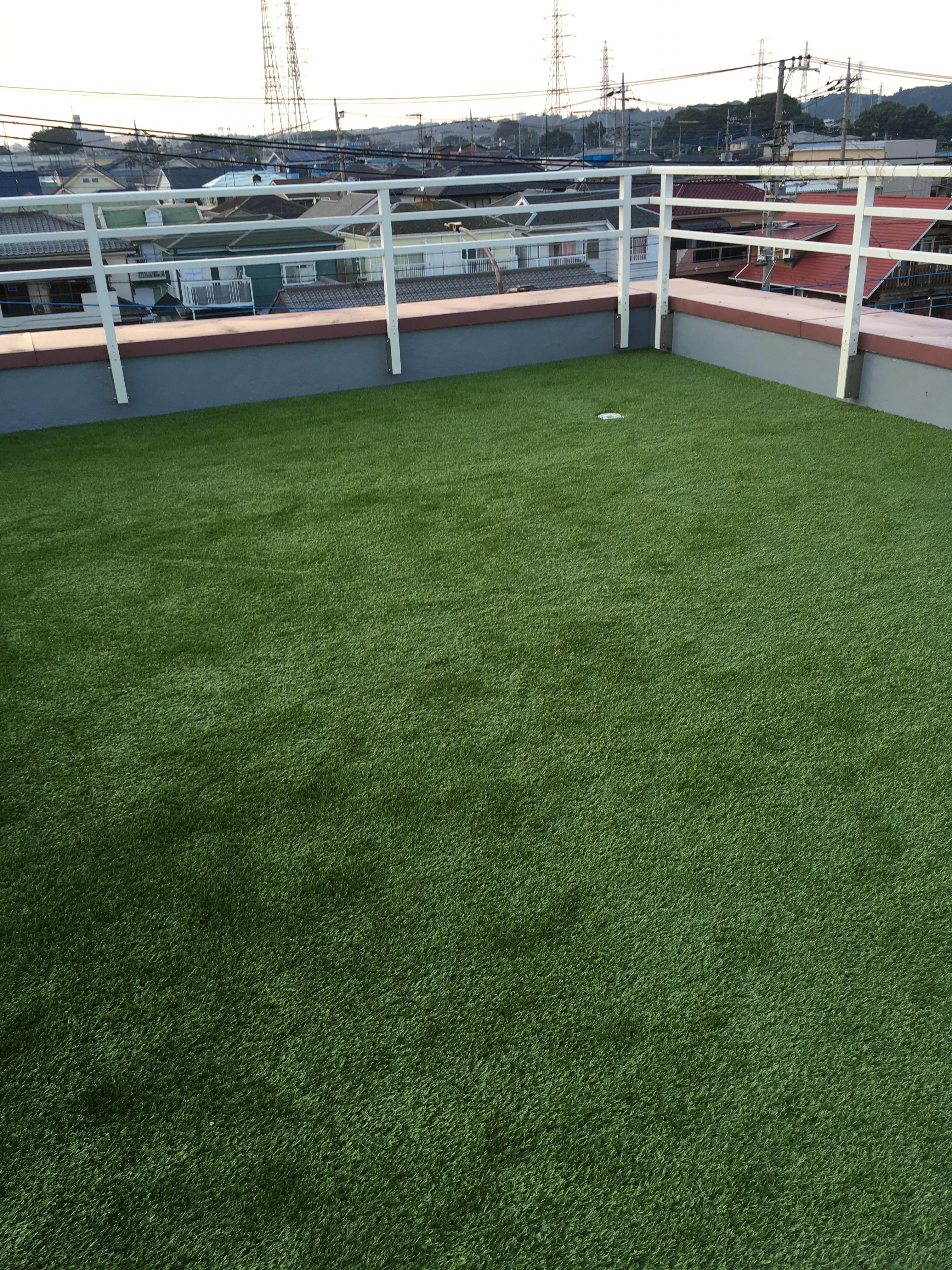 屋上を全面人工芝にしました。下地で防水処理を施してから、人工芝を敷き詰めました。最近の人工芝は色や形はもちろん、質感など多種にわたって自由に選べます。紅葉の季節でも青々としていて清々しいです!