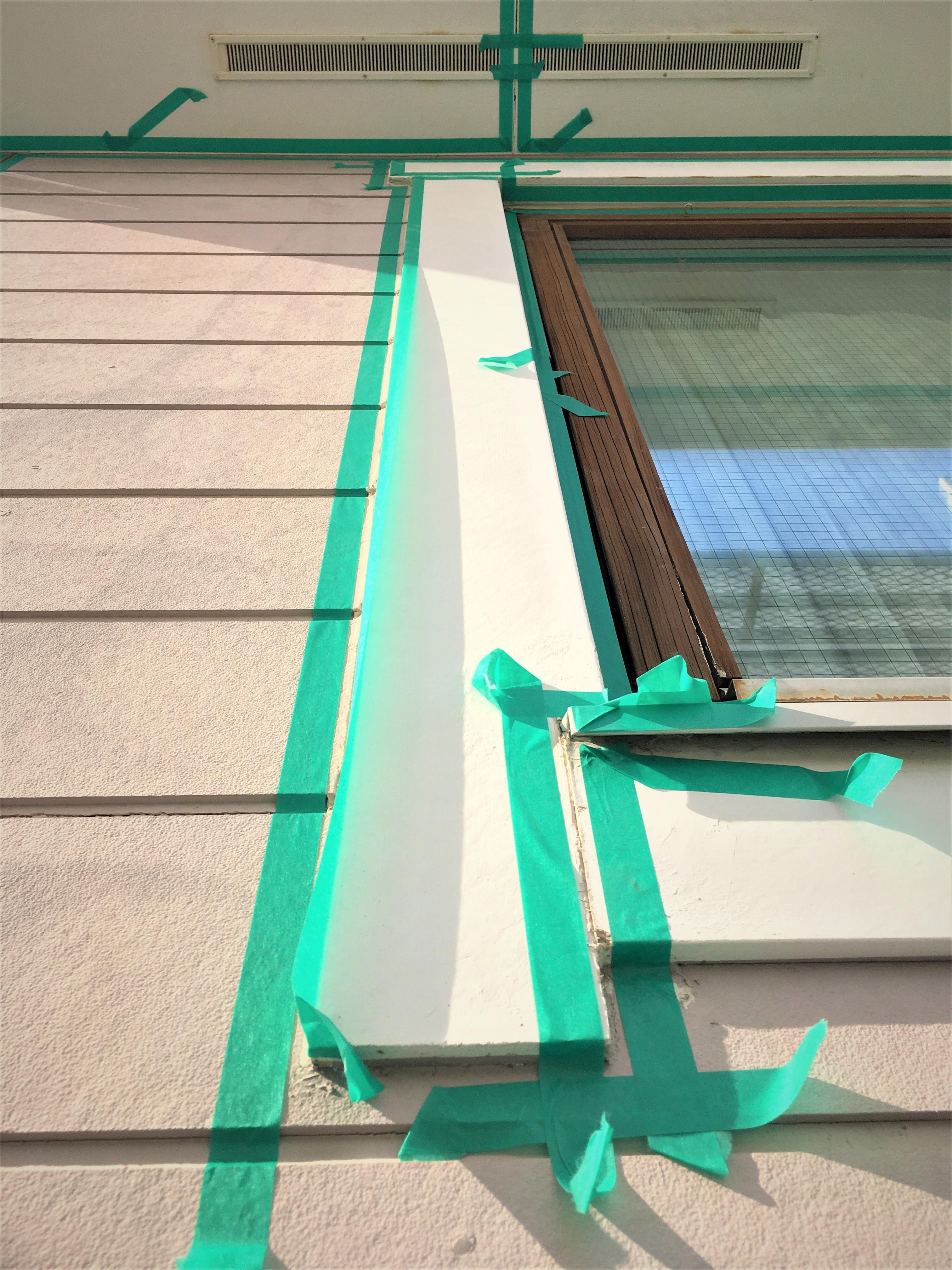 今回は特に木部の傷みが激しかったので下地処理が重要でした。 細かくテーピングして、しっかりコーキングすることで雨漏りを予防できます。 こうした細かい作業が塗装前に行われています。 なかなか見る機会がないと思いますので大変貴重は施工例です。 是非ご参考にしてください!