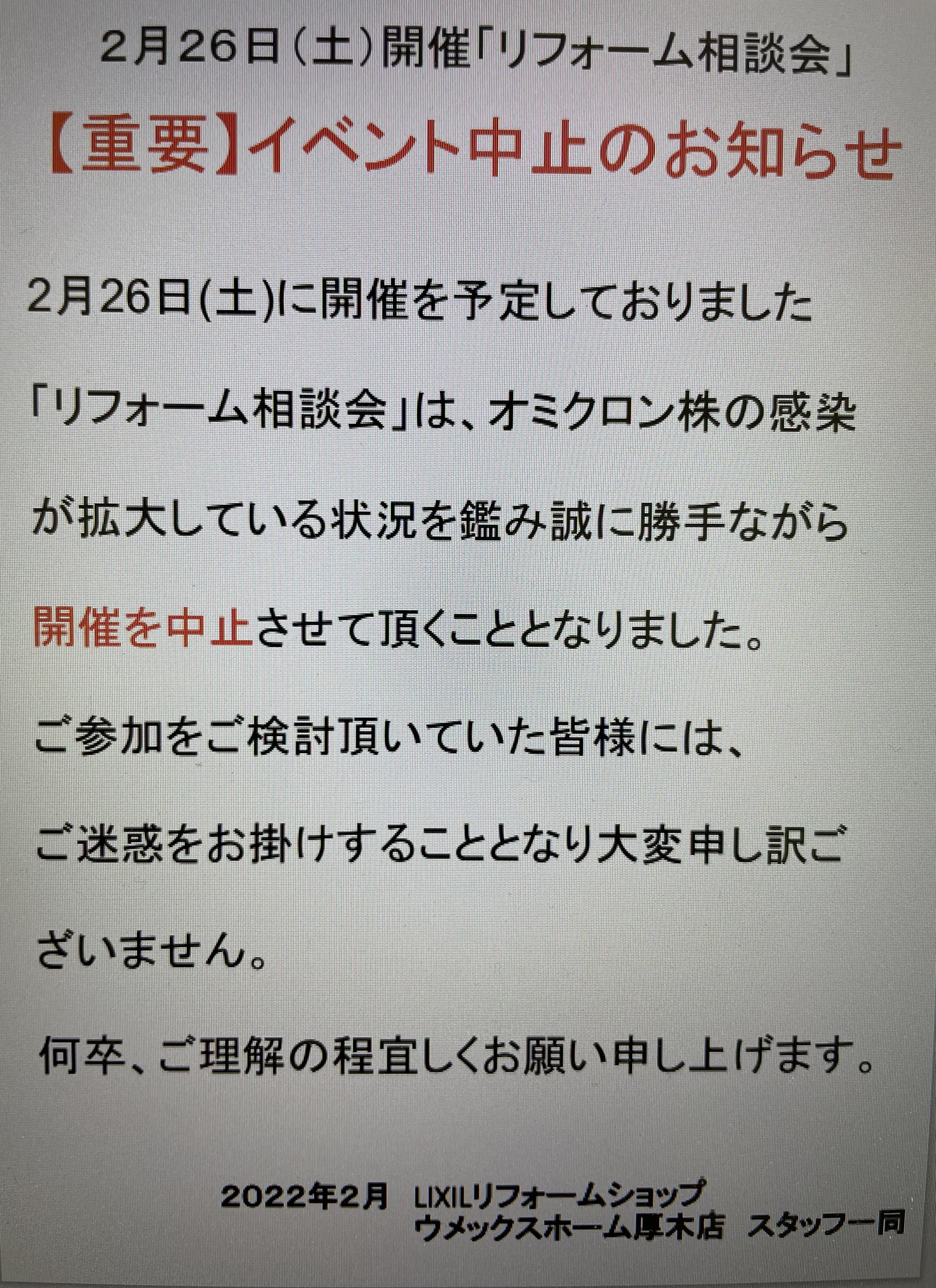 2月26日(土)に予定しておりました、ショールームイベントですが中止させて頂きます。