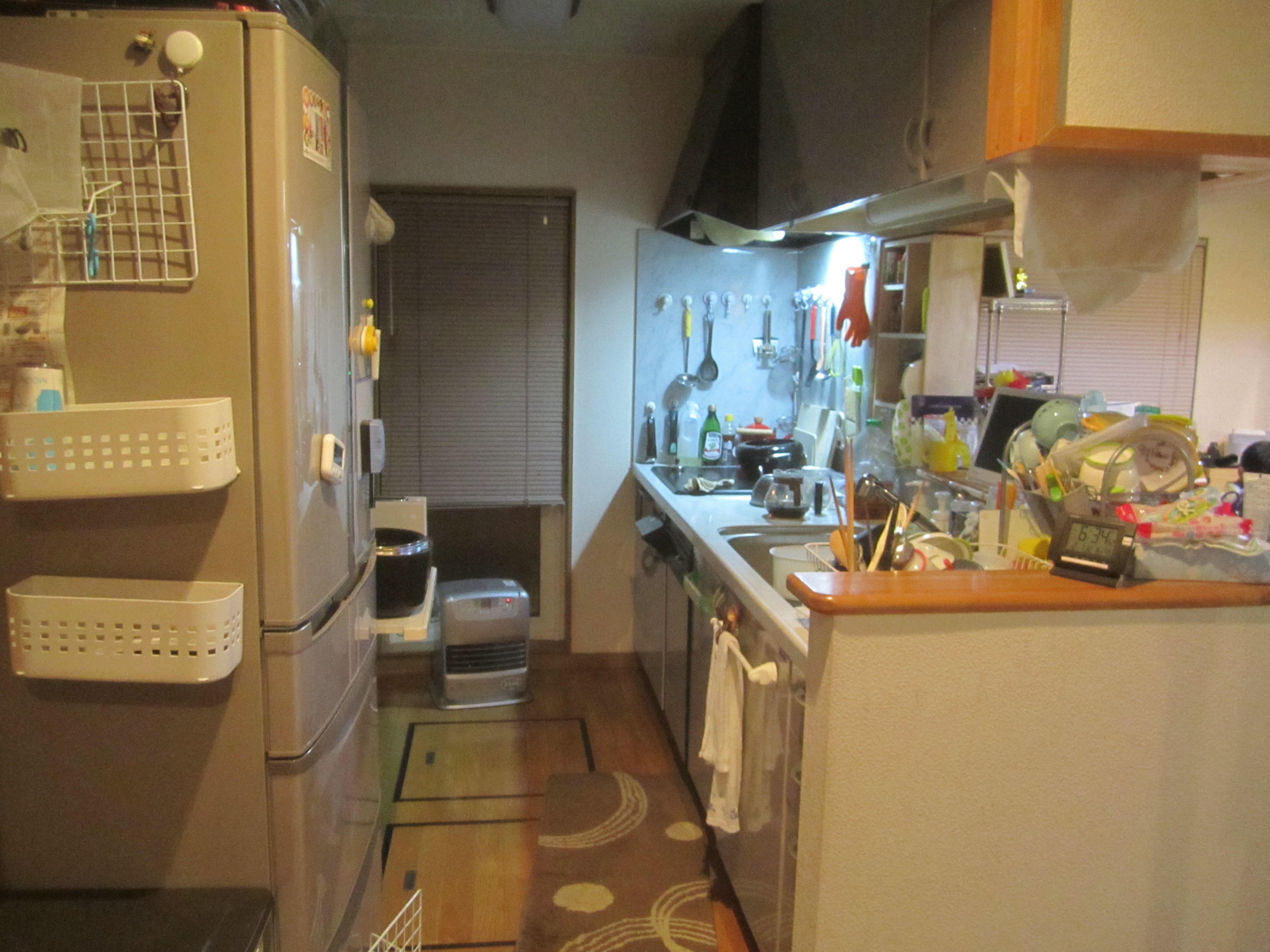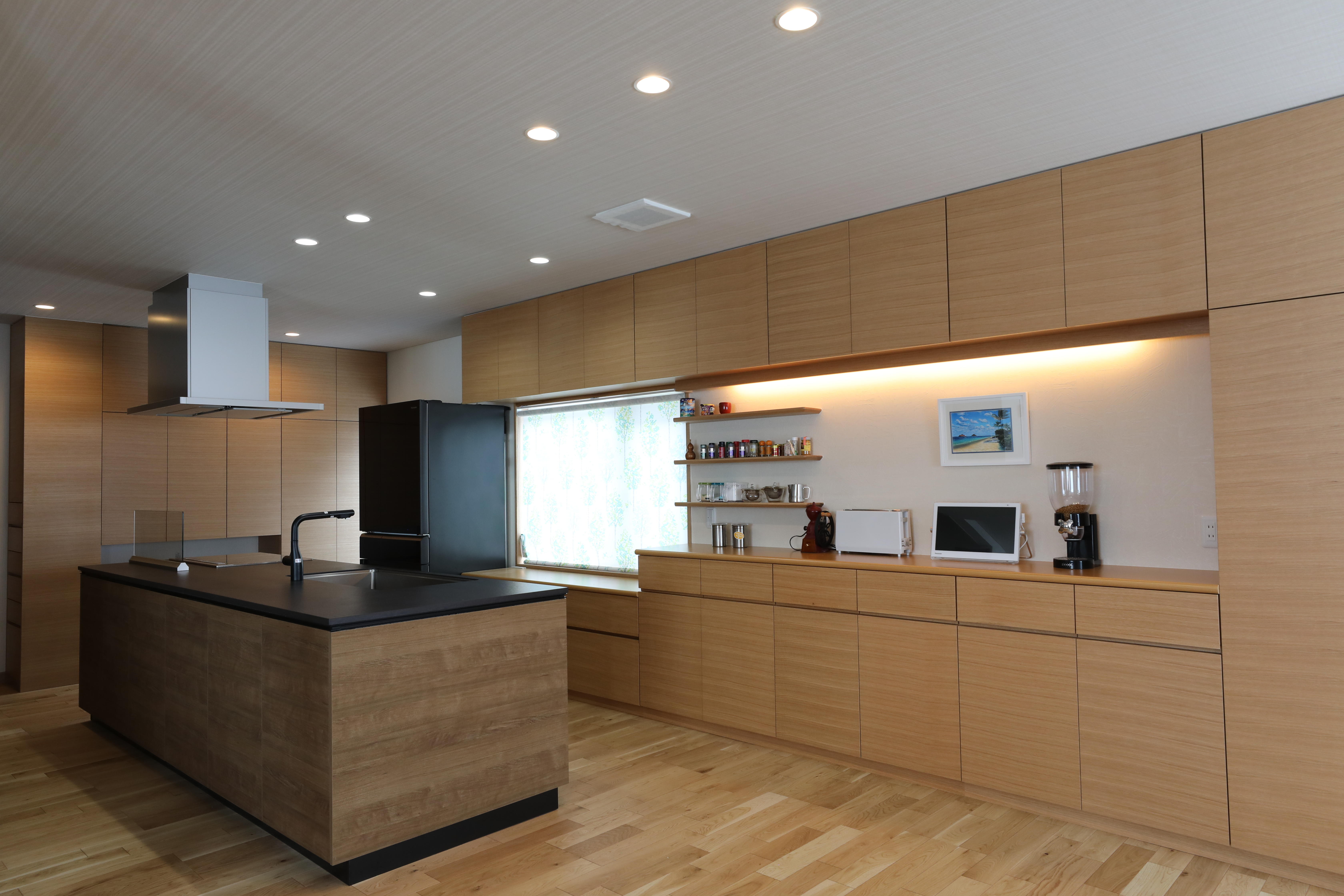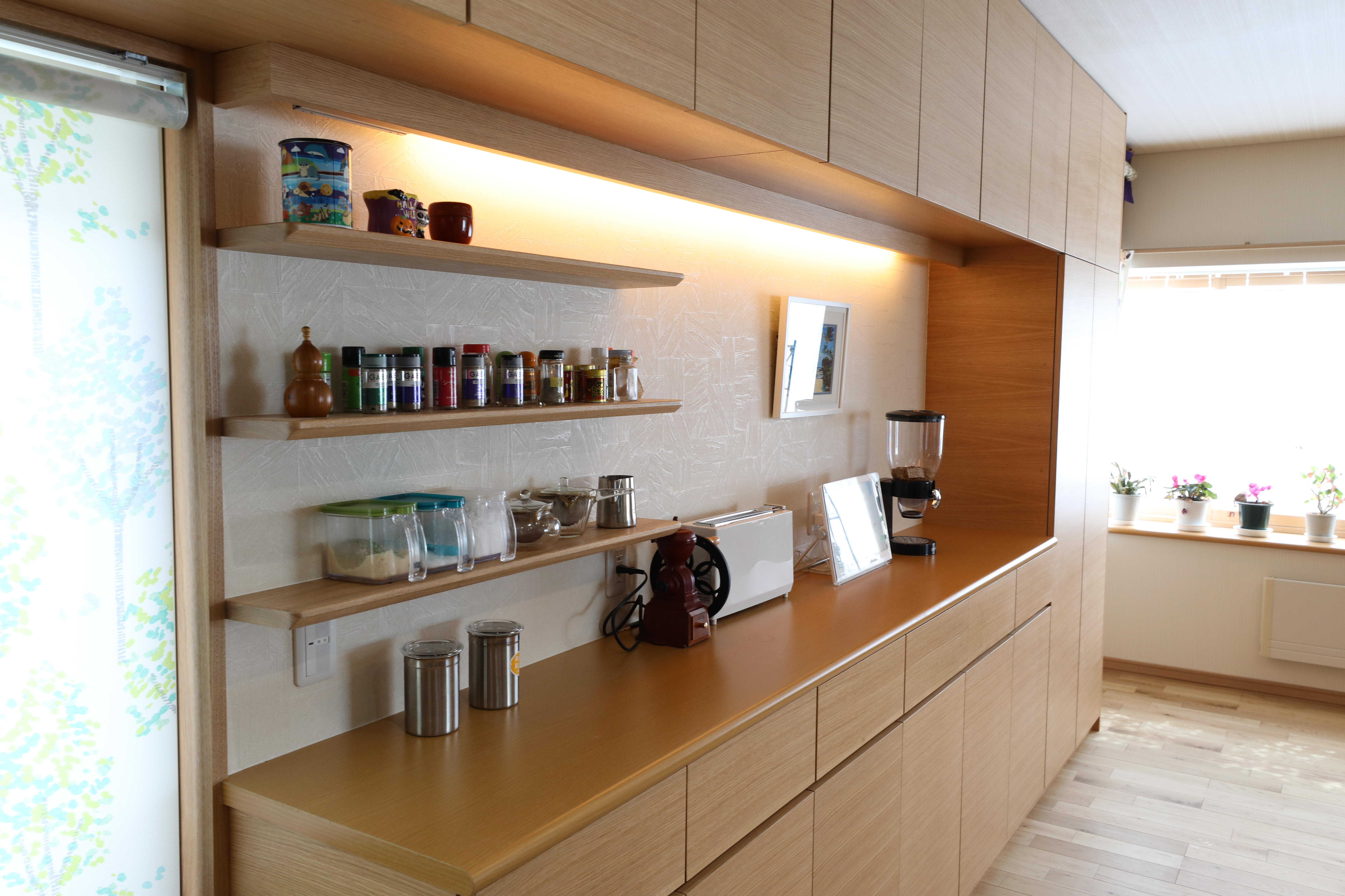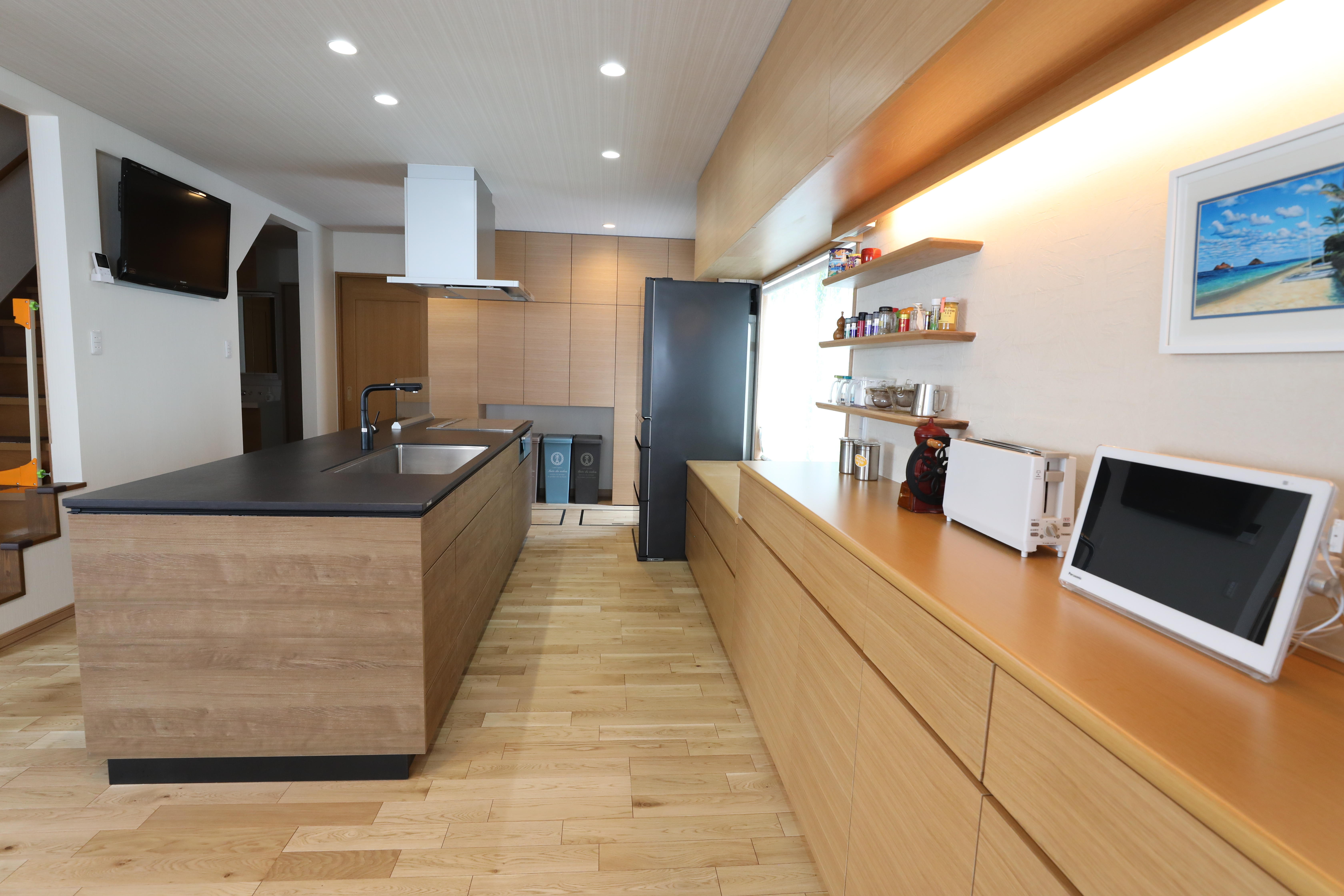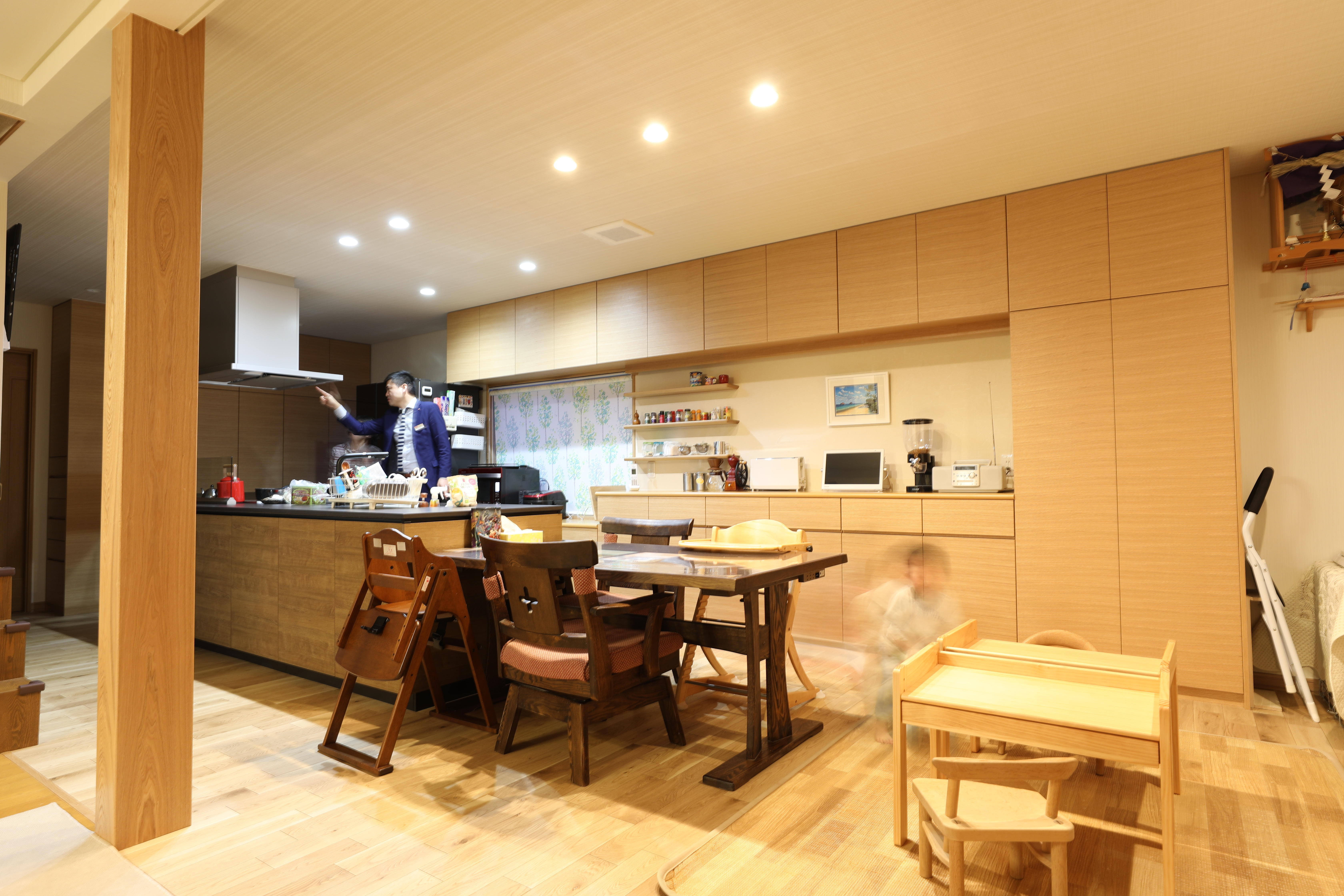 日中でも照明をつけなければならないほど暗く、窮屈だったダイニングキッチン。お子様の遊び場として使用していた隣の和室を壊し、アイランドキッチンを中心に据えた約20帖の広々としたダイニングキッチンを実現。収納家具も自社オリジナルでしつらえ、明るく開放的な空間になり元気な男の子兄弟も毎日走り回っています。