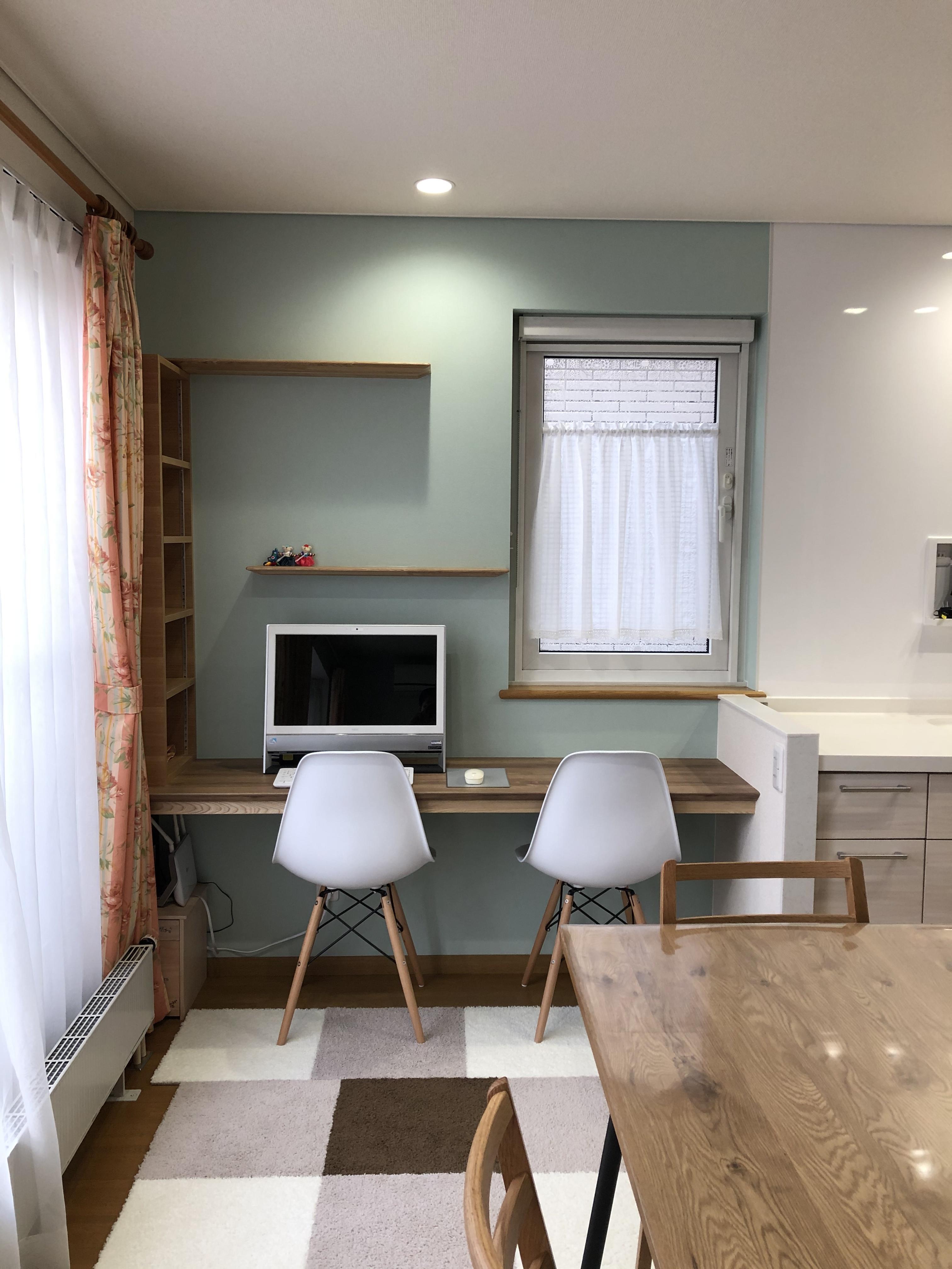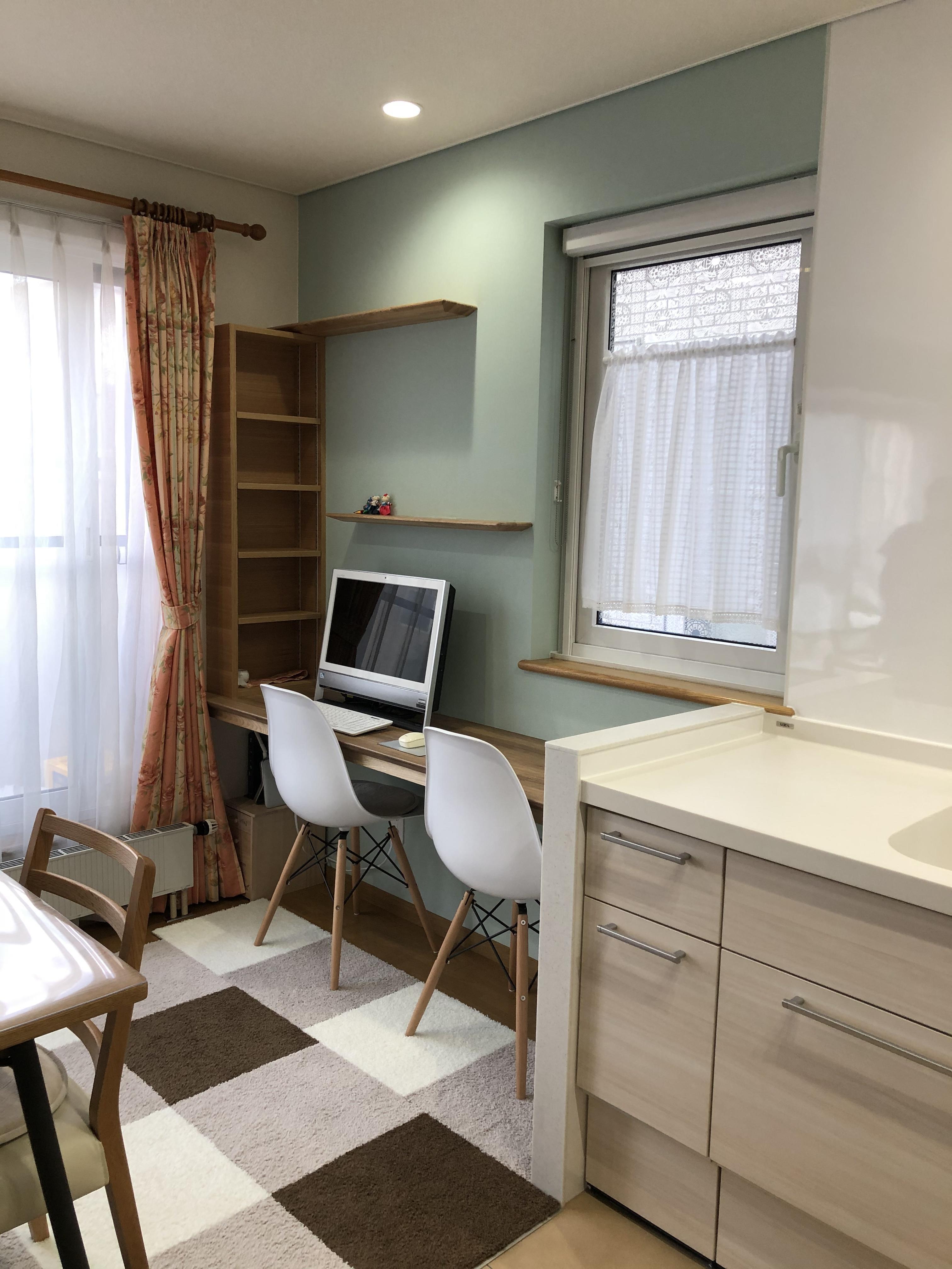 ダイニングキッチンに隣接して設置したカウンターデスクは家族の誰でもが自由に使うことができ、 趣味・勉強・仕事等、どの場面でも活躍しそうです。 奥様と娘さんがそれぞれの時間を同じ空間で過ごせるのも今回のリフォームで生まれた価値の一つですね!