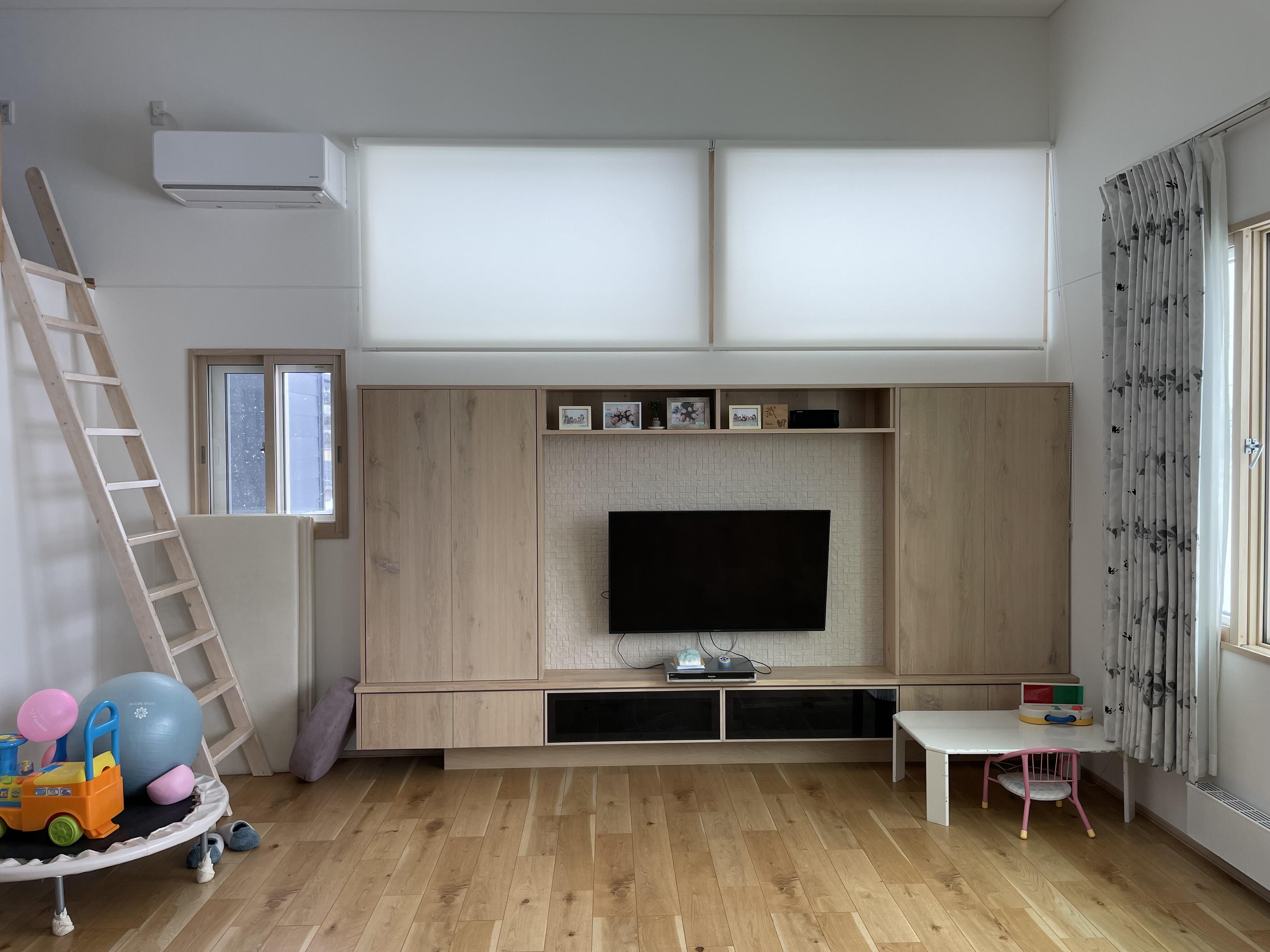 テレビ廻りの収納を造り替えて、フルカウンターの一部を子供たちの勉強スペースも兼ねた気持ちのいい場所にしました。