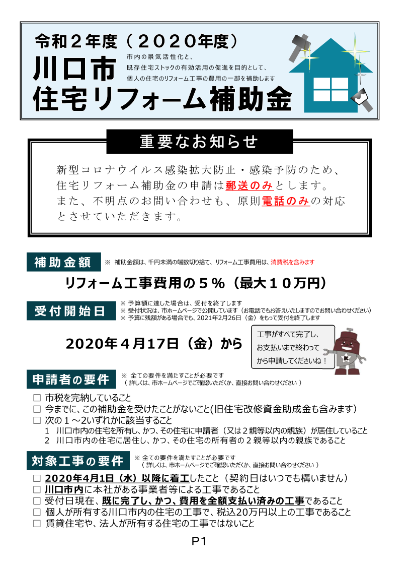 川口市ホームページ「(郵送のみ)【4月17日から受付】川口市住宅リフォーム補助金」
