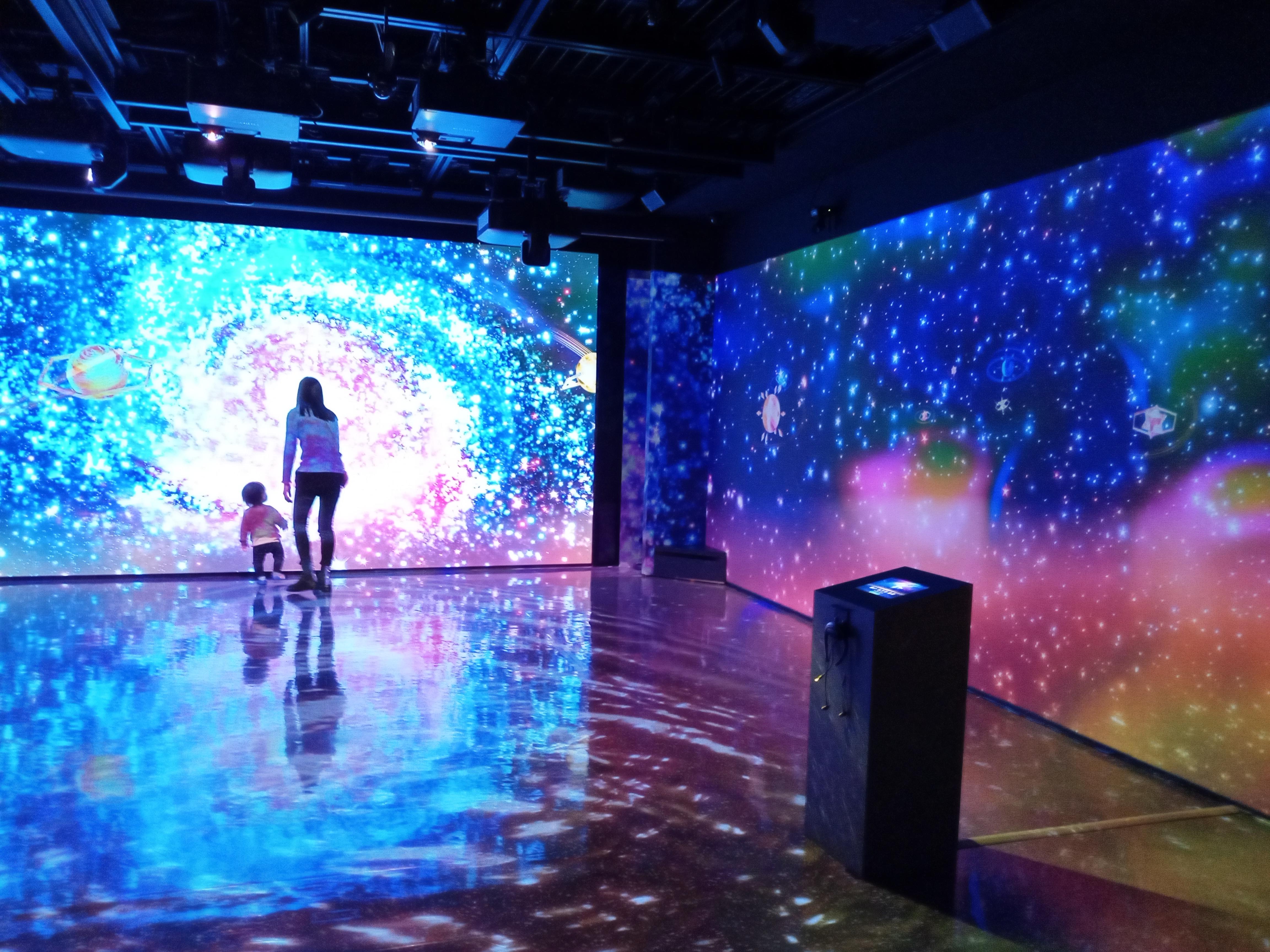 キレイな宇宙空間を表現したスペースで、イヤフォンみたいなものを頭につけて、