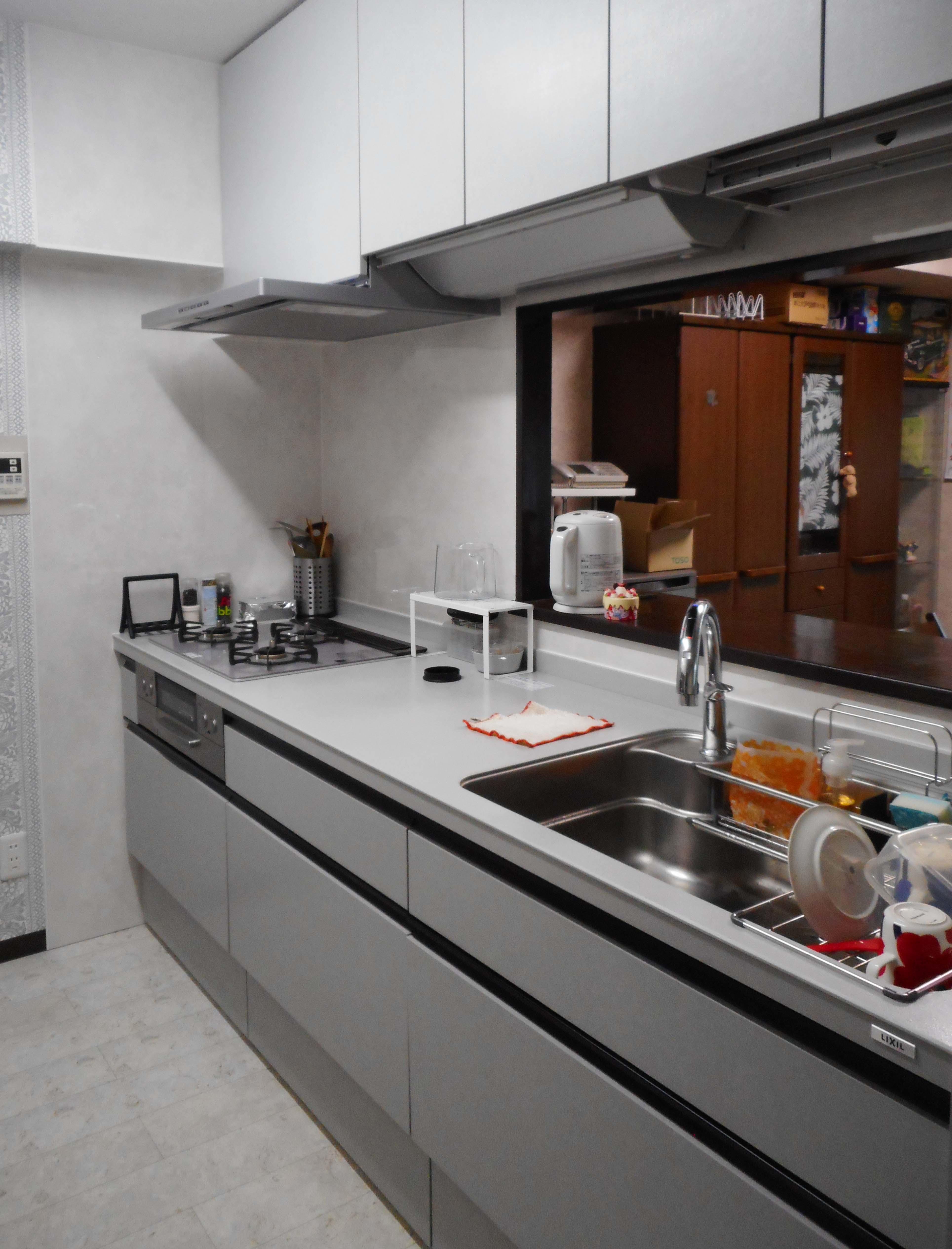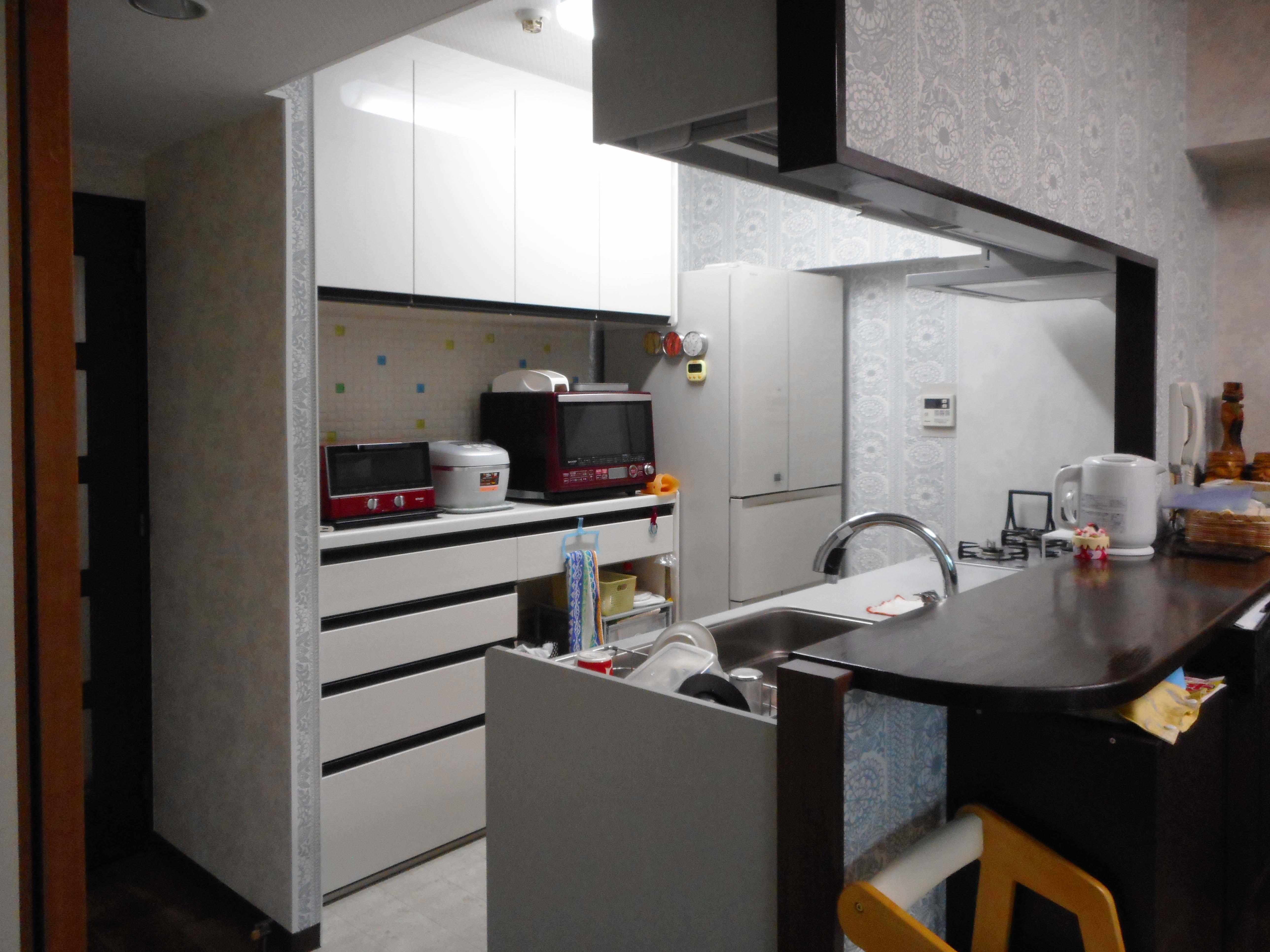 暮らしやすい環境にあるマンションですが、築年数もたつと設備機器もいたんできますので、交換と内装の一新をされることとなりました。 とてもご家族の仲もよく、全員で話し合いながら計画を進めていきました。 キッチン周りは壁も一部撤去して解放感を出し、床もリビング全体までフローリングを上張りし雰囲気を上げています。