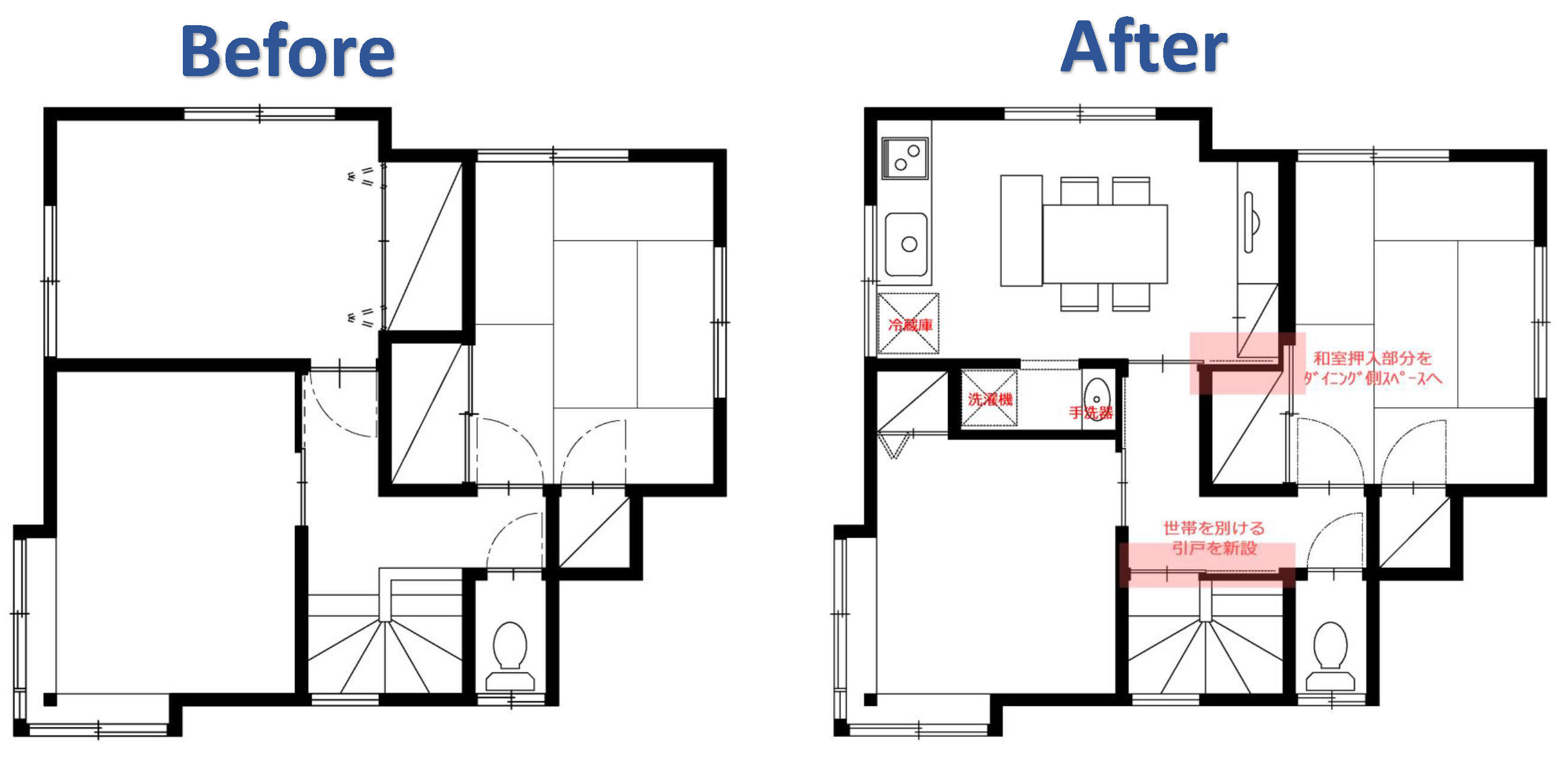 3部屋の個室であった2階部分で、新たに息子様世帯が独立した生活を営めるようにする計画でした。
