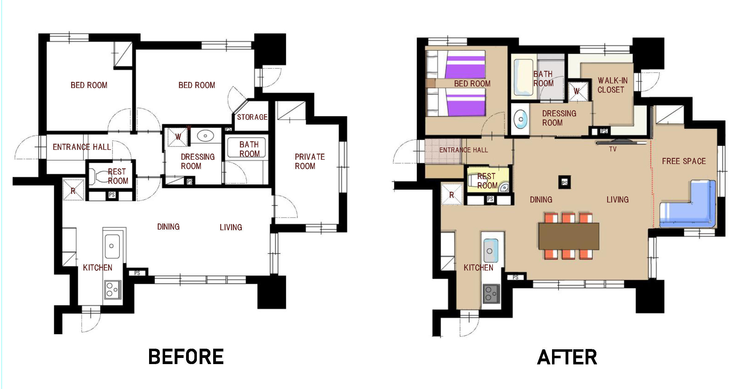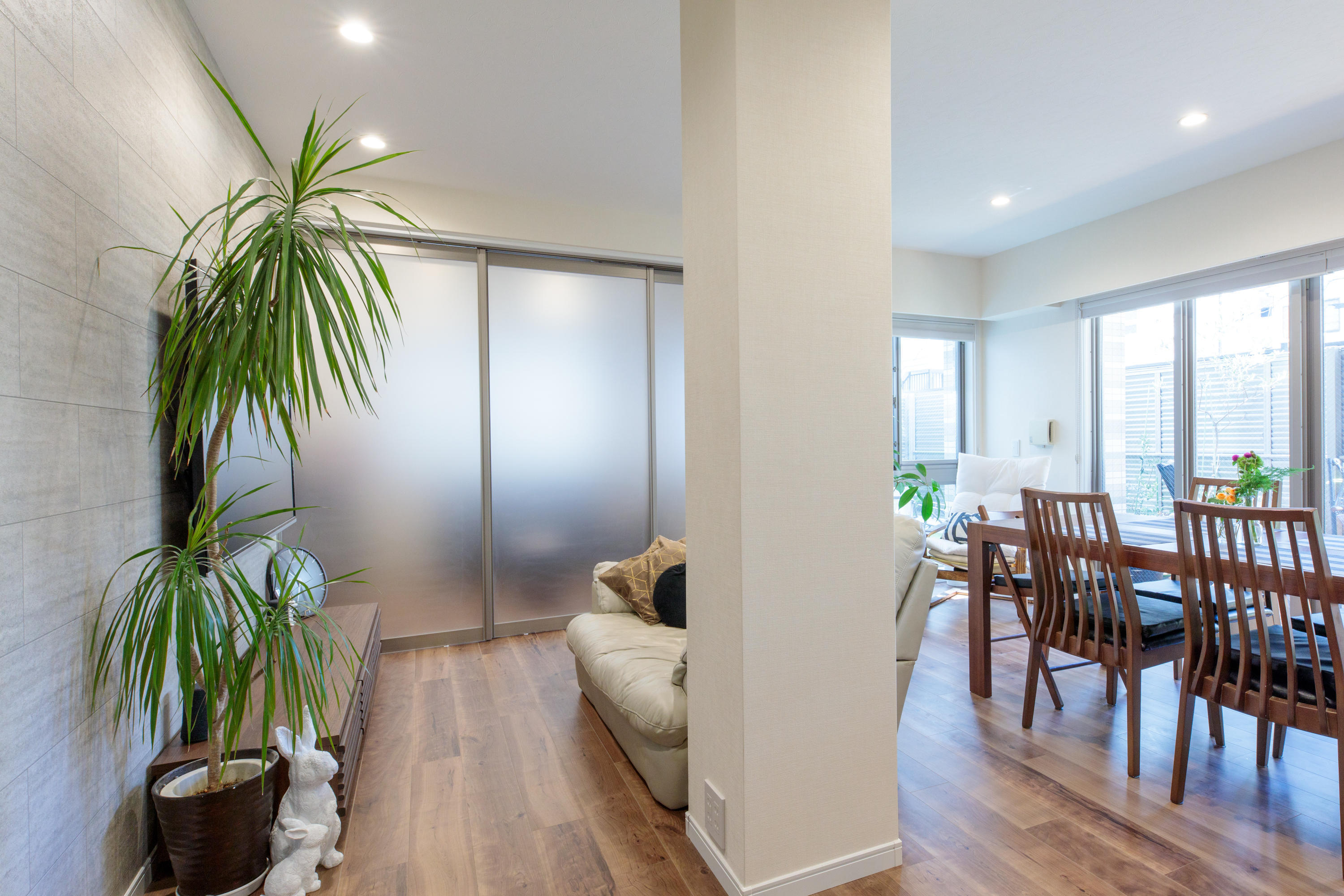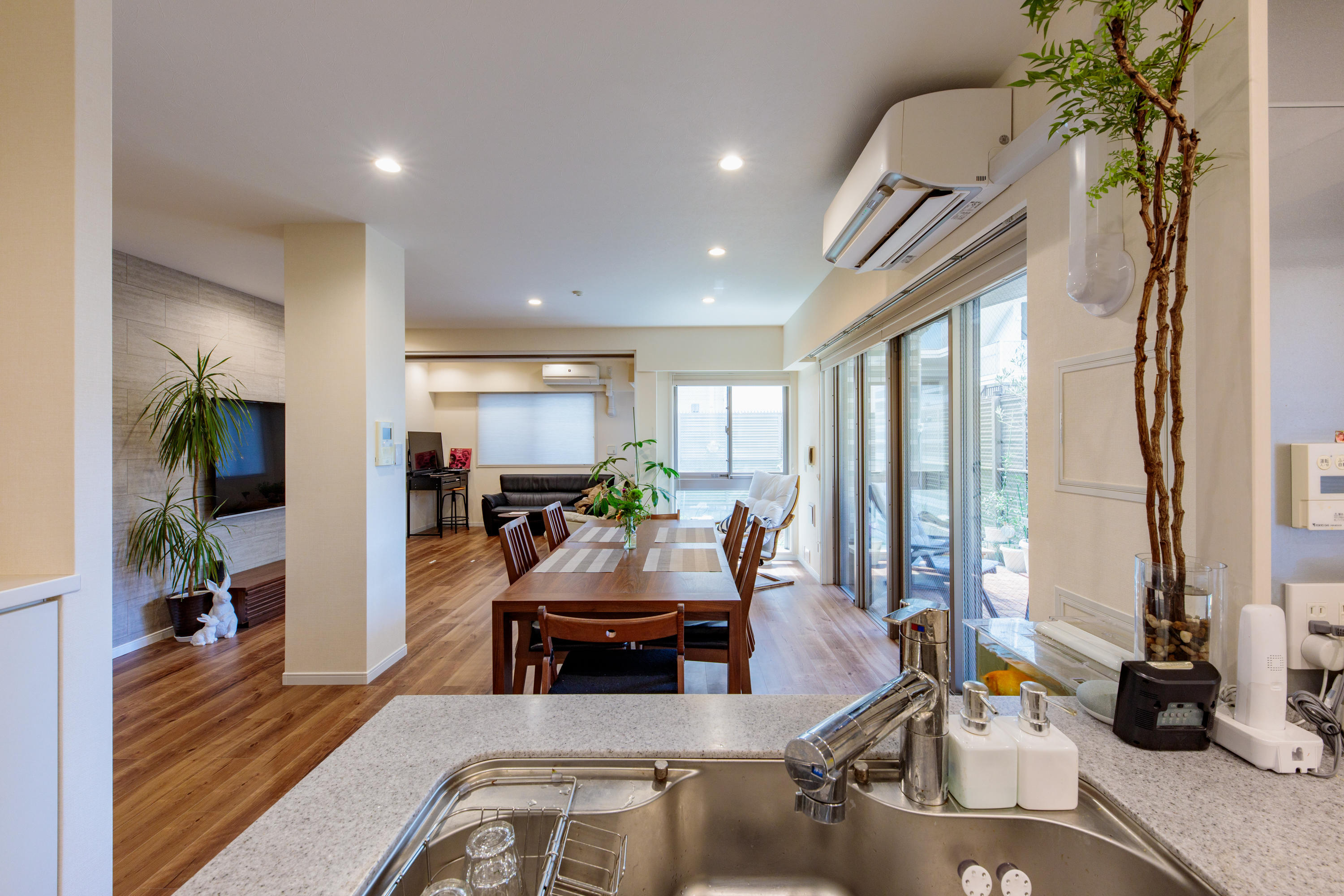 駅近で1階にあるマンションは、庭もあり明るい立地であることは満足していました。ただ、今の2人の生活では、部屋数が多いのが活かせないと考えていました。そこを減らしてリビングを広げたいと思いましたが、サニタリーが間取りの中心にあり、他の施工店さんでは無理だと言われていました。