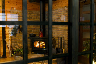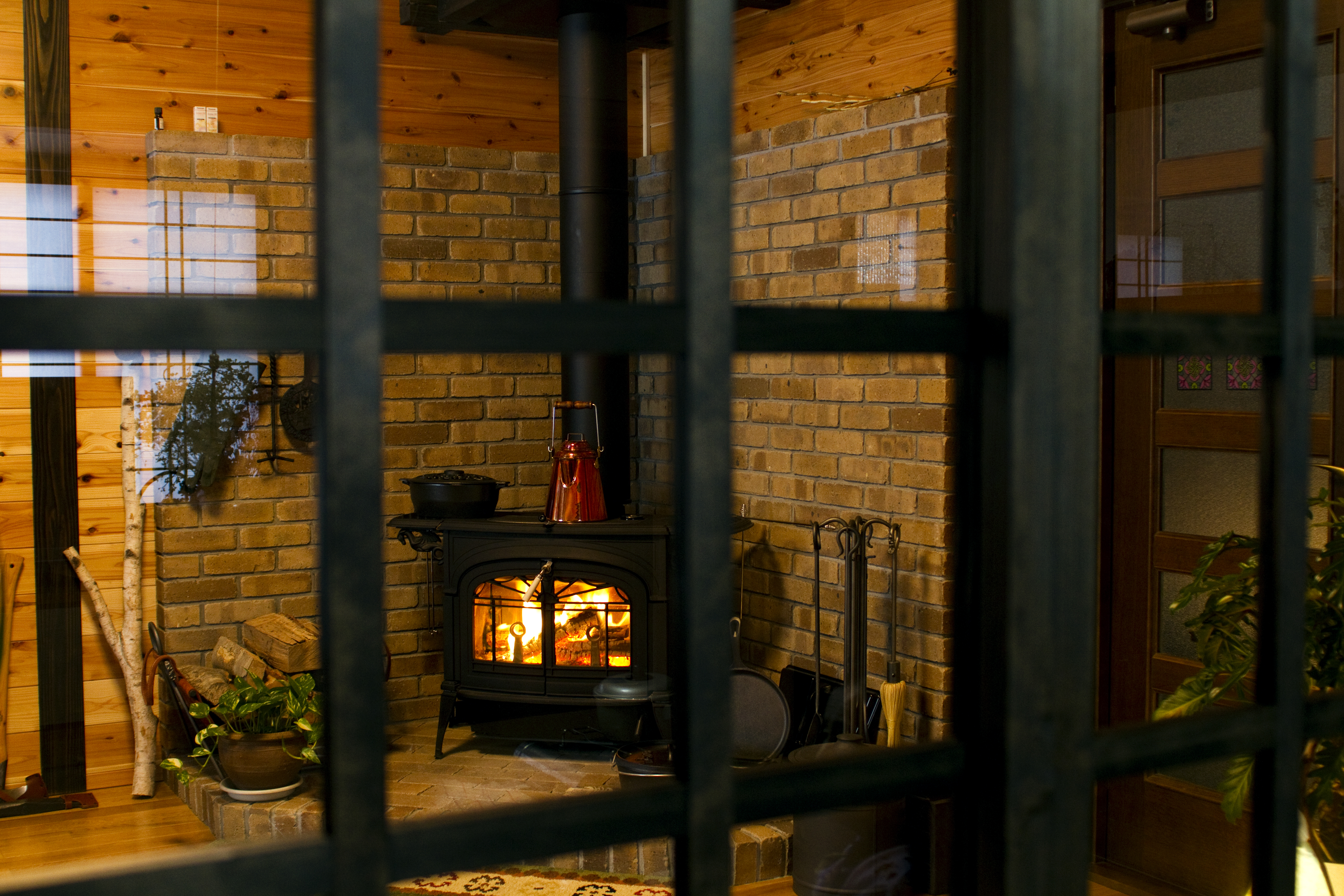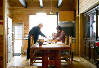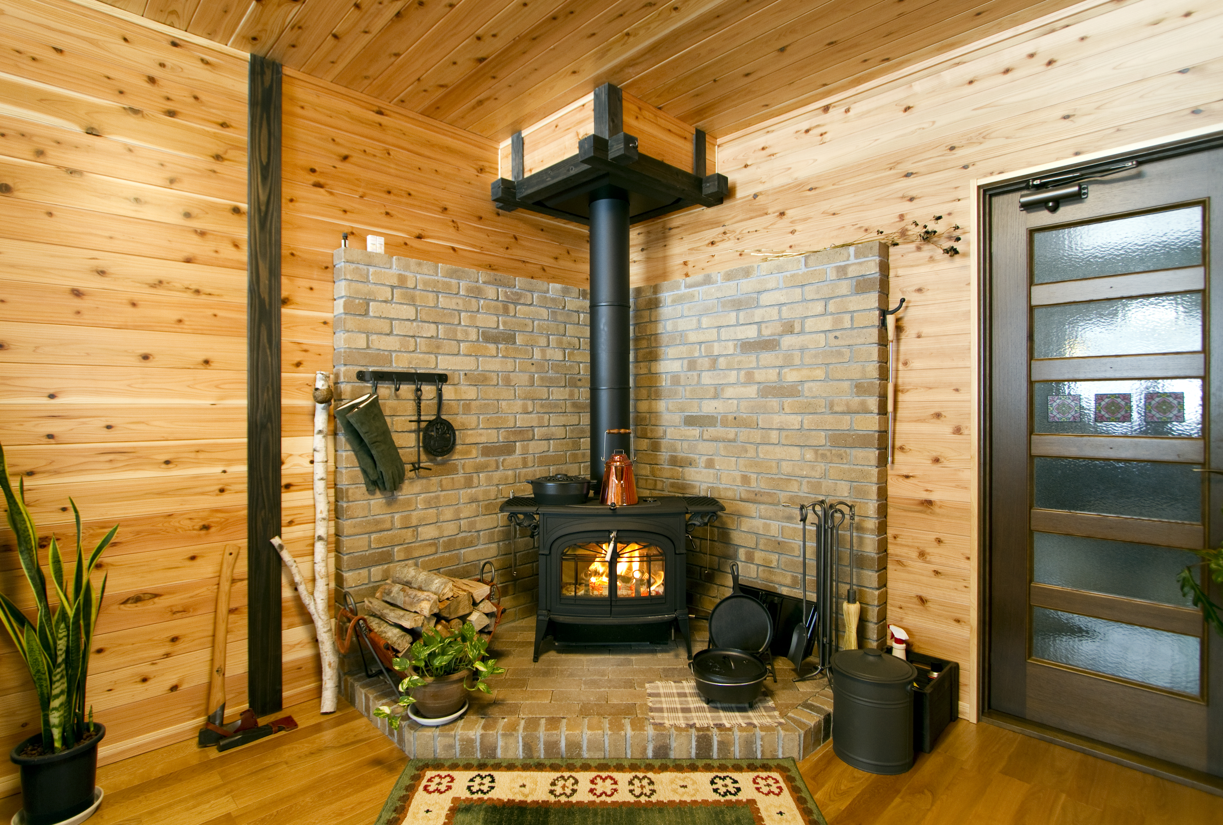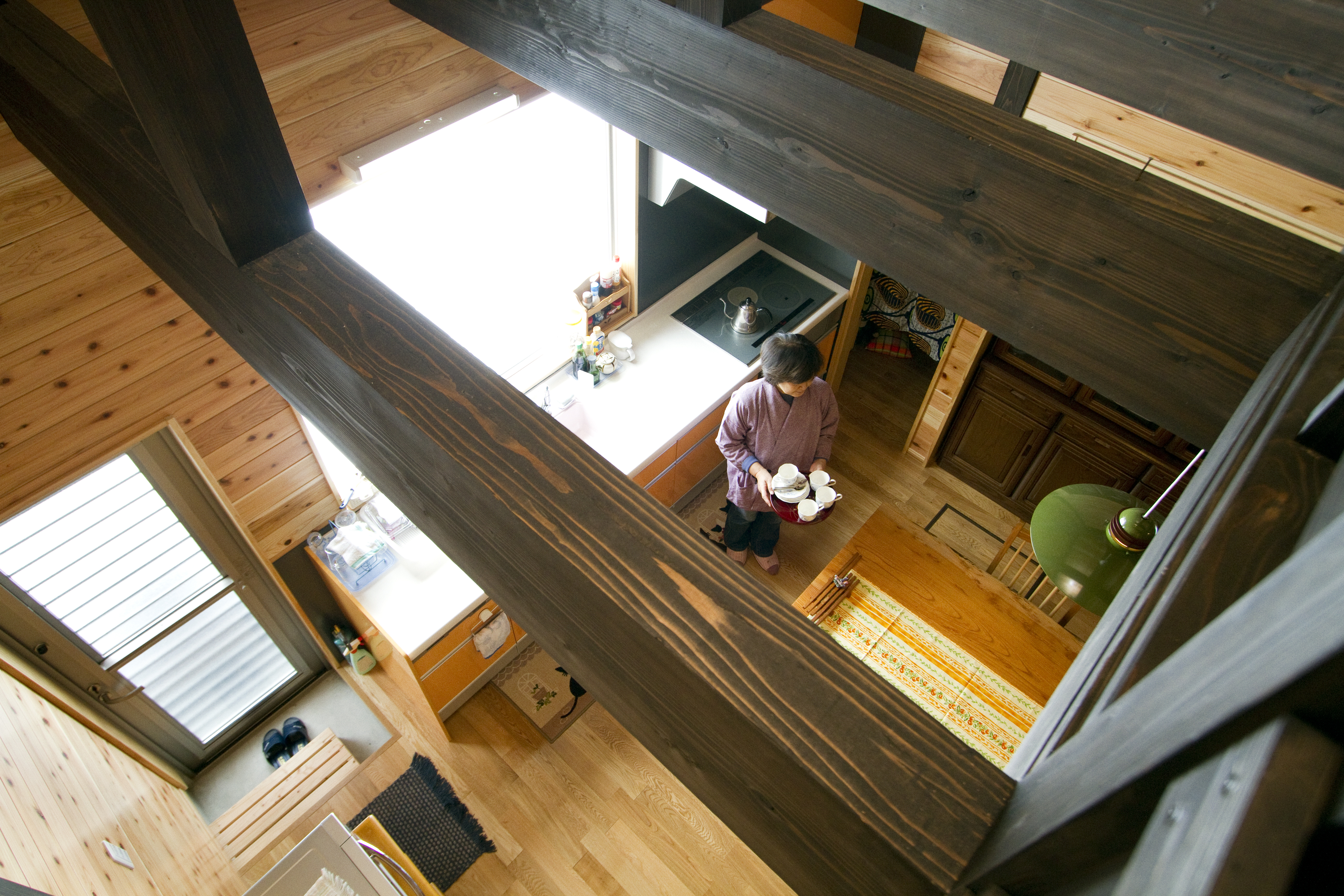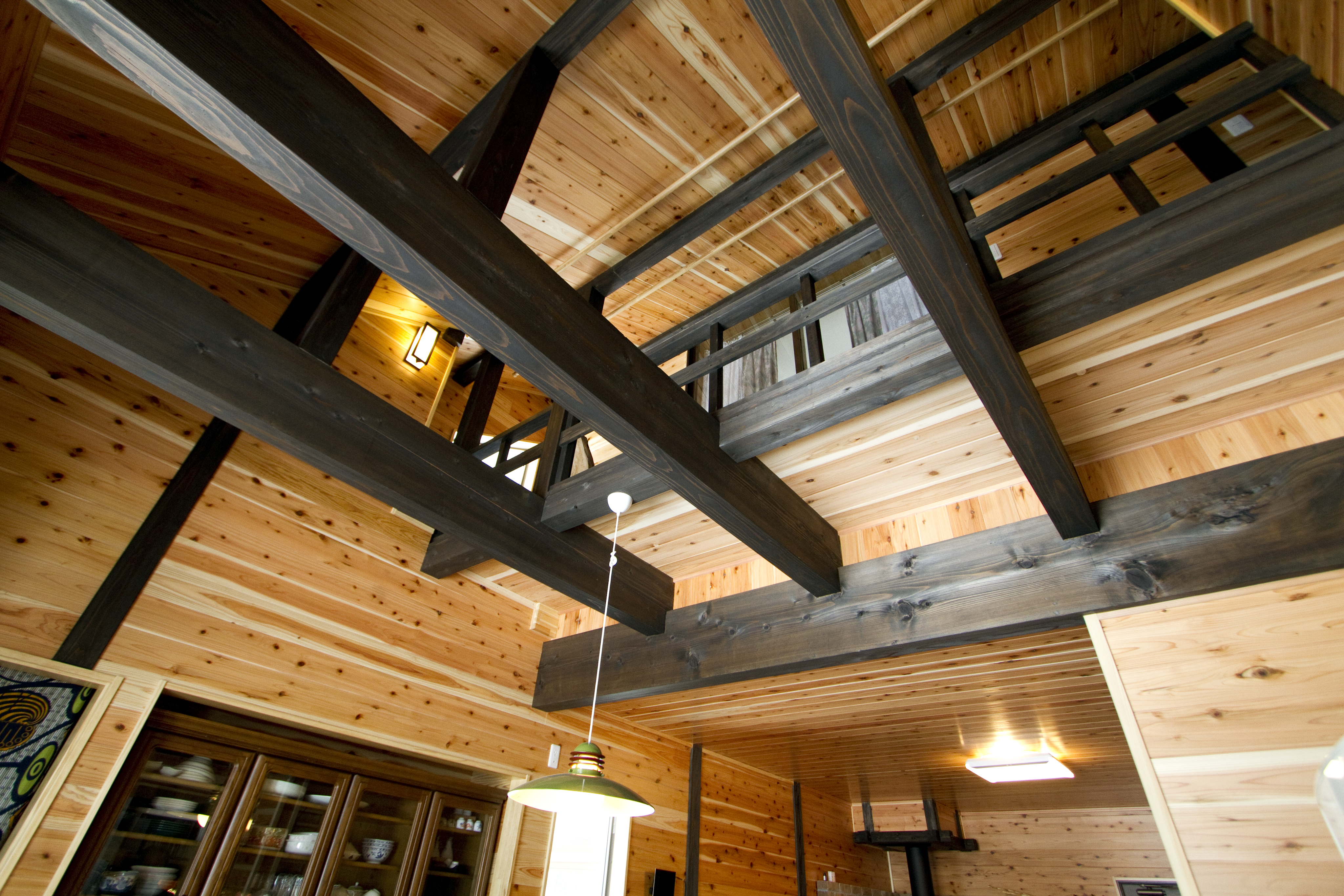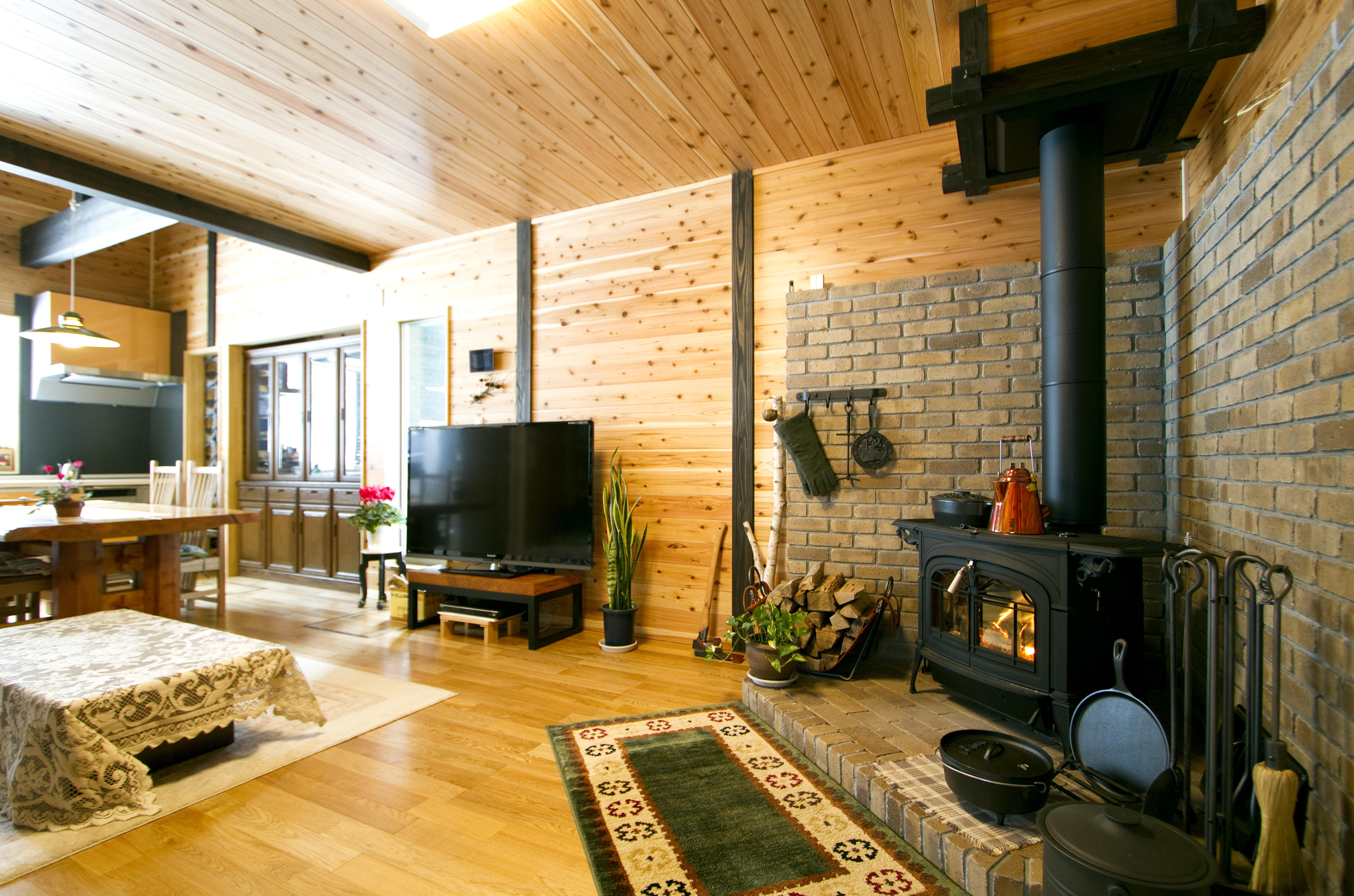 LDKを山小屋を連想させるような杉板貼りで仕上げ、暮らし楽しくを設計コンセプトに薪ストーブを中心に設置しました。さらにキッチン上部は吹き抜けとし、古い梁を化粧で見せ、明るく開放的な空間が出来上がりました。