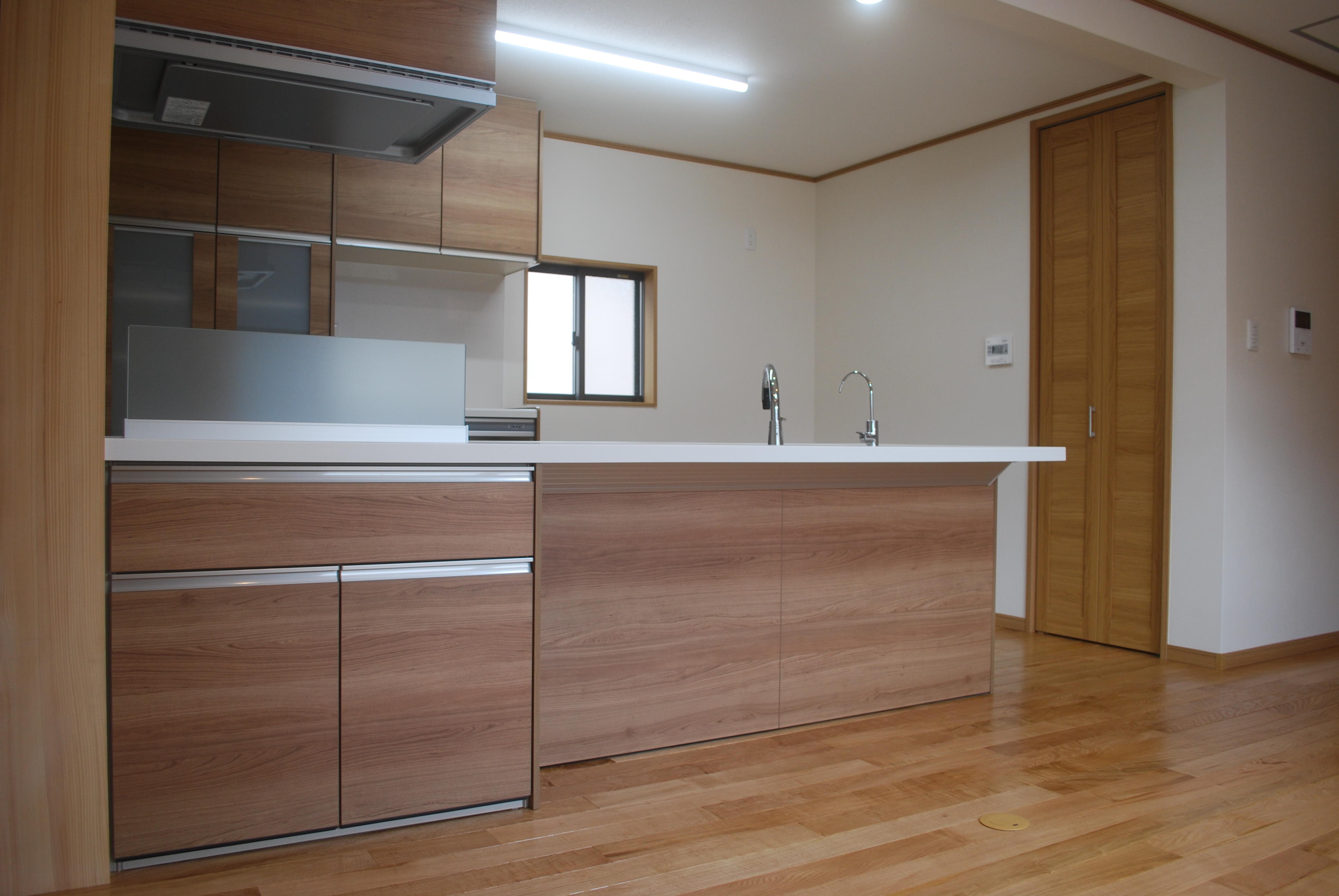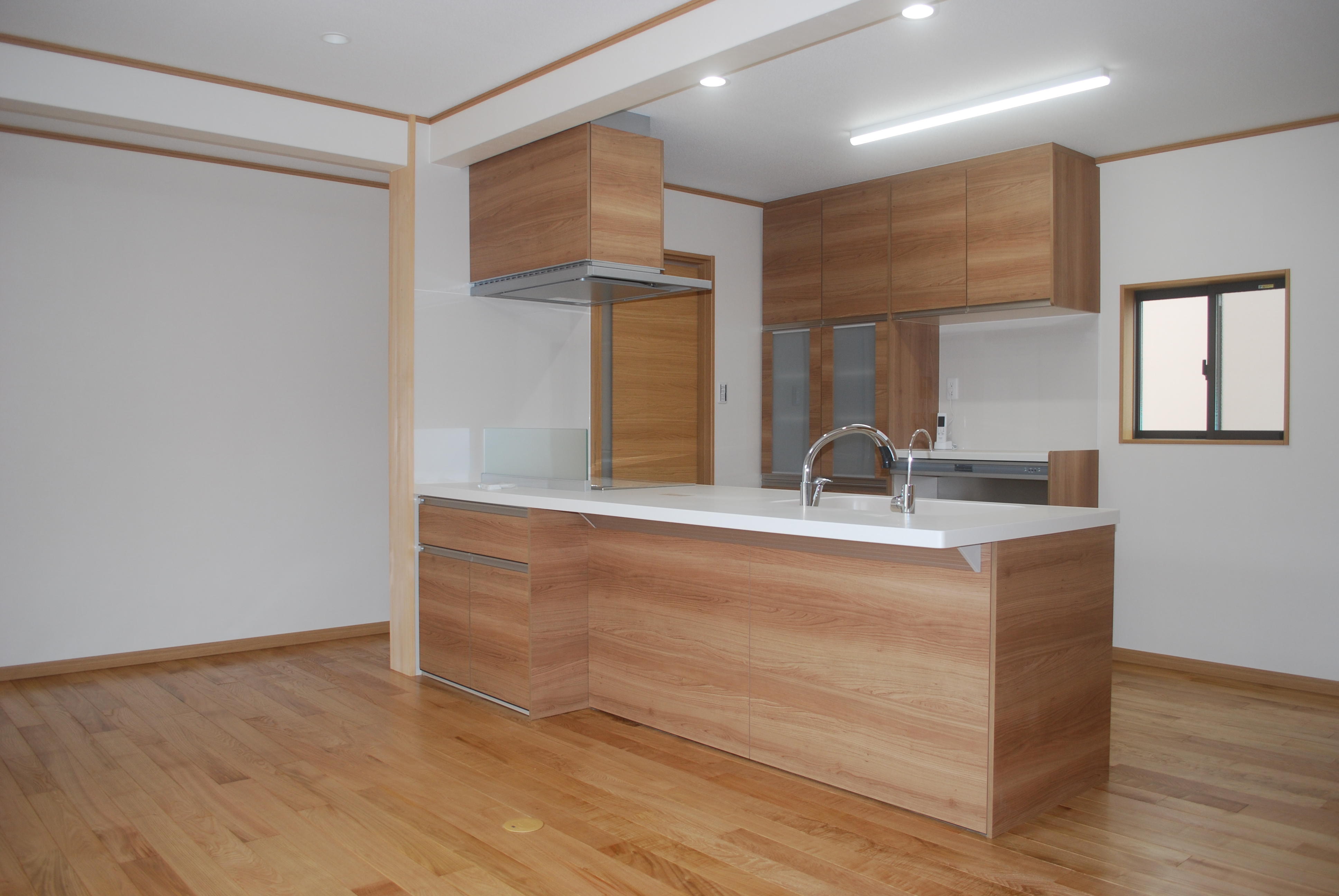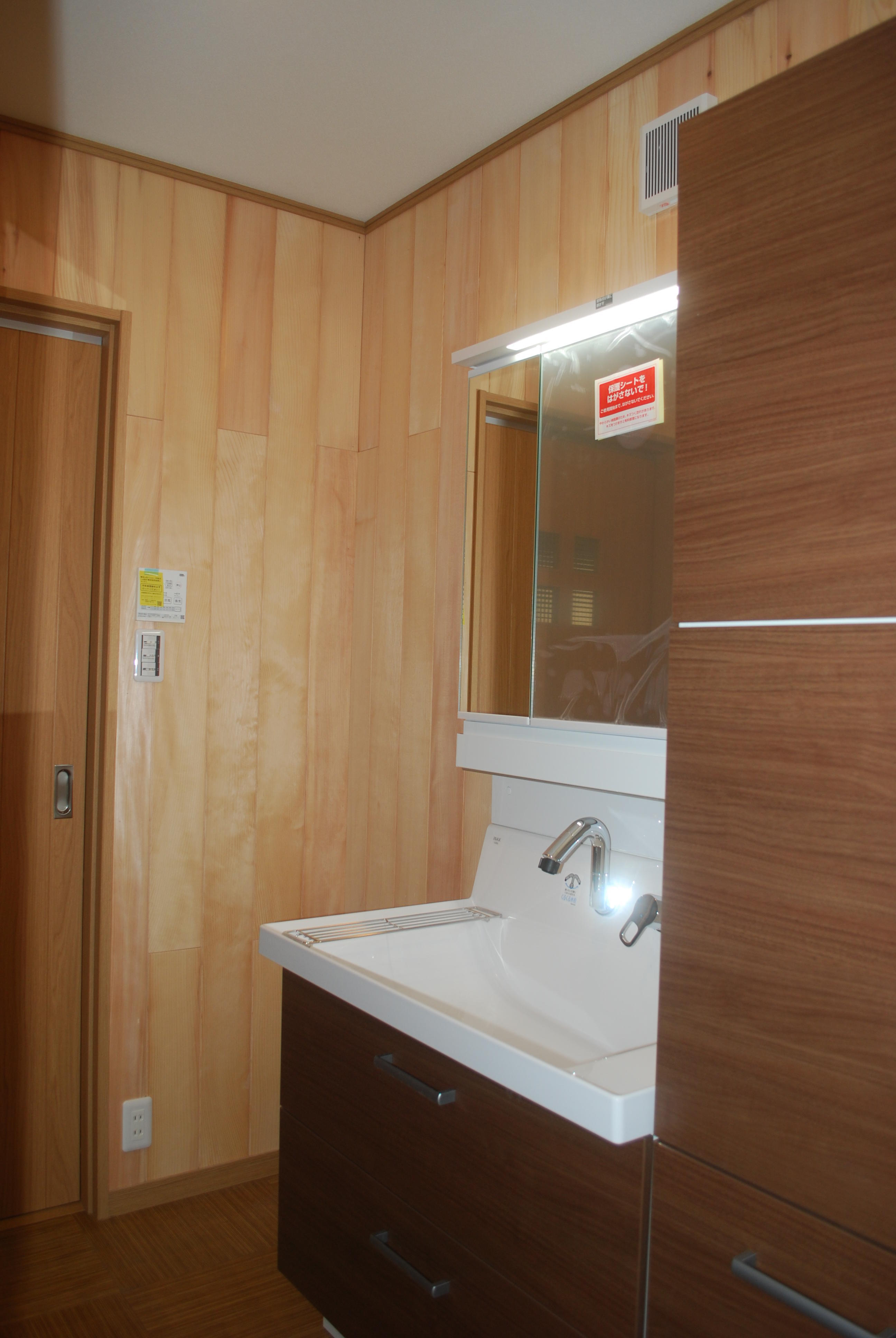 本体900㍉にサイド収納300㍉をプラスしました。壁には当社オリジナルで加工した唐桧を貼りました。